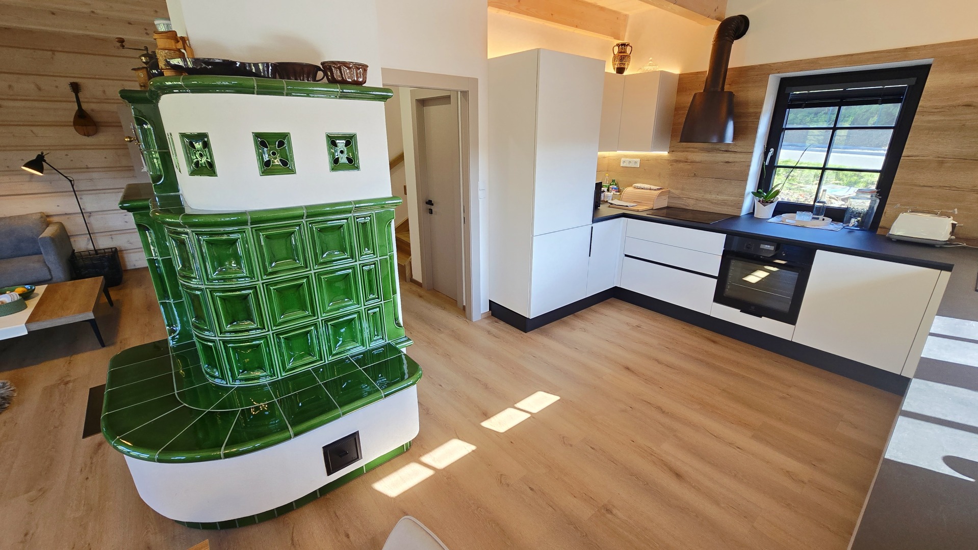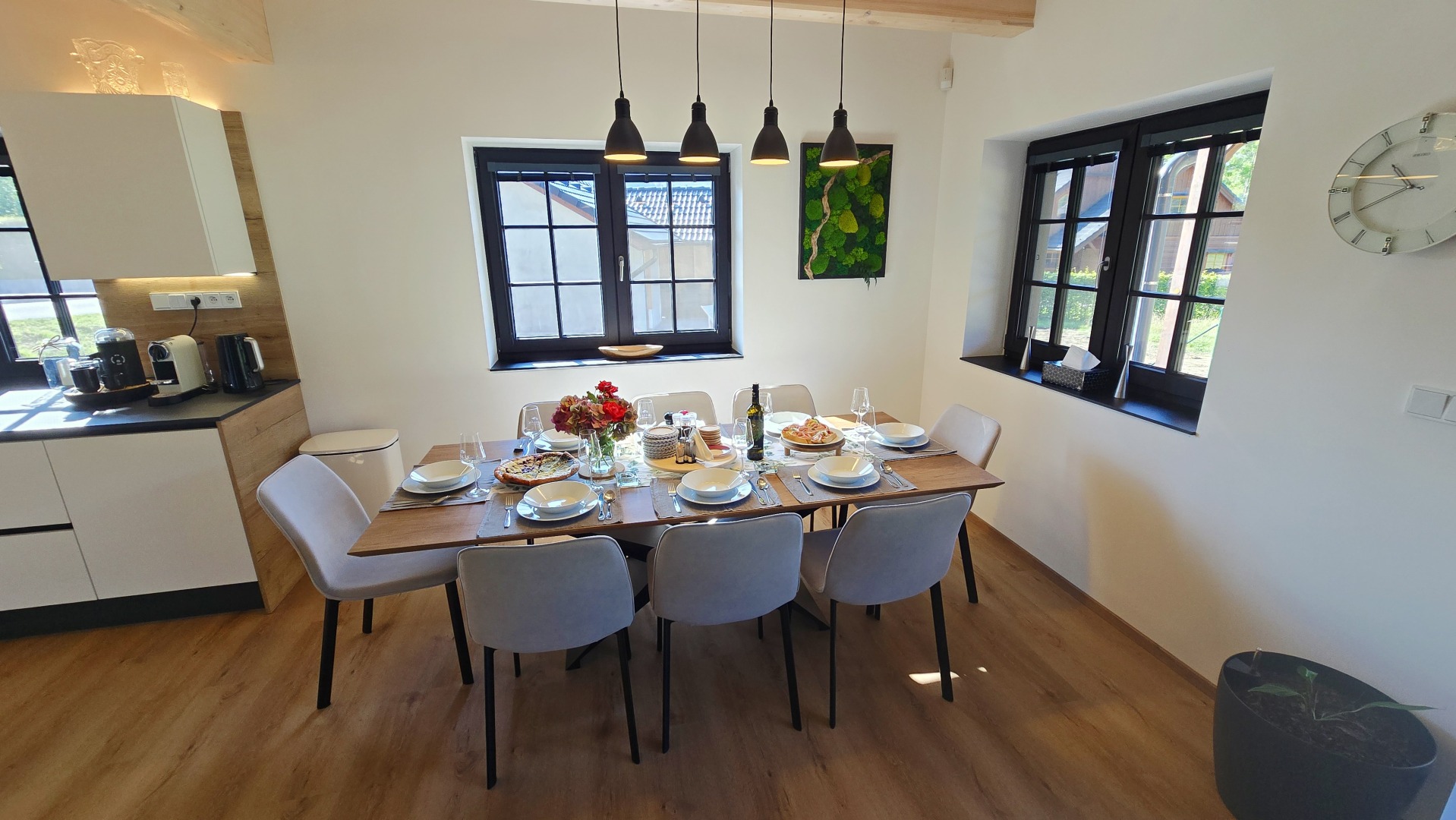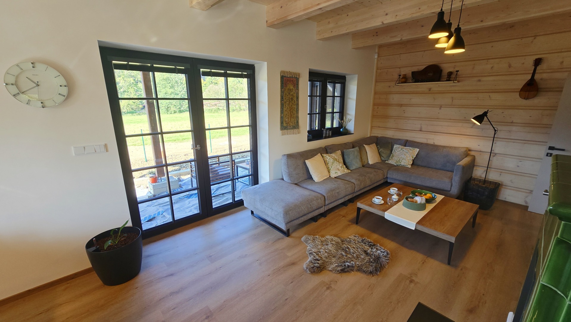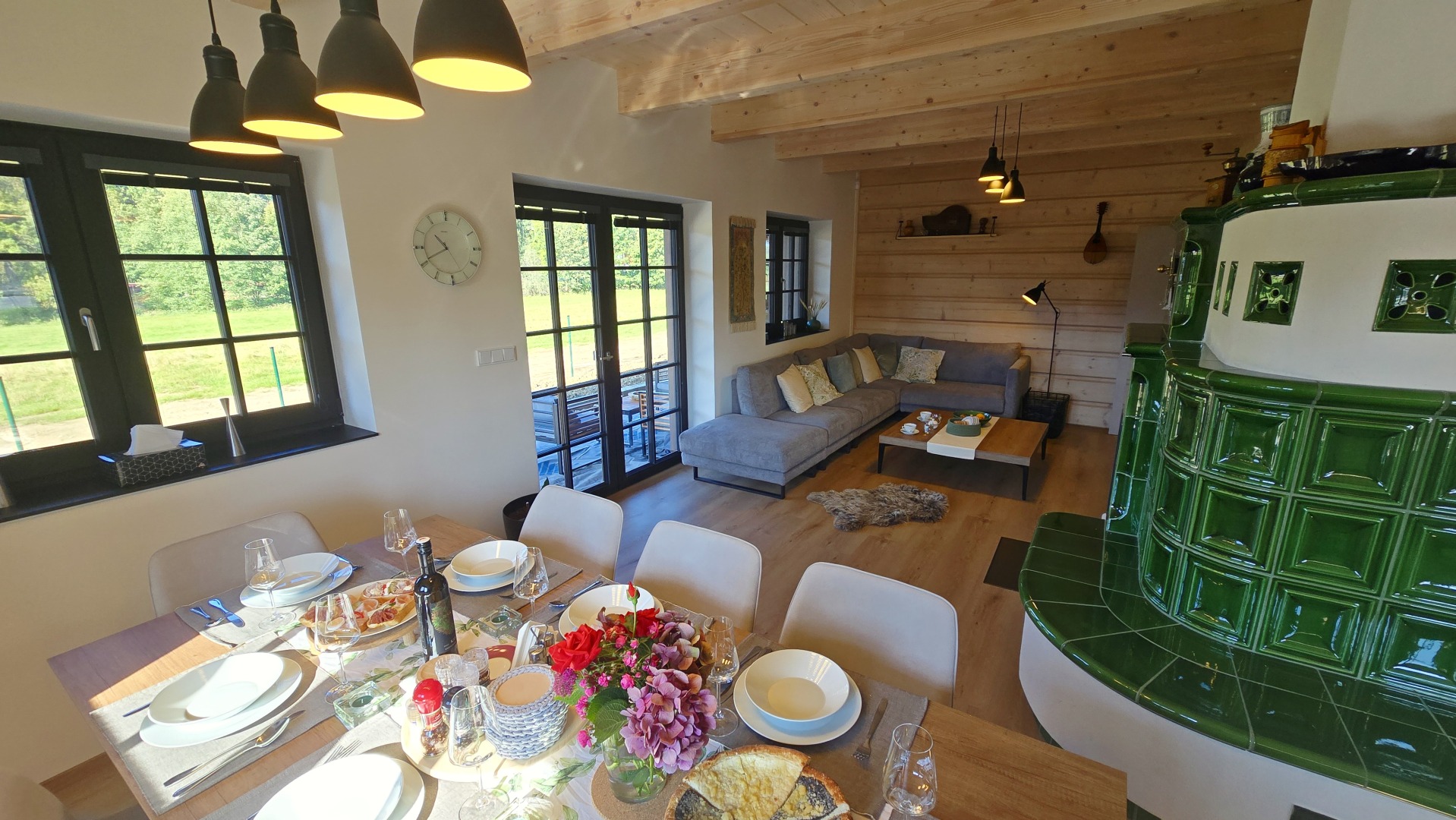- obývací pokoj s jídelním stolem, kachlovými kamny, Smart TV (apple TV, Blu-ray, HIFI DENON, Internetové rádio saudbar, repro palk) a se vstupem na zastřešenou osvětlenou terasu s lounge posezením