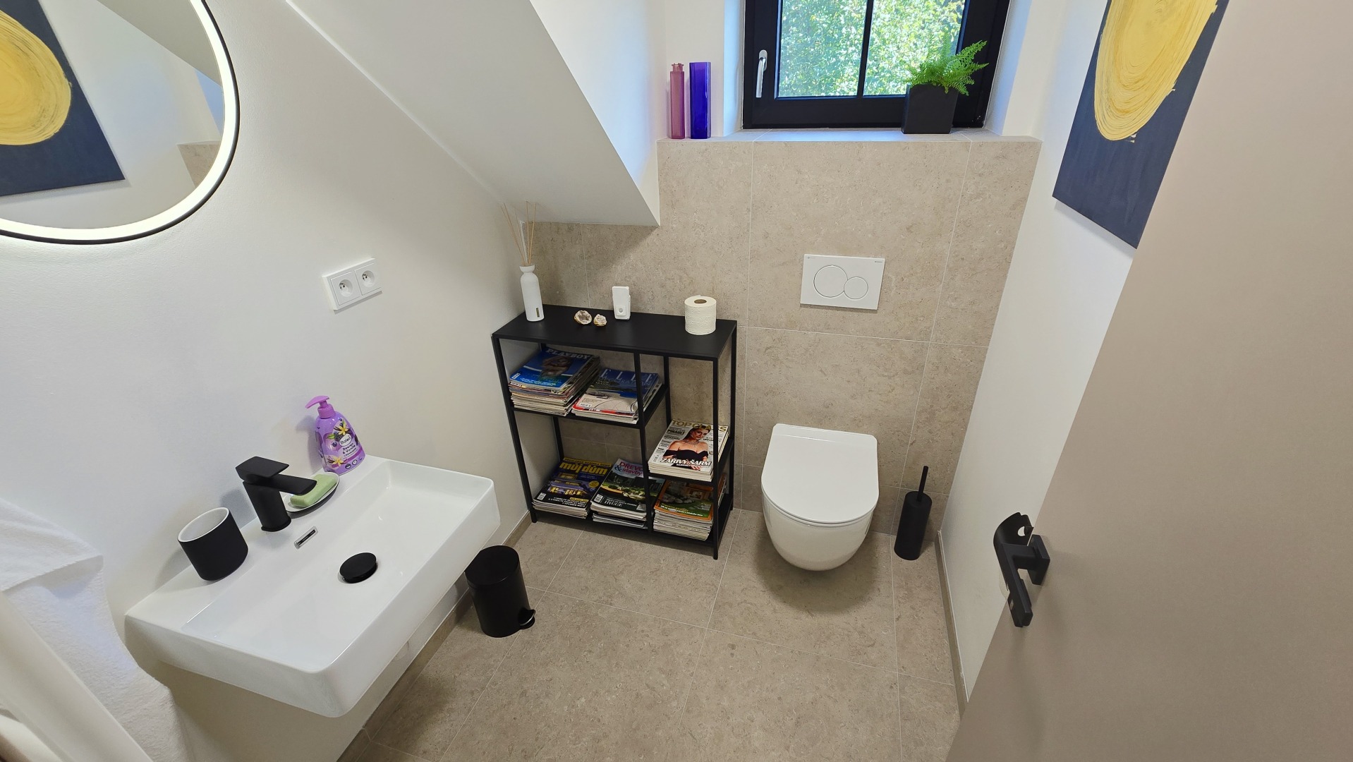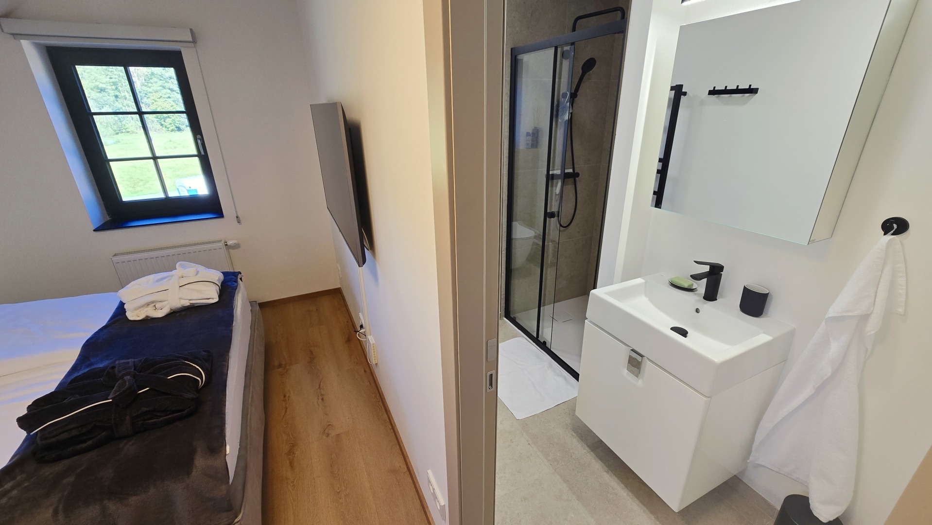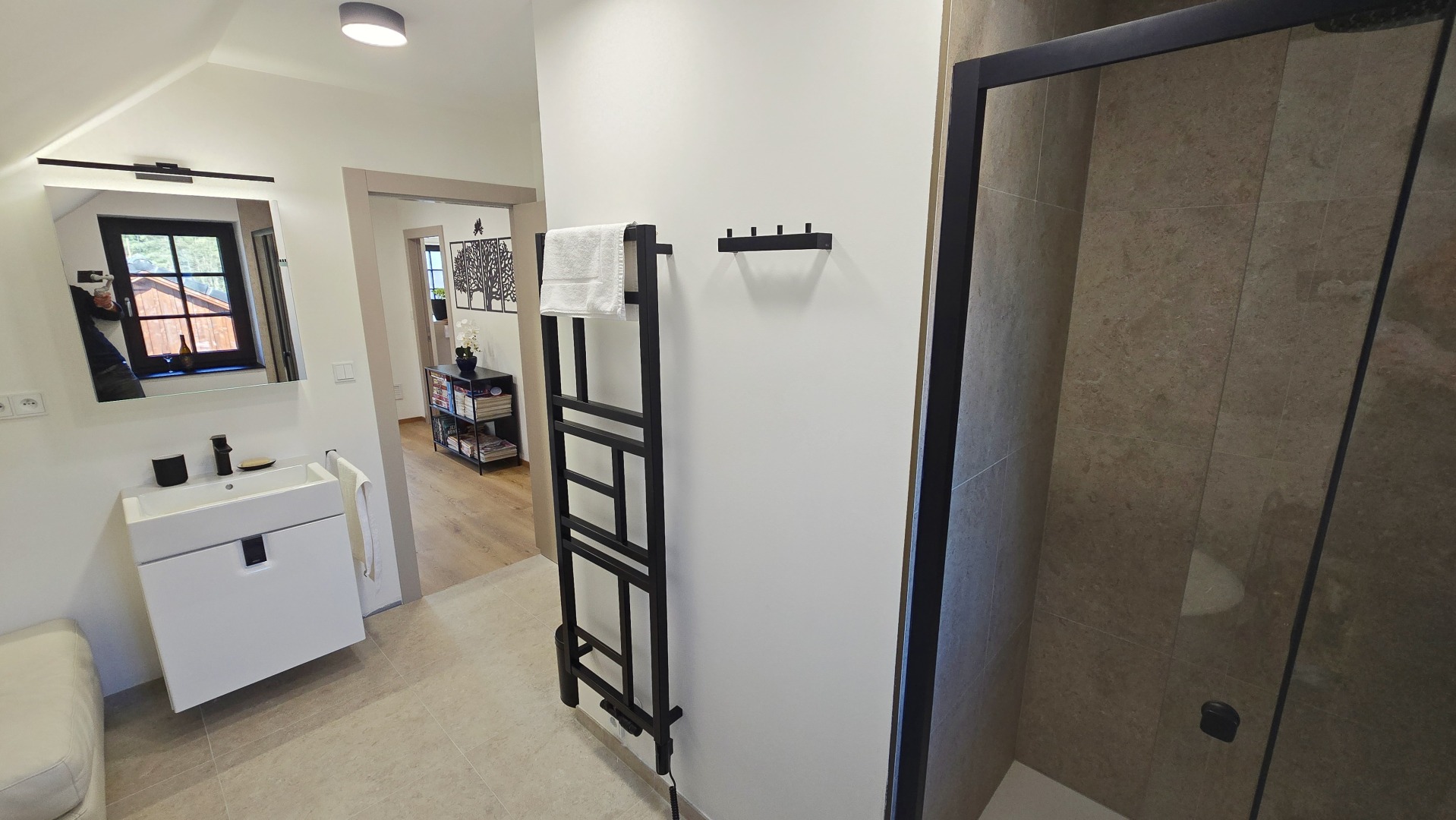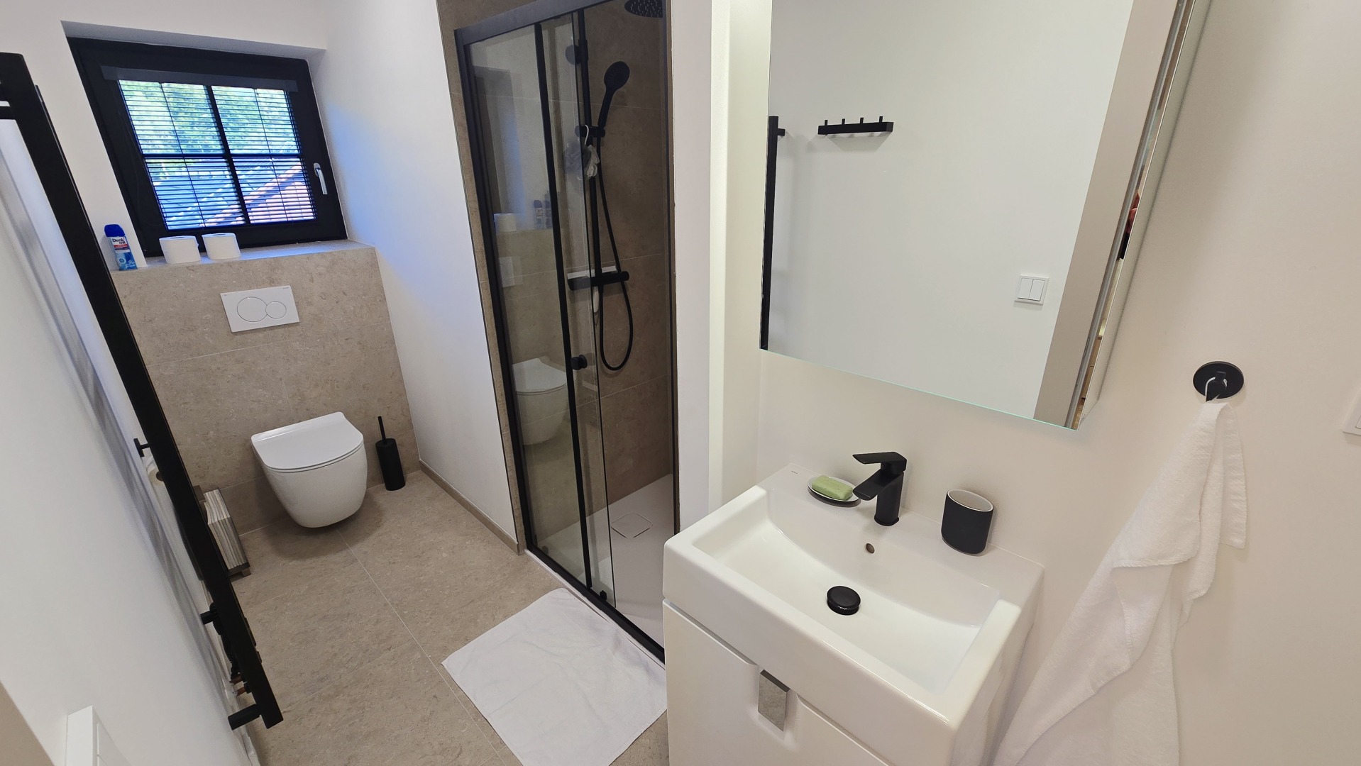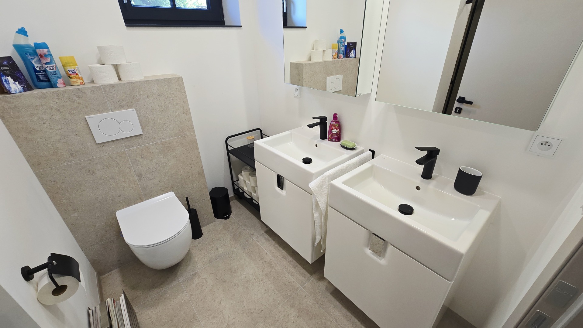 - 1x koupelna se sprchovým koutem, WC a 2 umyvadly
