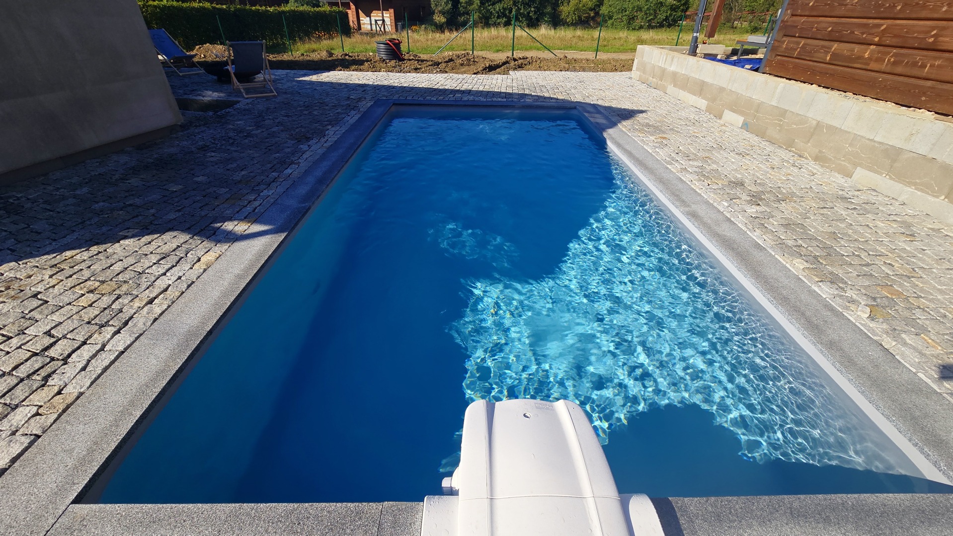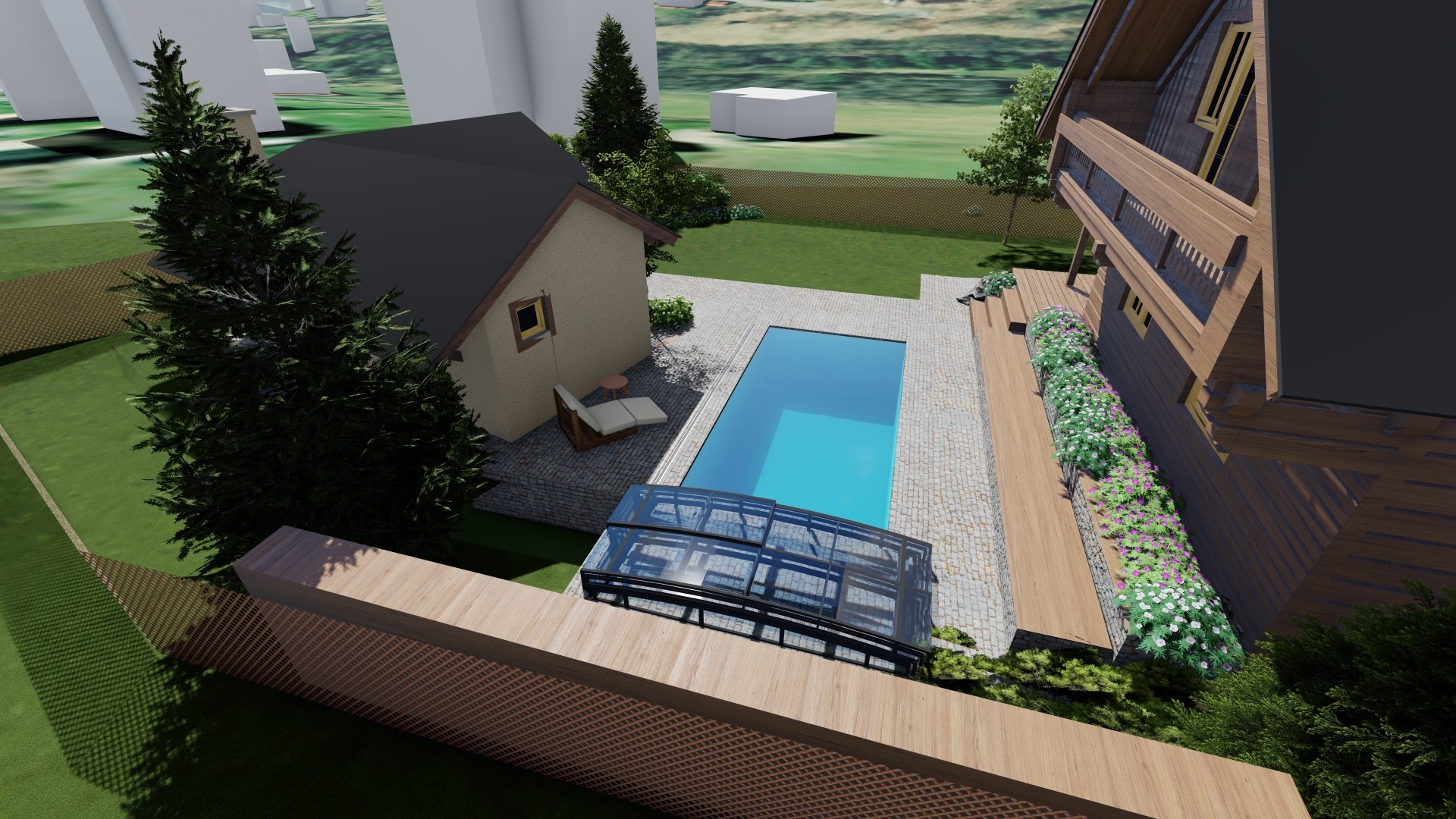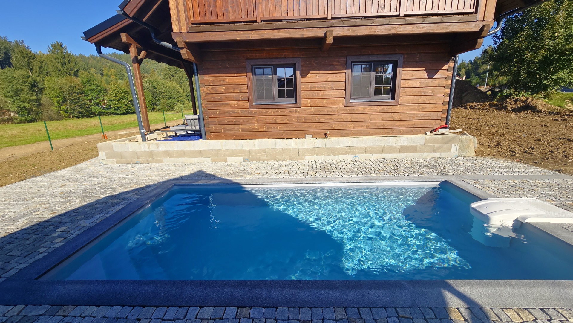 - venkovní, zapuštěný, zastřešený, osvětlený a vyhřívaný (tepelné čerpadlo, chlazení topením) bazén 6x3 m se slanou vodou