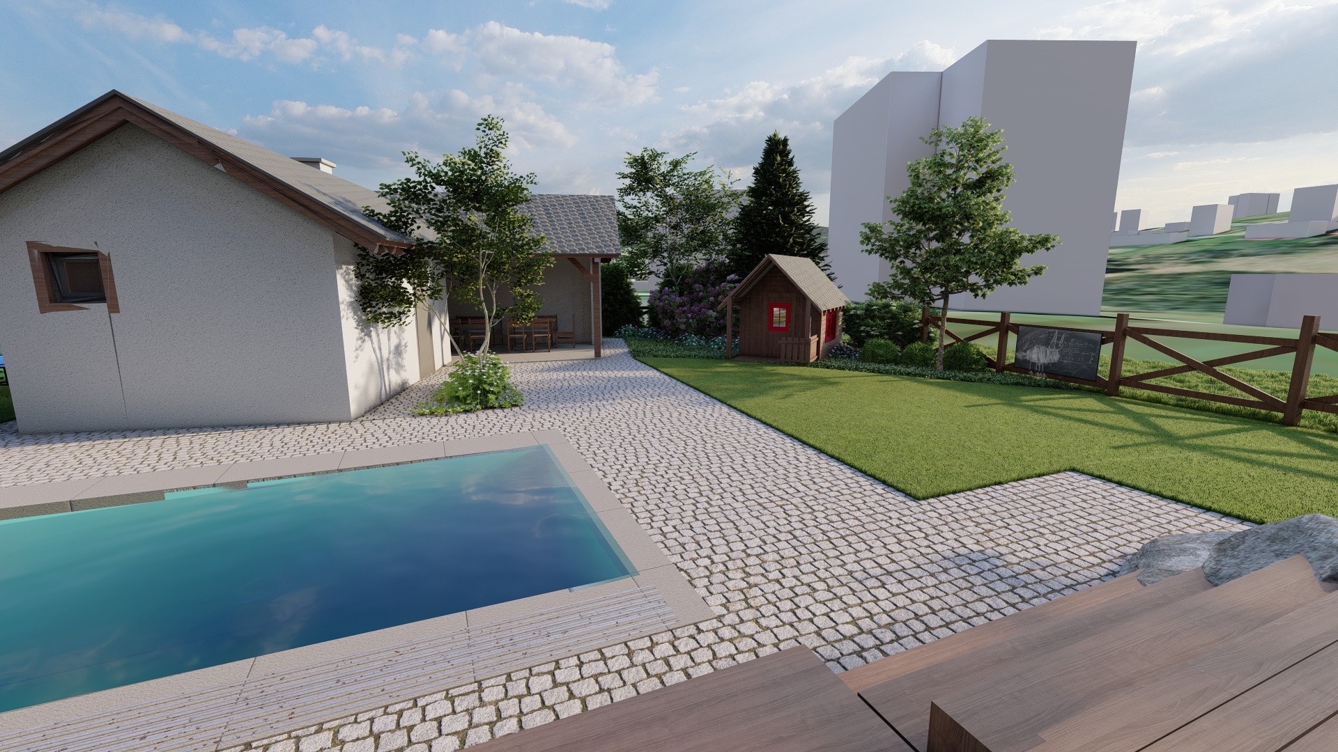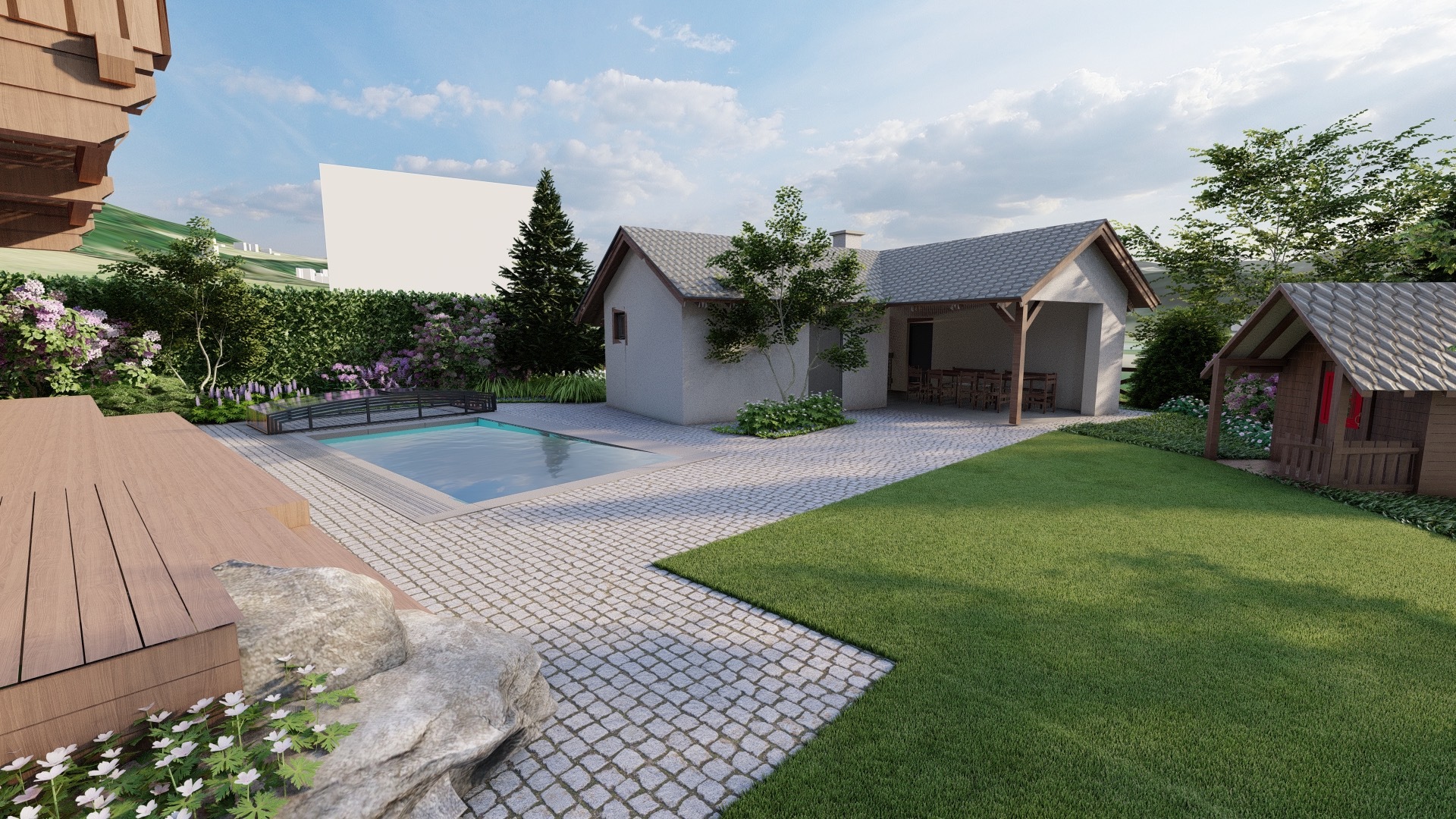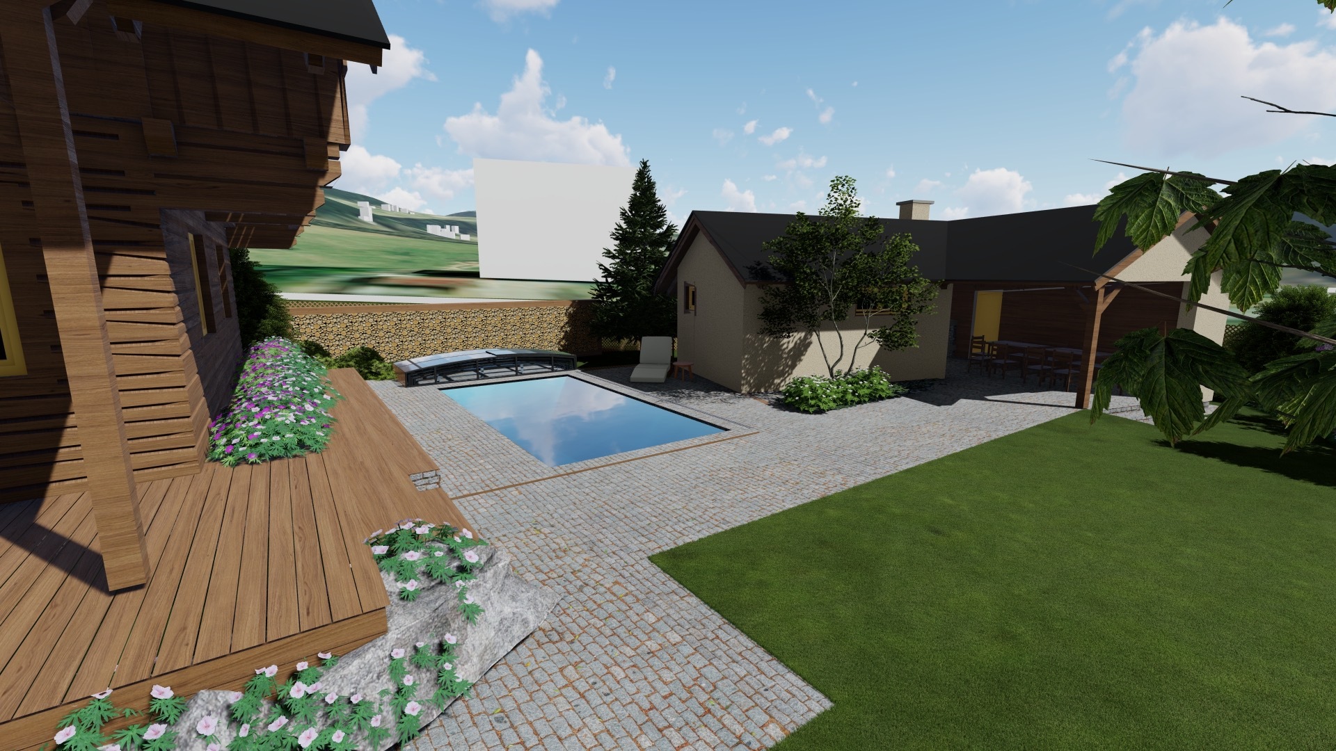 - venkovní, zapuštěný, zastřešený, osvětlený a vyhřívaný (tepelné čerpadlo, chlazení topením) bazén 6x3 m se slanou vodou