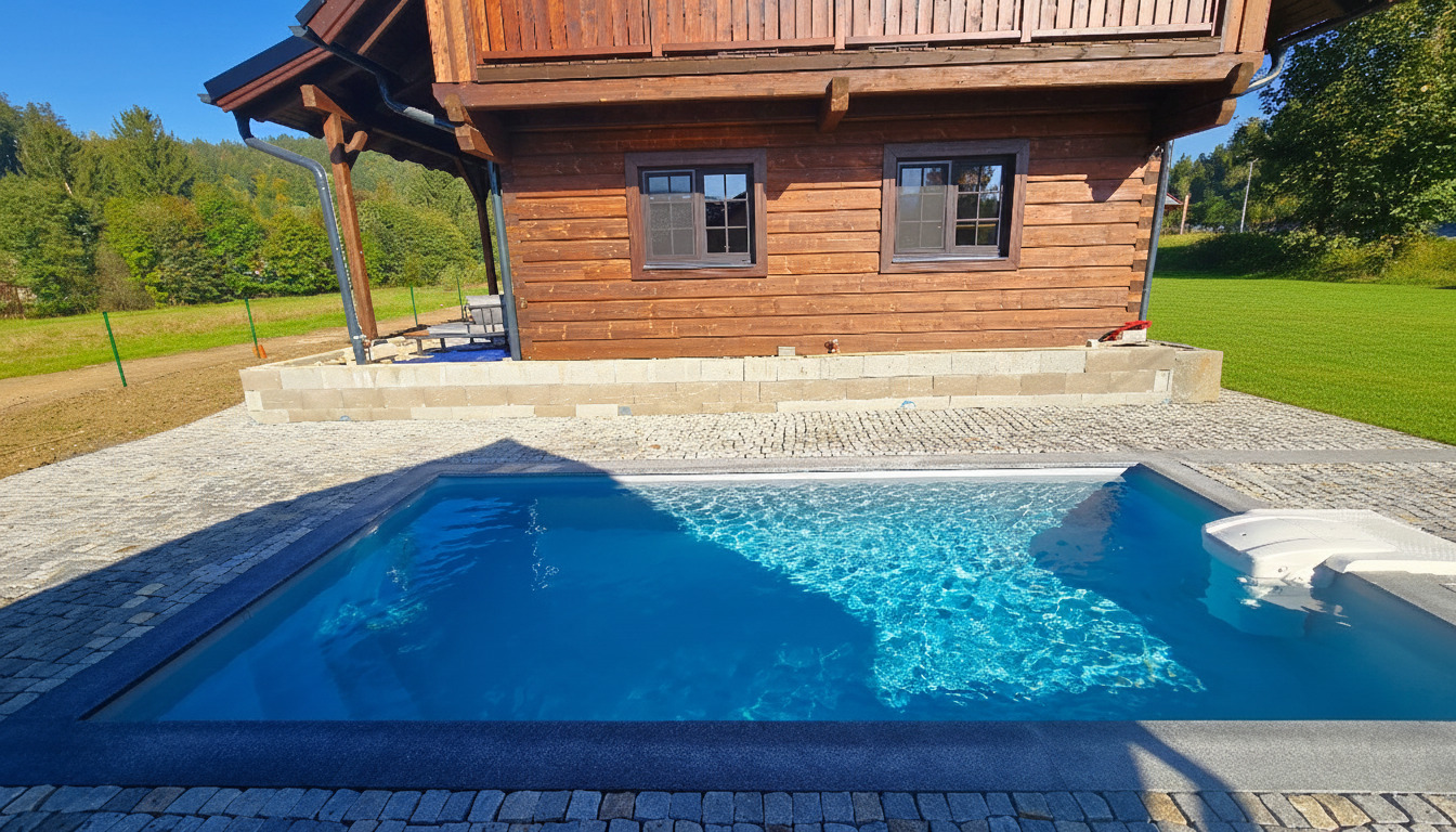 - venkovní, zapuštěný, zastřešený, osvětlený a vyhřívaný (tepelné čerpadlo, chlazení topením) bazén 6x3 m se slanou vodou