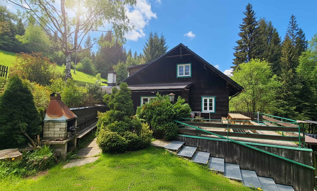 Atraktivní dřevěná chalupa s masážním bazénem SPA, krytým vyhřívaným bazénem se slanou vodou a saunou u lesa, v rekreační oblasti pod Lysou horou, 3 km od SKI areálu Zlatník v Moravskoslezských Beskydech.