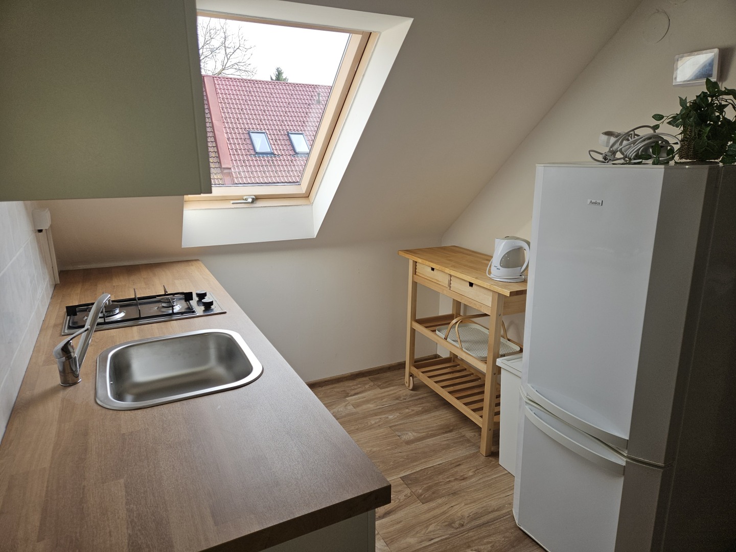 - kuchyňka (plynový sporák, lednička s mrazničkou, myčka, mikrovlnná trouba, kávovar na kapsle, rychlovarná konvice, kontaktní gril)