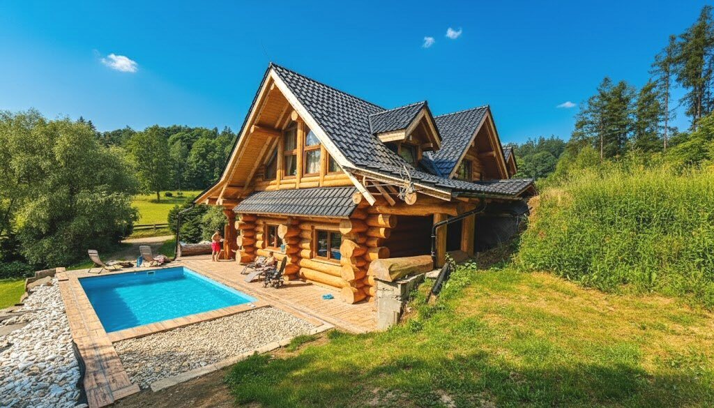 Luxusní a mimořádně atraktivní kanadský srub s venkovním zapuštěným, zastřešeným, vyhřívaným bazénem (celoročně v provozu), saunou, solnou jeskyní a vinným sklípkem, na samotě u lesa a rybníčka, 6 km od obce Radim, 7 km od obce Široká Niva a 18 km od Vrbna pod Pradědem v Jeseníkách.