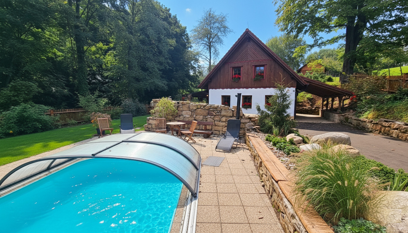 Luxusní, atraktivně vybavená chalupa s venkovním zapuštěným zastřešeným vyhřívaným bazénem a saunou u areálu rodinné farmy, 5 km od Hronova a 5 km od aquaparku Kudowa Zdroj v CHKO Broumovsko.