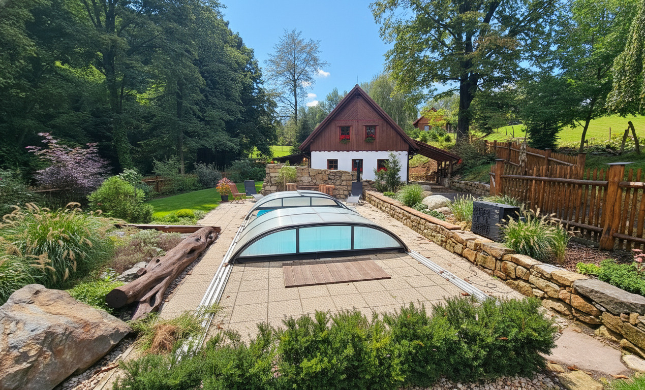 - venkovní zapuštěný zastřešený vyhřívaný (tepelné čerpadlo) bazén 6x3 m s protiproudem, osvětlením a sprchou (teplota vody cca 28°C, v provozu od cca 1.5. do 30.9.)