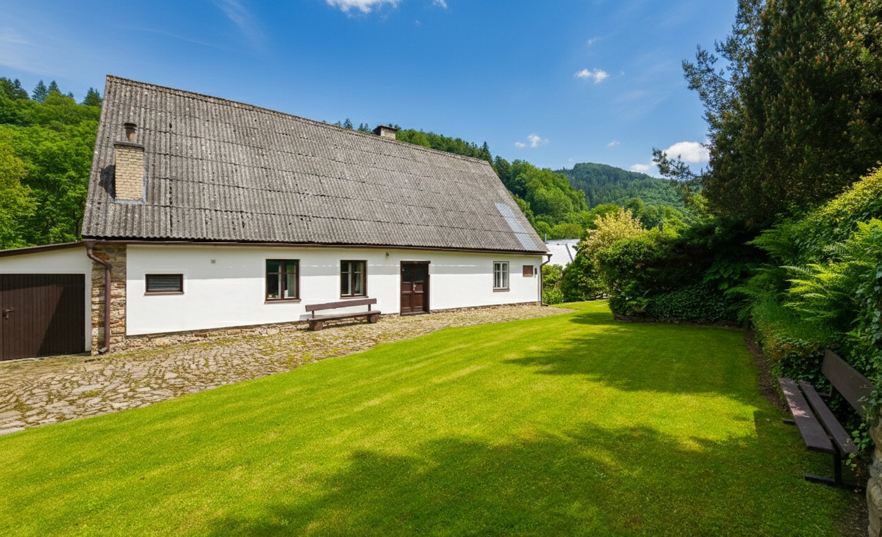Duży atrakcyjny domek w stylu myśliwskim z zadaszoną werandą z basenem w pobliżu lasu i potoku w miejscowości Dolni Udoli, 400 m od wyciągu narciarskiego, 5 km od Zlate Hory w górach Jesioniki.
