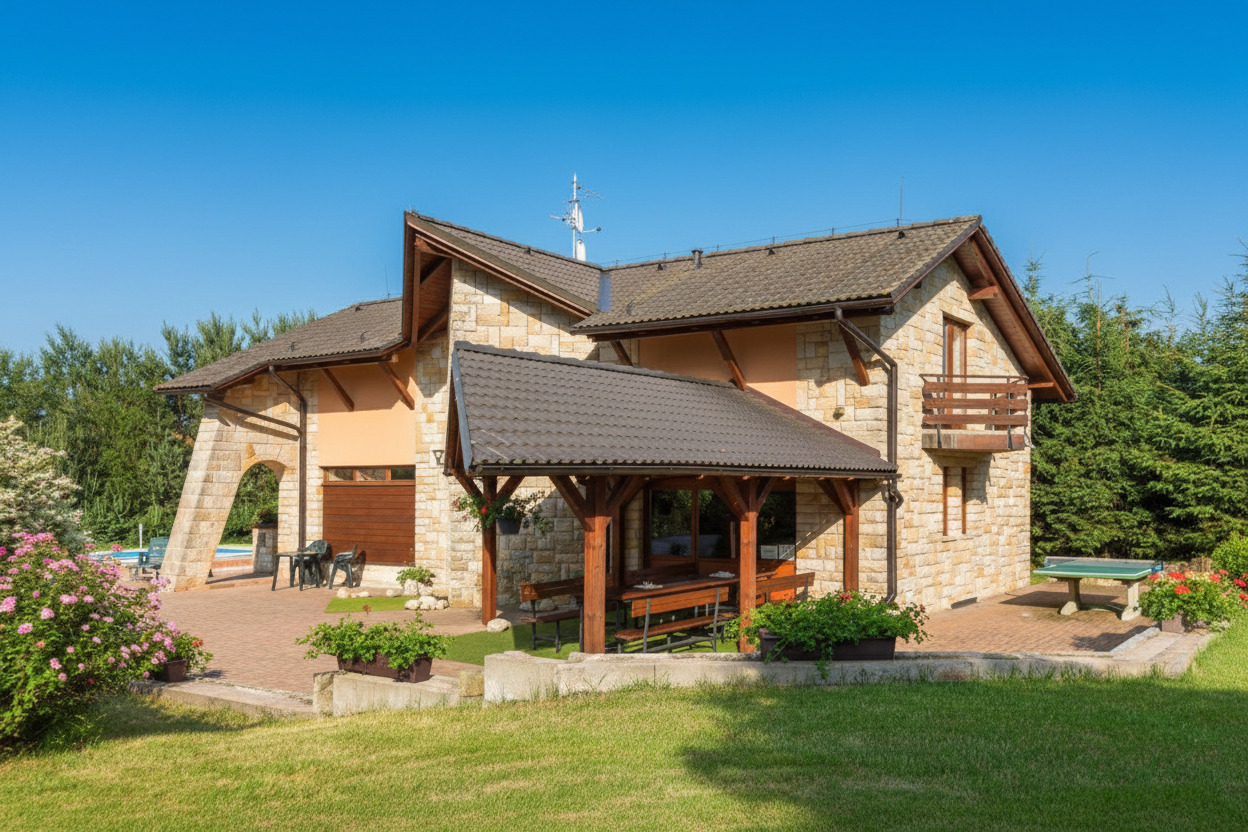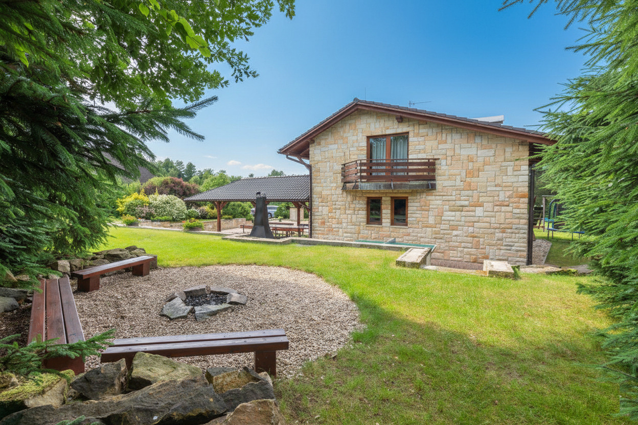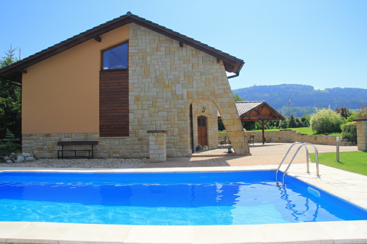 Luxus-Ferienhaus mit solar beheiztem Pool auf einem großen Grundstück mit schöner Aussicht fast alleinstehend, 6 km vom Ort Pecka, 15 km von Nova Paka im Böhmischen Paradies.