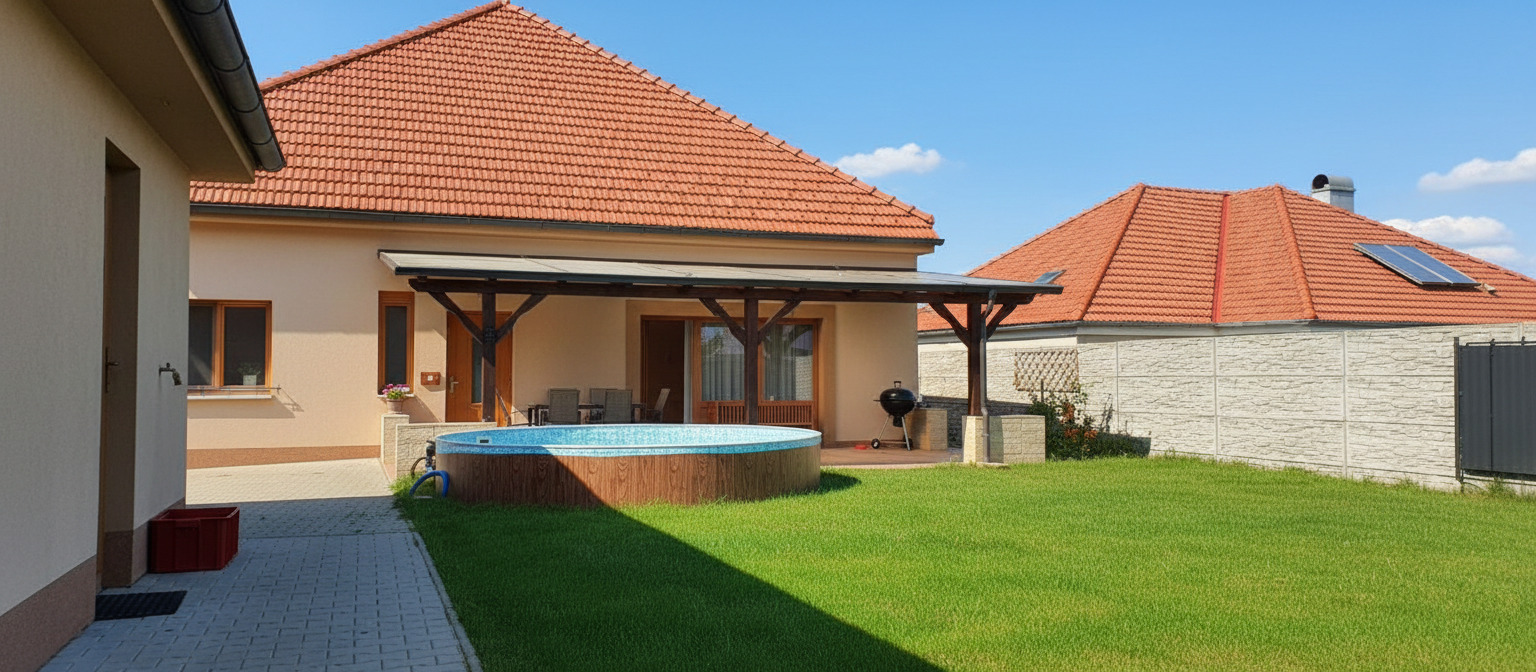 Velmi atraktivní rekreační domek s venkovním bazénem a zastřešenou terasou (zvláště vhodné pro rodiny s dětmi), uprostřed pálavských vinohradů (malé Toskánsko) s krásným výhledem na Svatý Kopeček, 5 km od vodní nádrže Nové Mlýny, 5 km od Mikulova a 10 km od aqualandu Moravia Pasohlávky v CHKO Pálava na jižní Moravě.