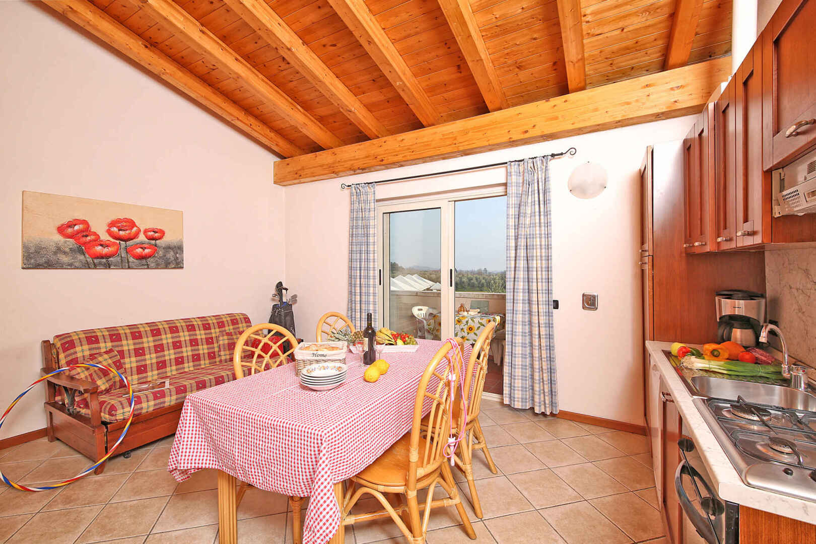- vybavený kuchyňský kout (plynový sporák, lednička, mikrovlnná trouba, myčka) s jídelním stolem v obývací místnosti s TV a 2 lůžky (rozkládací pohovka)
