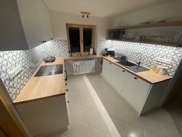 - kuchyně (sklokeramická deska, horkovzdušná trouba, lednička s mrazákem, myčka, mikrovlnná trouba, rychlovarná konvice, toustovač, topinkovač, presovač) s posezením a kachlovými kamny
