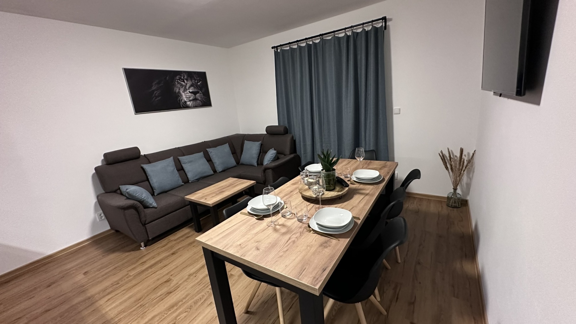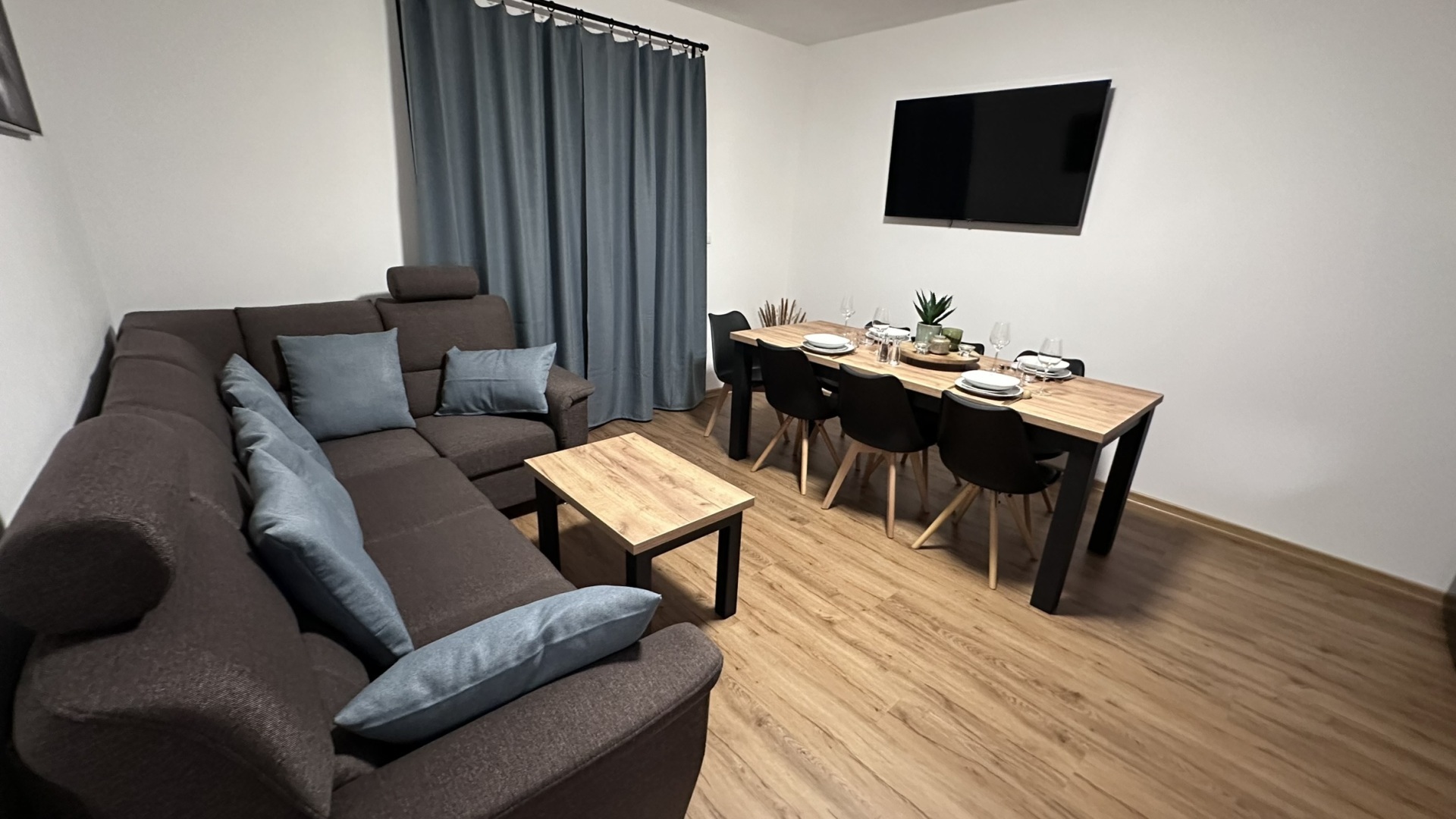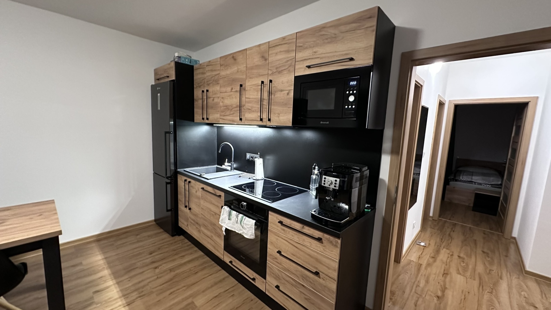 - kuchyňský kout (sklokeramická deska, horkovzdušná trouba, lednička s mrazákem, mikrovlnná trouba, myčka, rychlovarná konvice, rychlovarná konvice, kávovar De Longhi) v obývacím pokoji s jídelním stolem a LCD