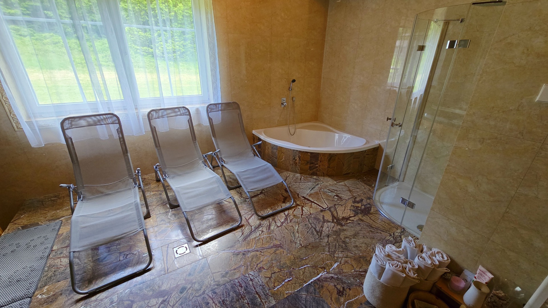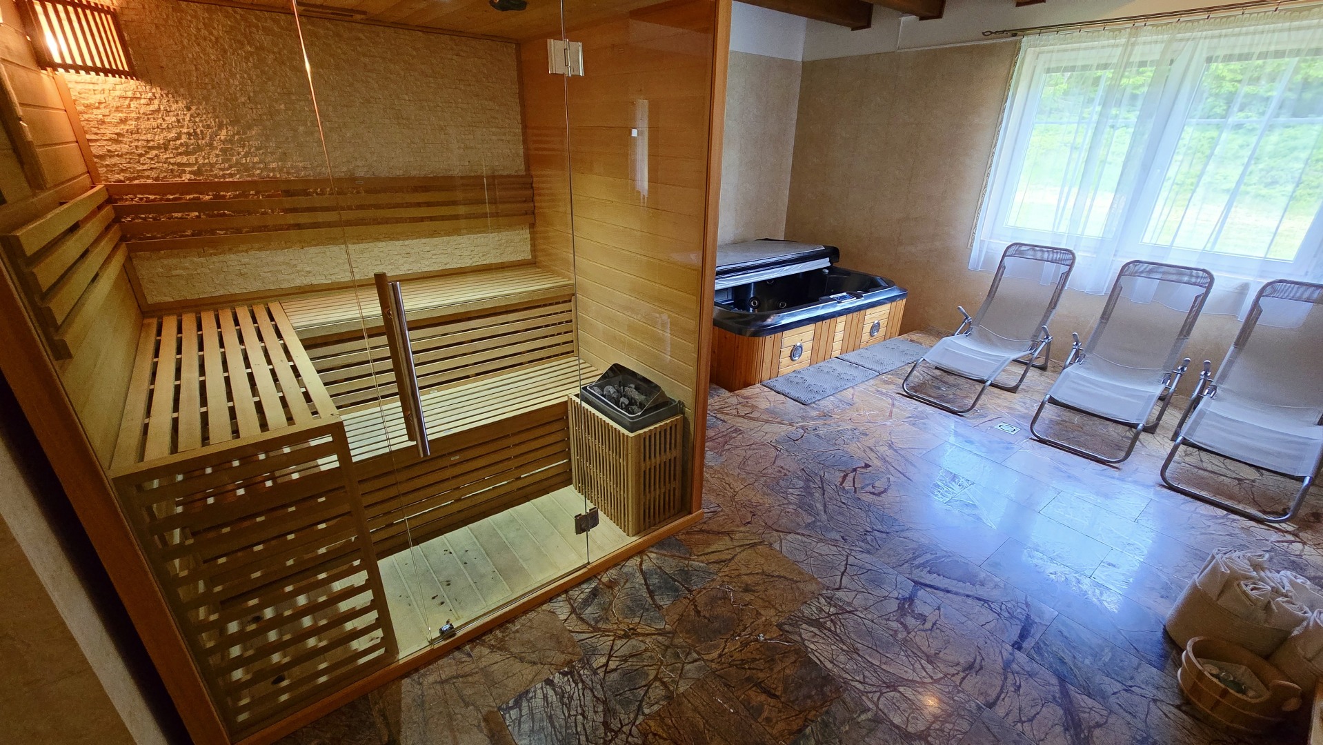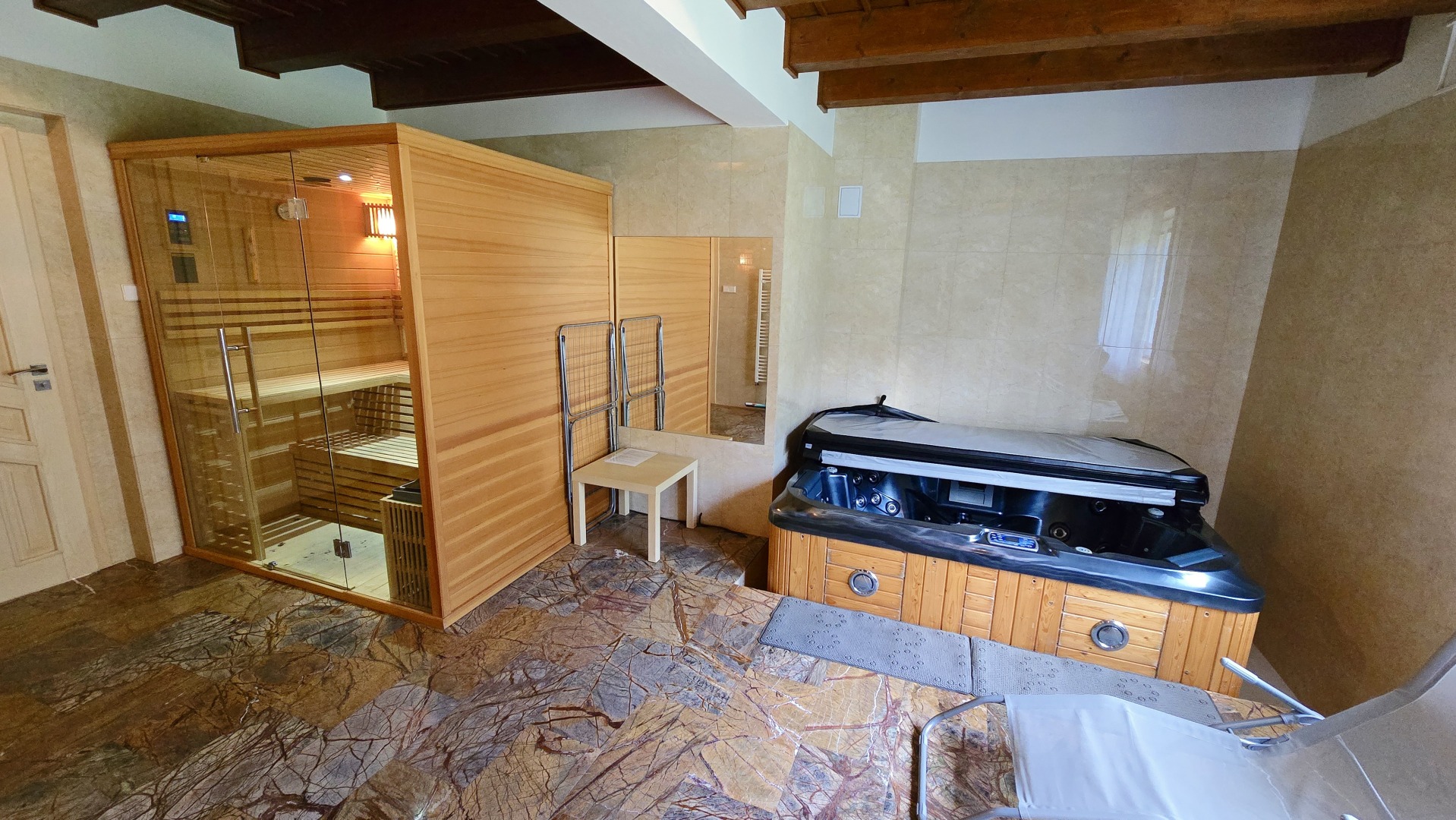 - wellness místnost (finská sauna, masážní bazén SPA, rohová vana, sprchový kout, relaxační lehátka)