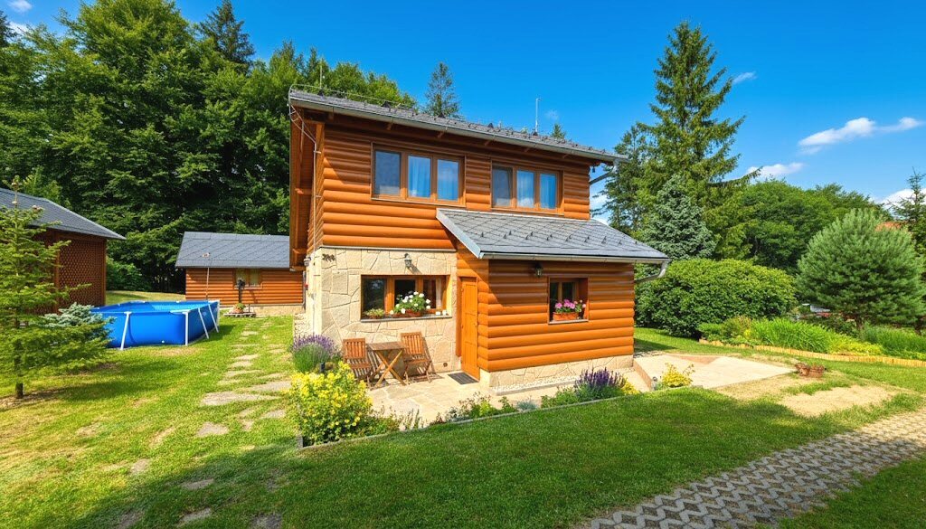 Velmi atraktivní, dřevěná, srubová chata s bazénem a saunou, v malebné horské rekreační osadě, 2 km od Tesáku a 5 km od Trojáku v srdci Hostýnských vrchů.