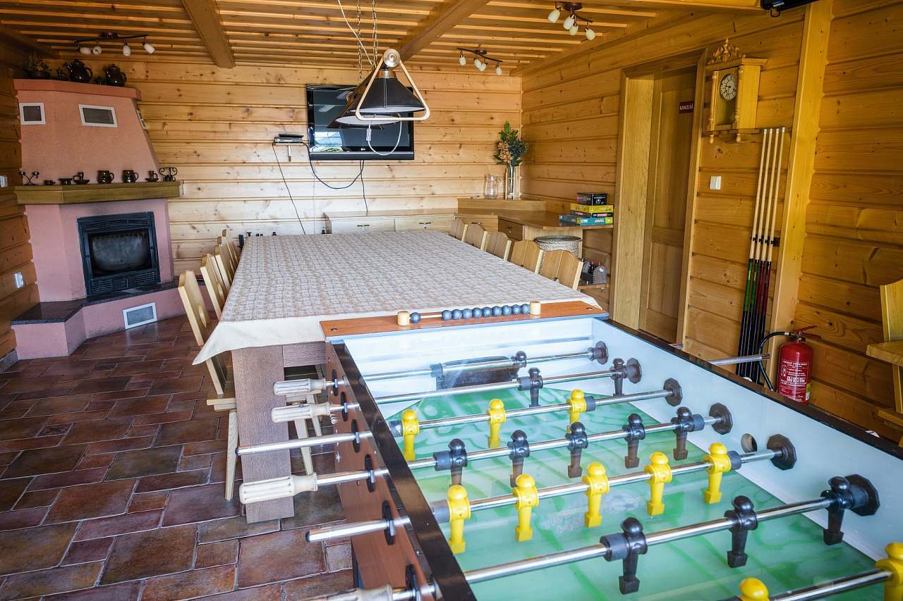 - herna s s biliardovým stolem, stolním fotbalem, krbem s krbovou vložkou a LCD