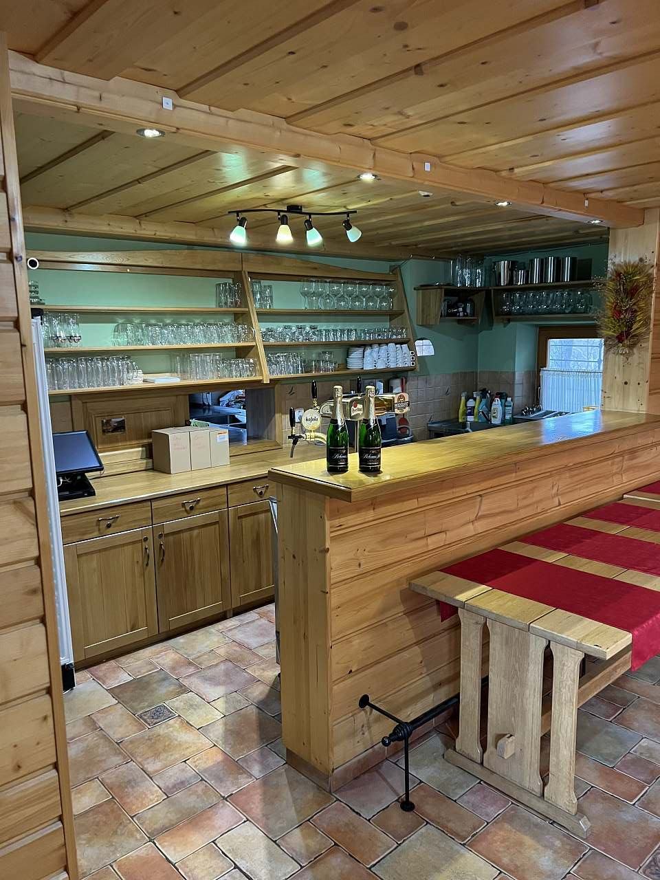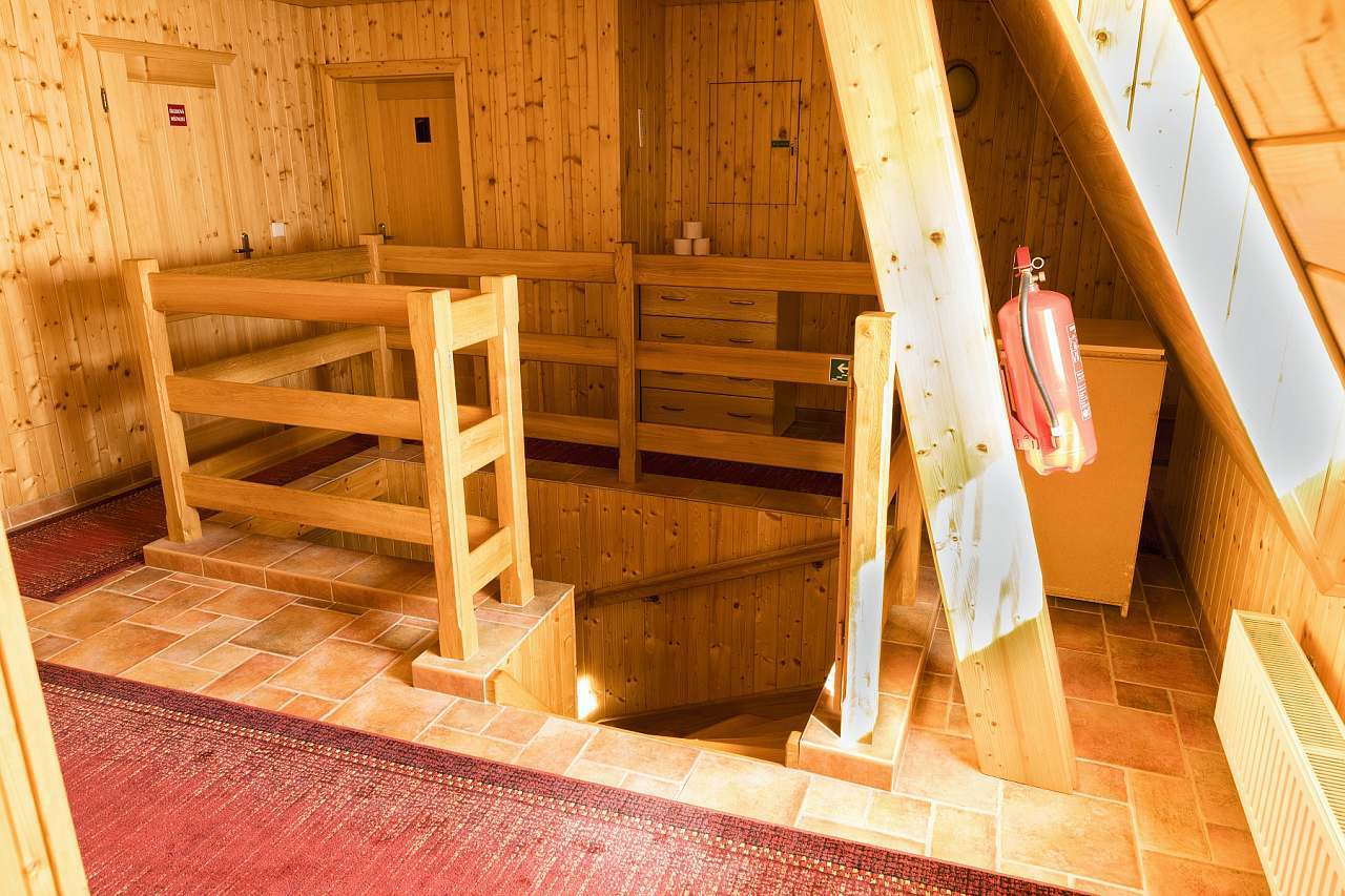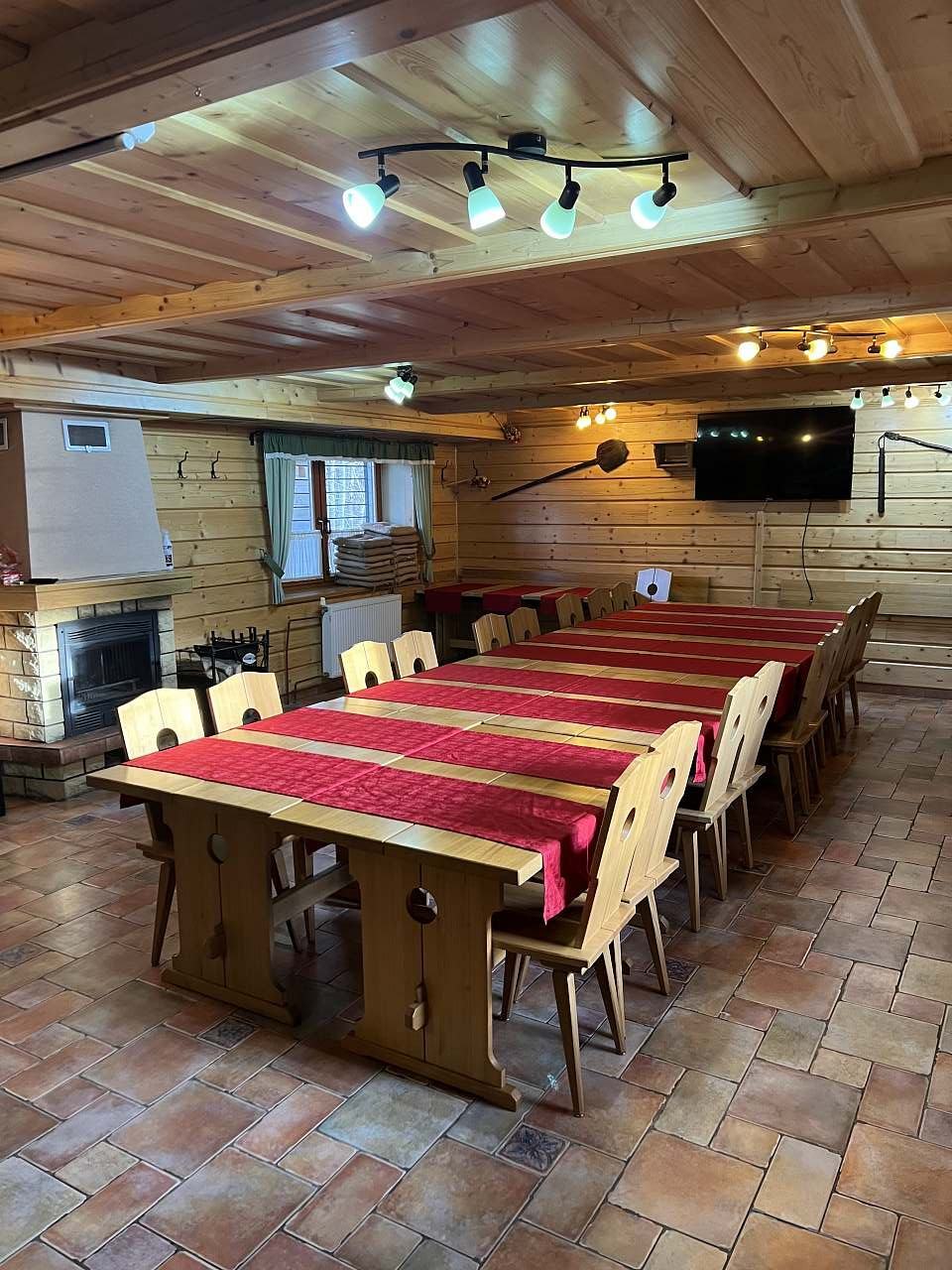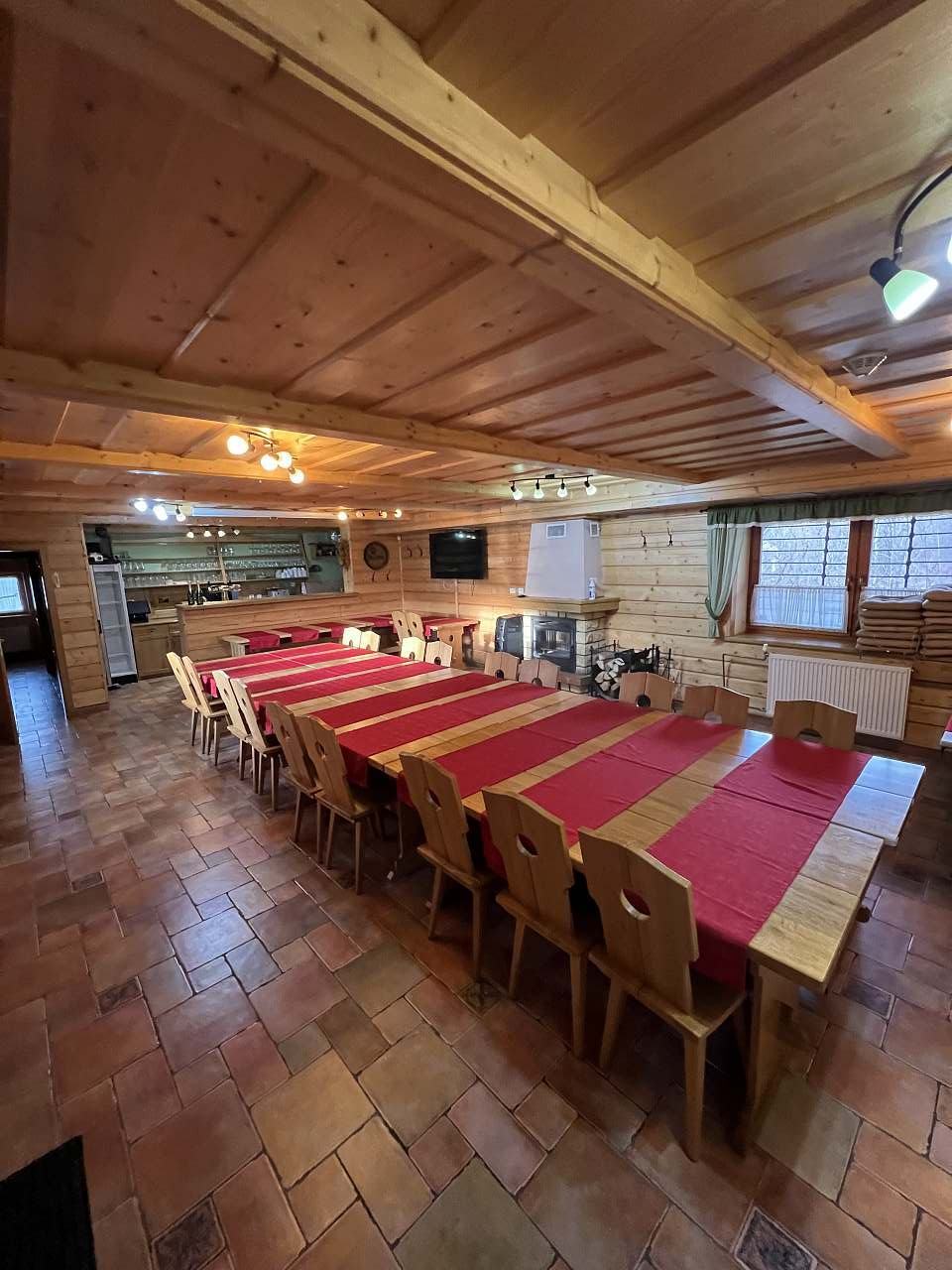 - společenská místnost s masivními dubovými stoly, krbem s krbovou vložkou, LCD a barovým pultem (výčepní zařízení pro 2 druhy piv, 1x výčepní zařízení na kofolu či malinovku, kávovar, myčku, ledovač, 2x lednice)