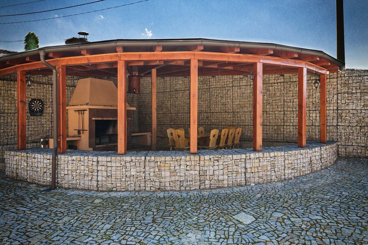 - venkovní nádvoří s velkým krytým osvětleným altánkem s krbem