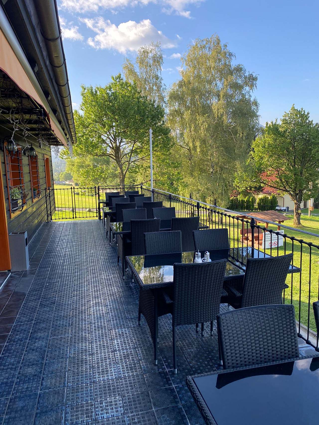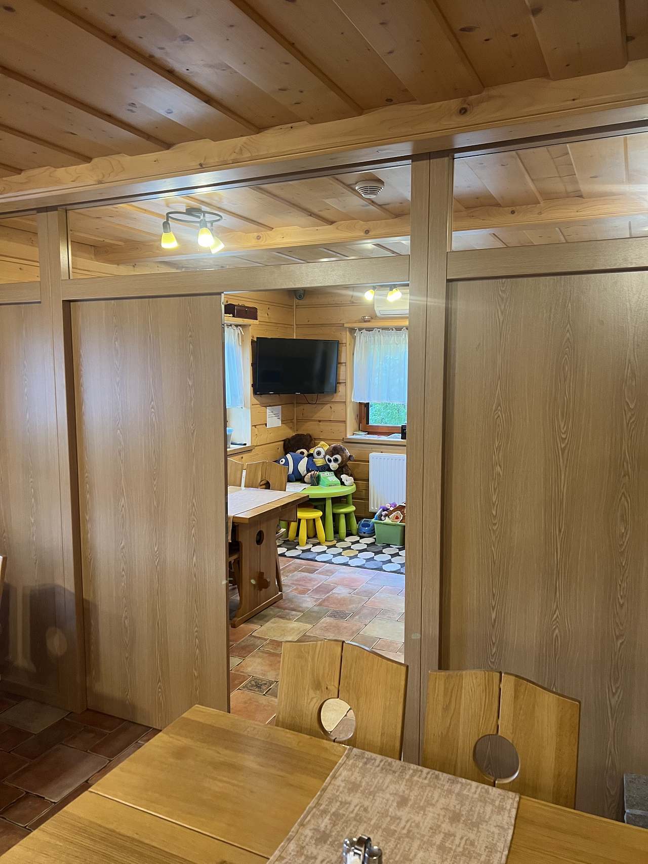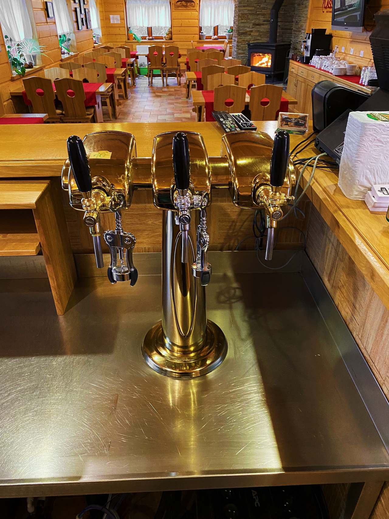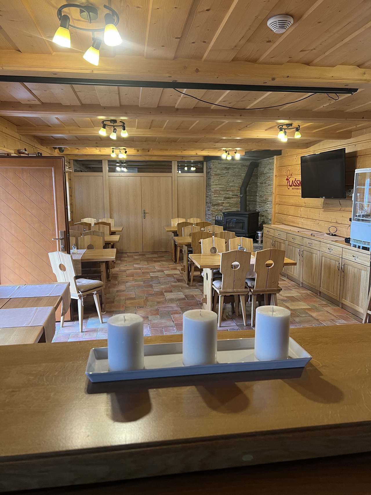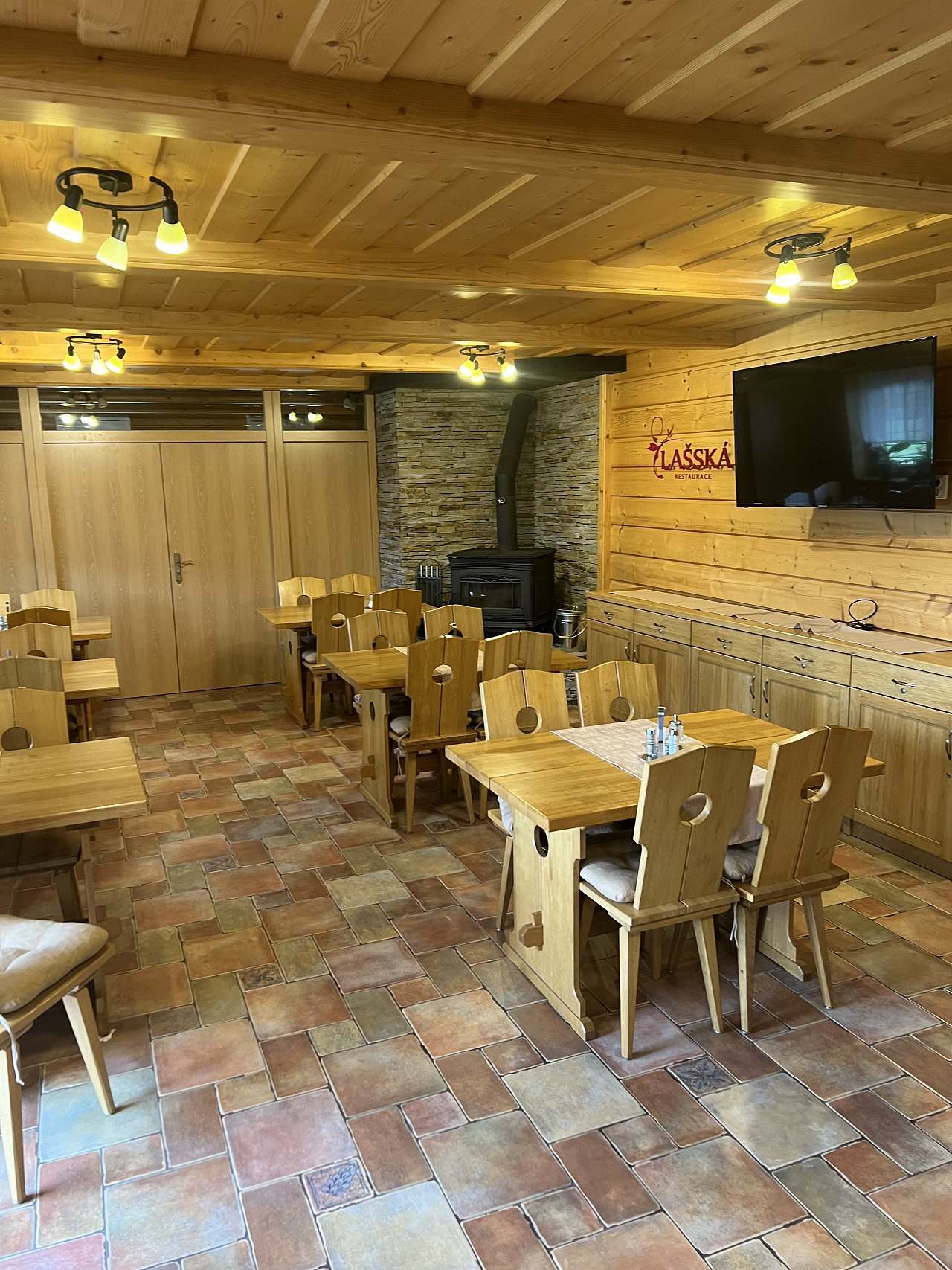 - společenská místnost s masivními dubovými stoly, krbovými kamny, LCD a barovým pultem (výčepní zařízení pro 2 druhy piv, 1x výčepní zařízení na kofolu či malinovku, kávovar, myčku, ledovač, 2x lednice)