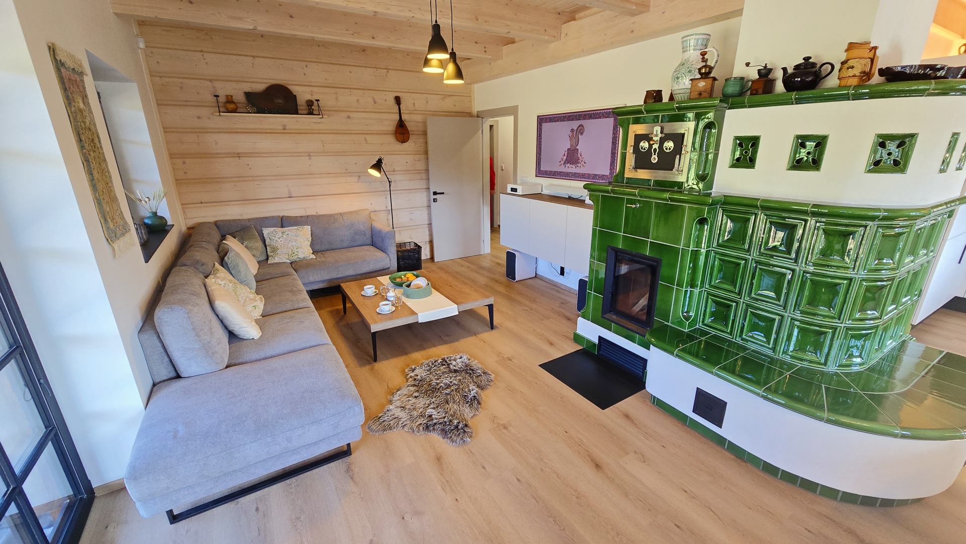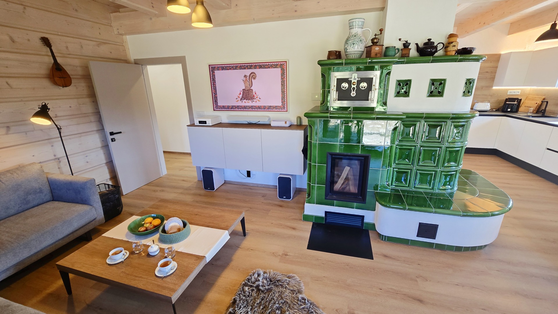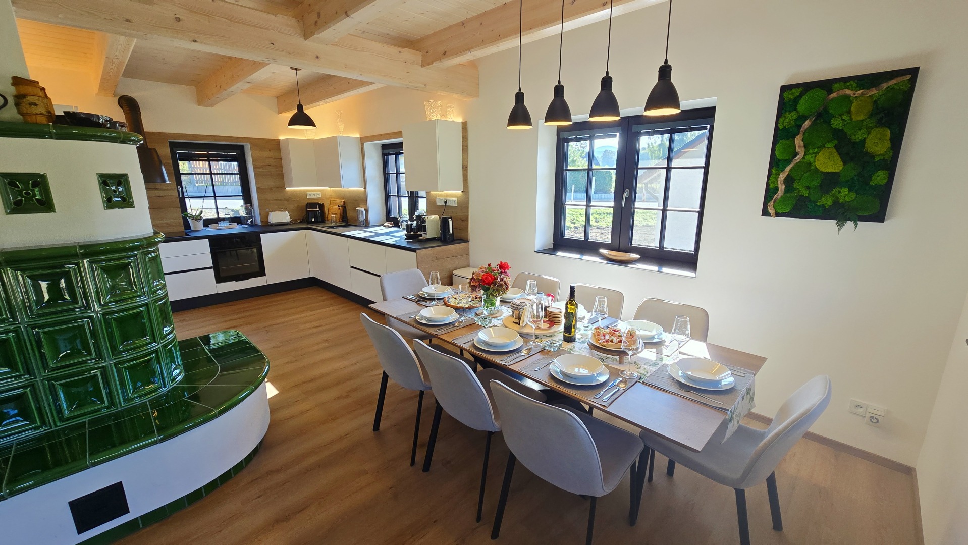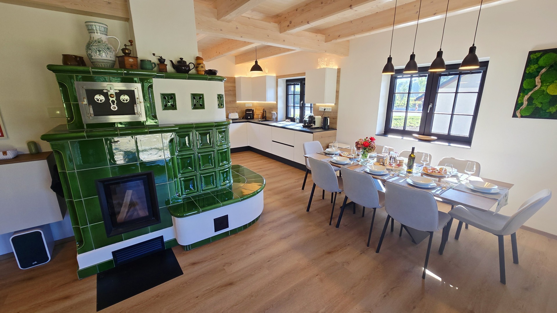 - obývací pokoj s jídelním stolem, kachlovými kamny, Smart TV (apple TV, Blu-ray, HIFI DENON, Internetové rádio saudbar, repro palk) a se vstupem na zastřešenou osvětlenou terasu s lounge posezením
