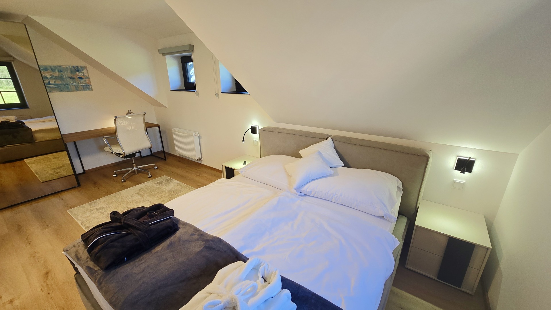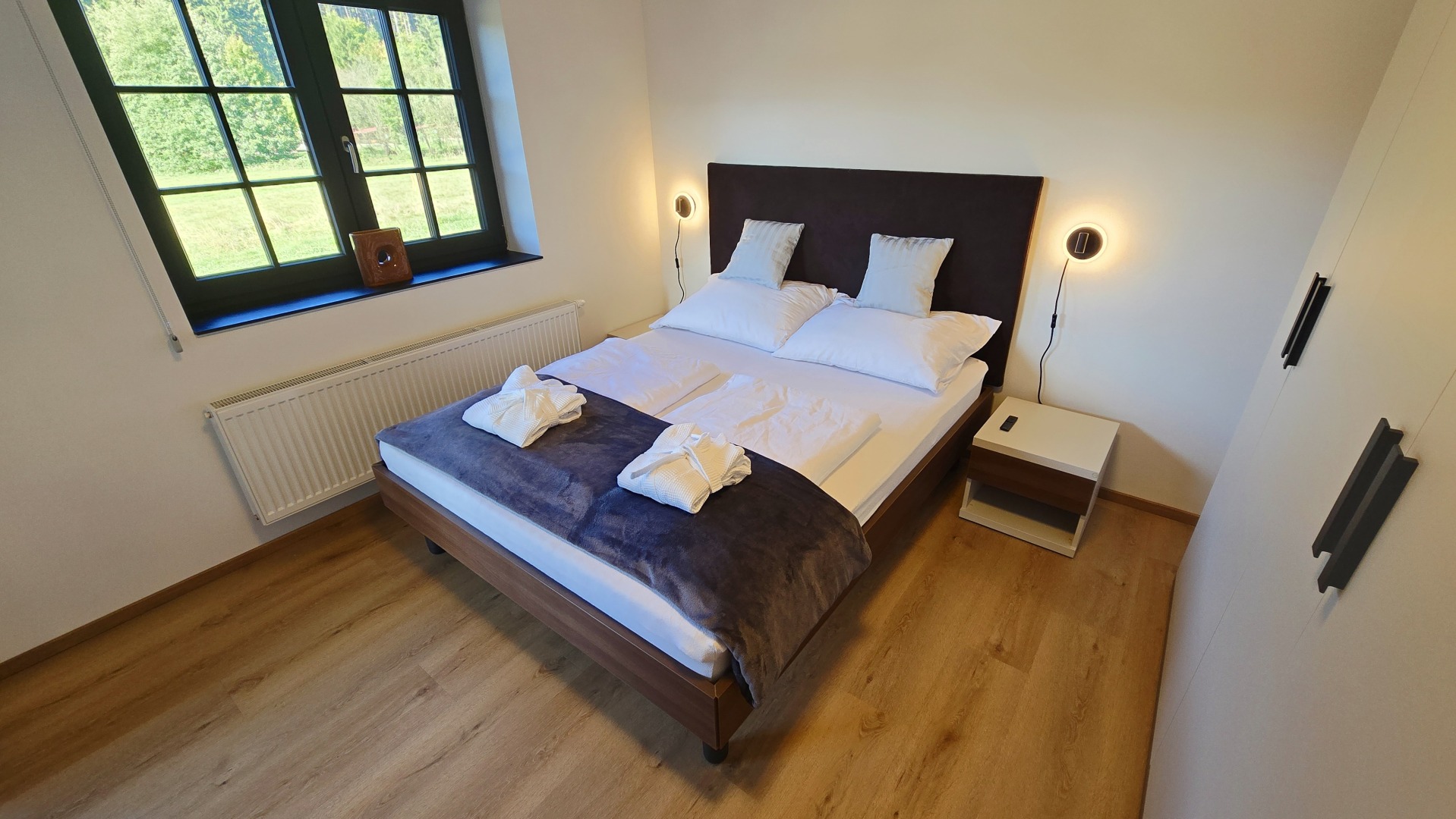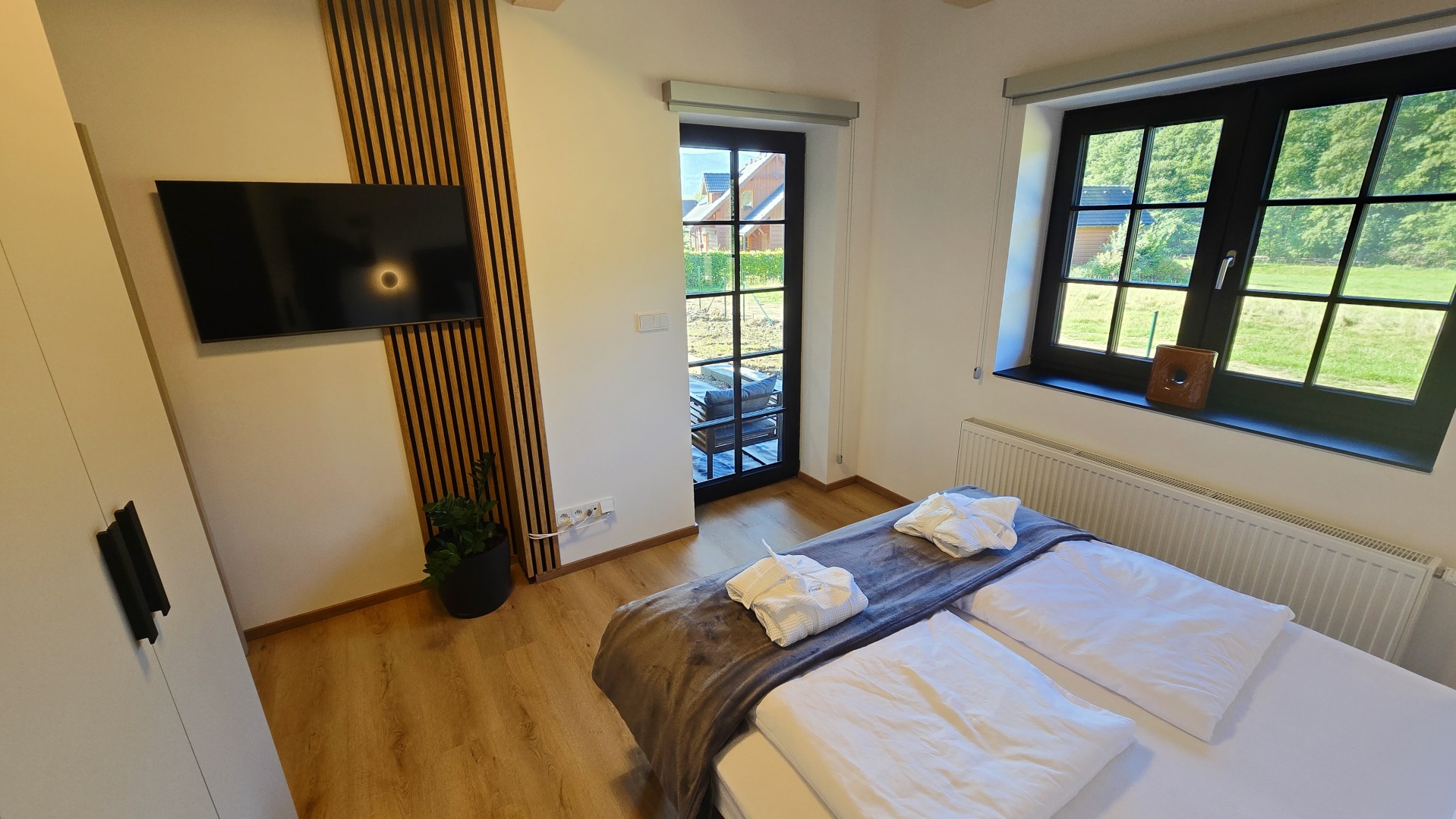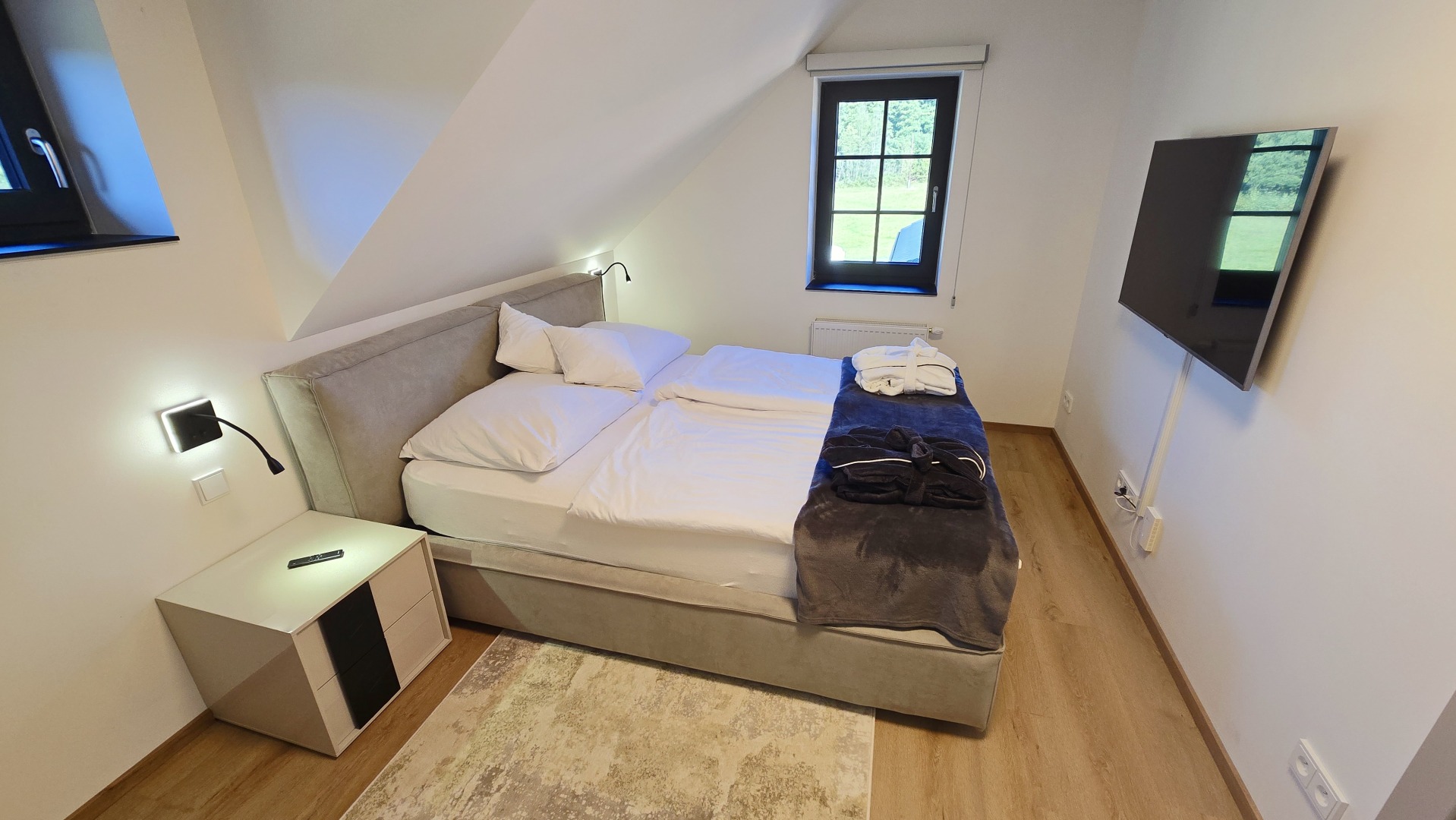 - 3 ložnice (2/2, 1/3) - každá s TV, 2 ložnice v patře mají přímý vstup na terasu s posezením