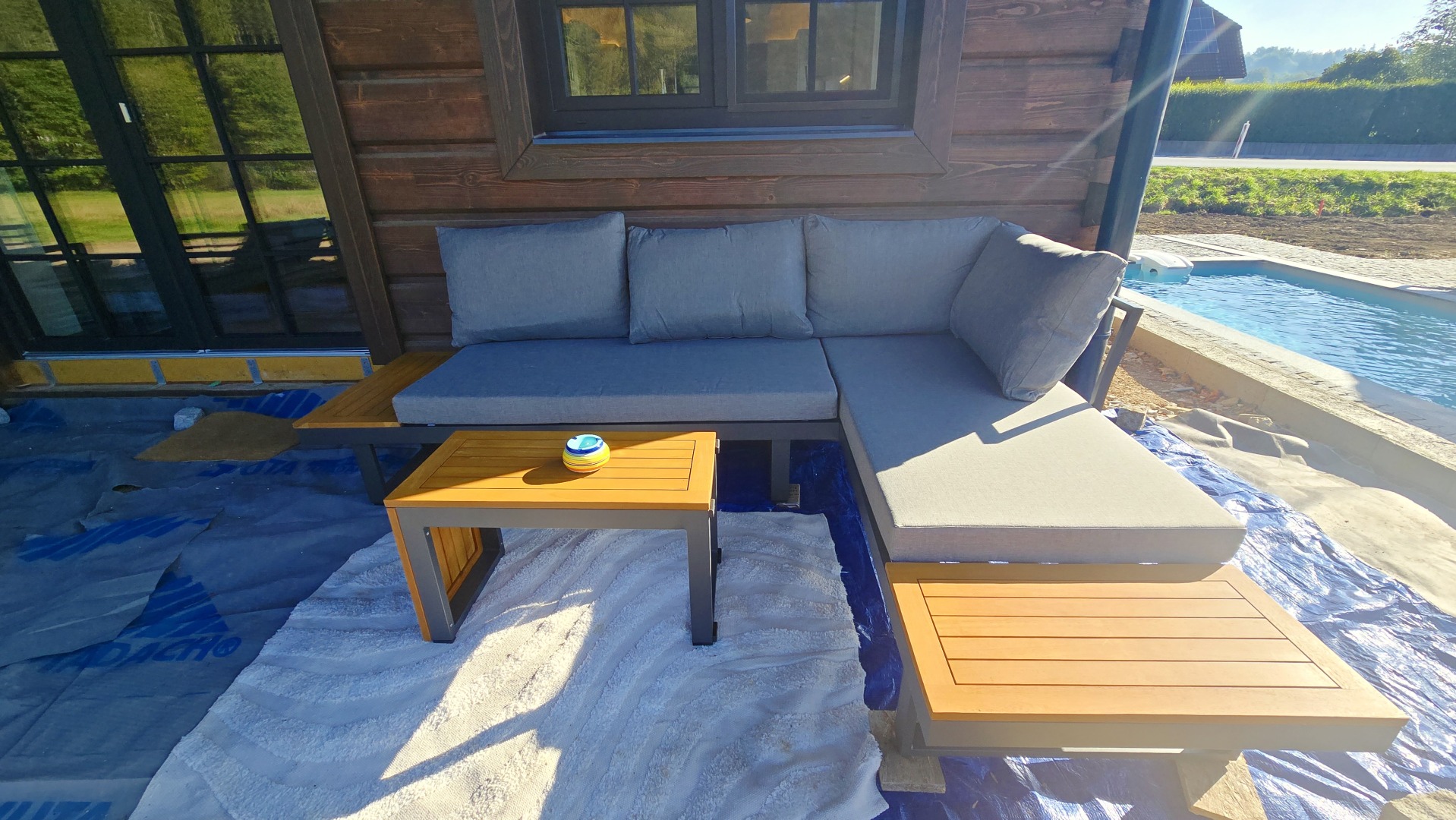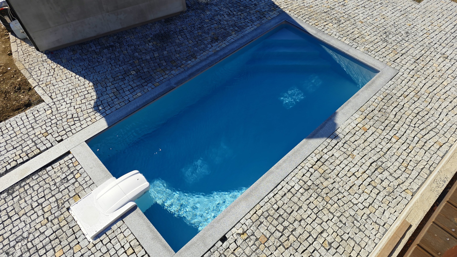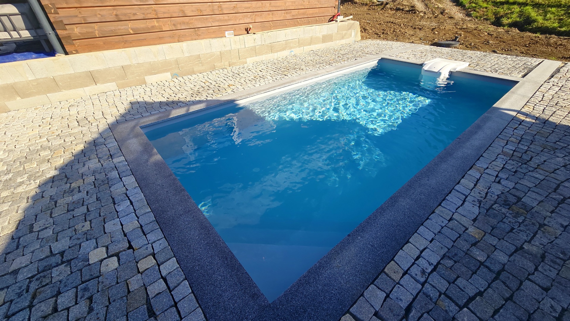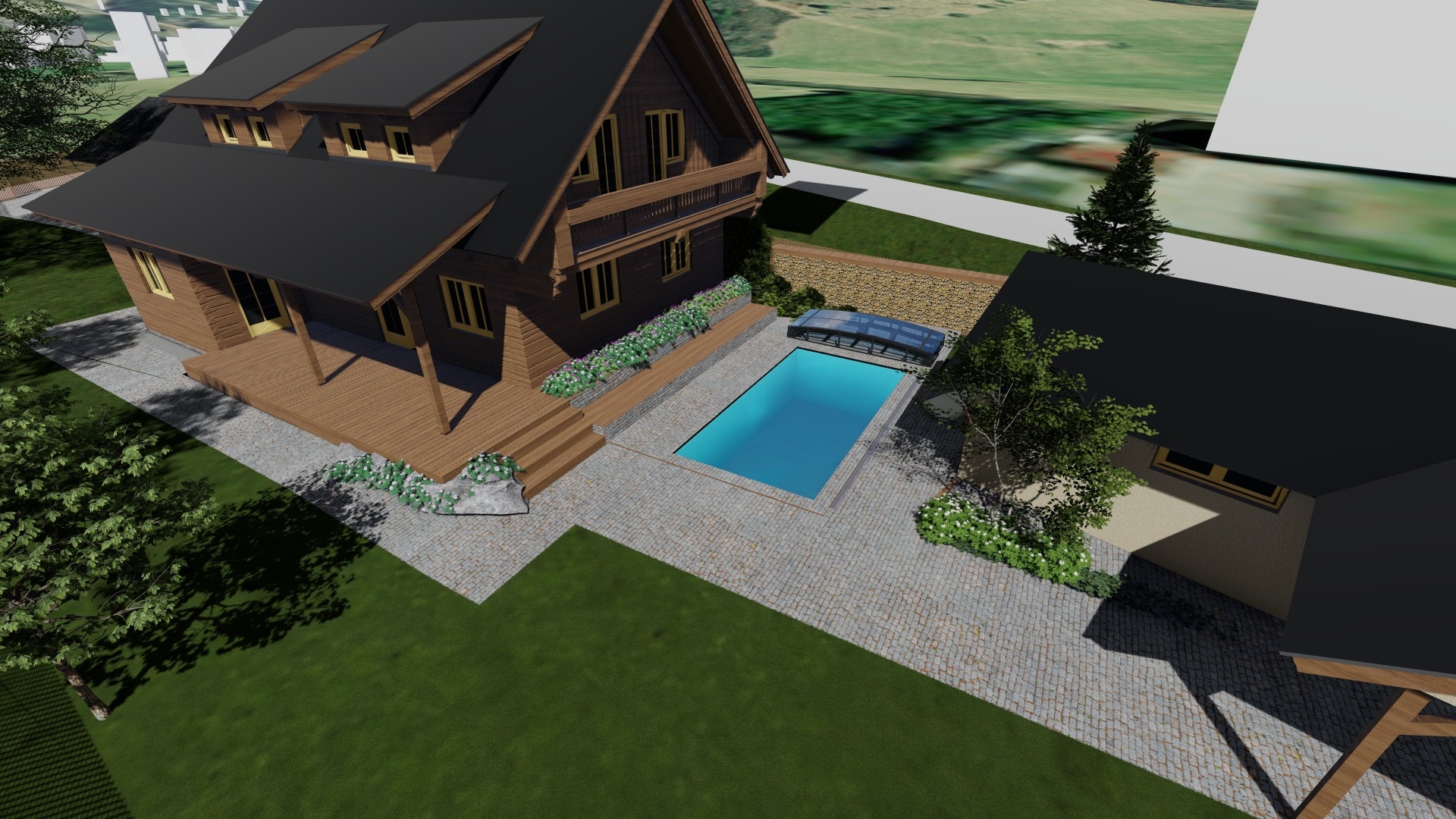 - venkovní, zapuštěný, zastřešený, osvětlený a vyhřívaný (tepelné čerpadlo, chlazení topením) bazén 6x3 m se slanou vodou