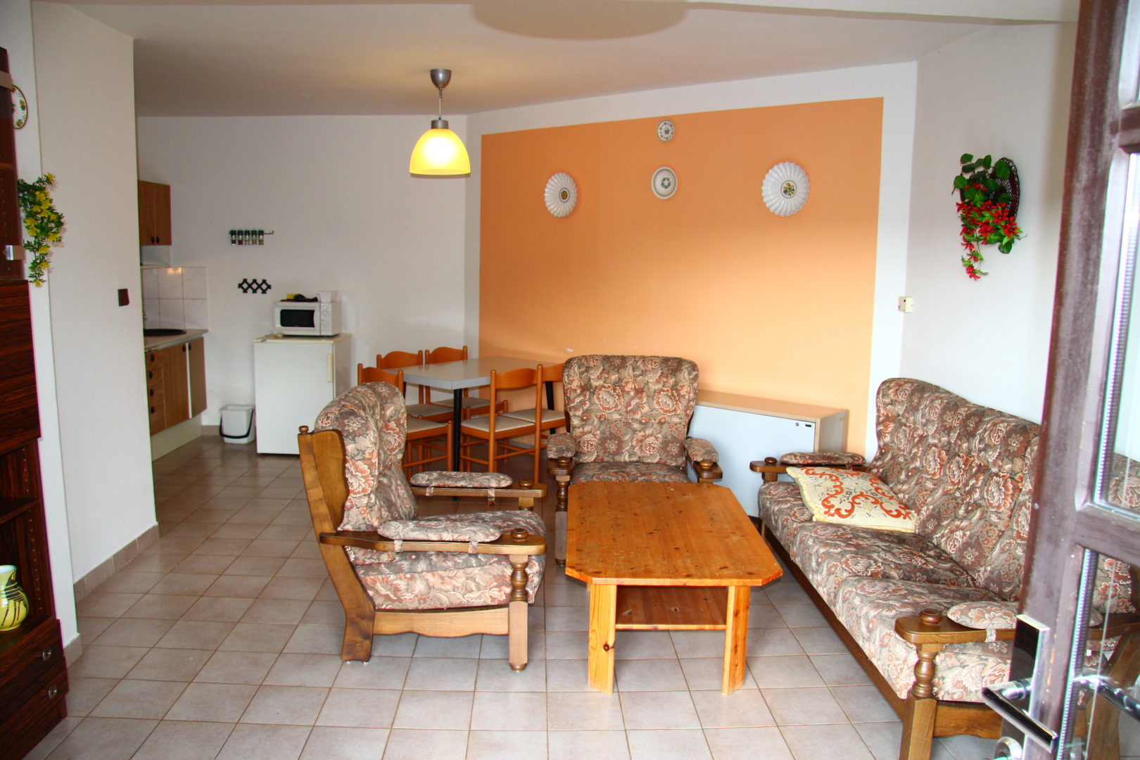 - kuchyňský kout (el. dvouplotýnkový vařič, lednička, mikrovlnná trouba, rychlovarná konvice) s posezením v obývacím pokoji s TV-SAT