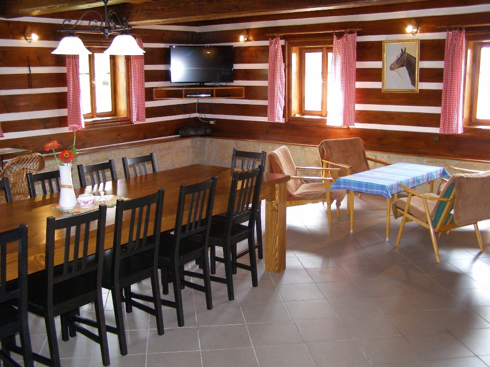 - kuchyňská linka (sklokeramická deska s el. troubou, lednička s mrazákem, mikrovlnná trouba, rychlovarná konvice) v obývacím pokoji se 2 jídelními stoly, LCD-DVD a krbovými kamny