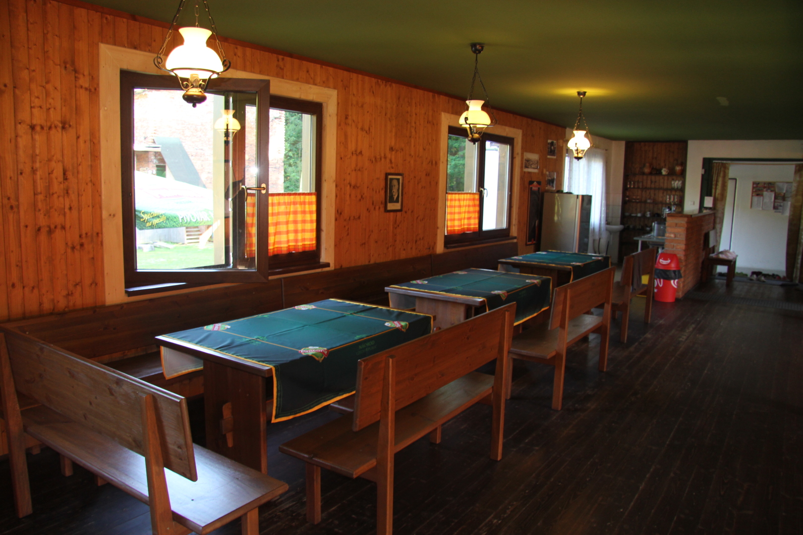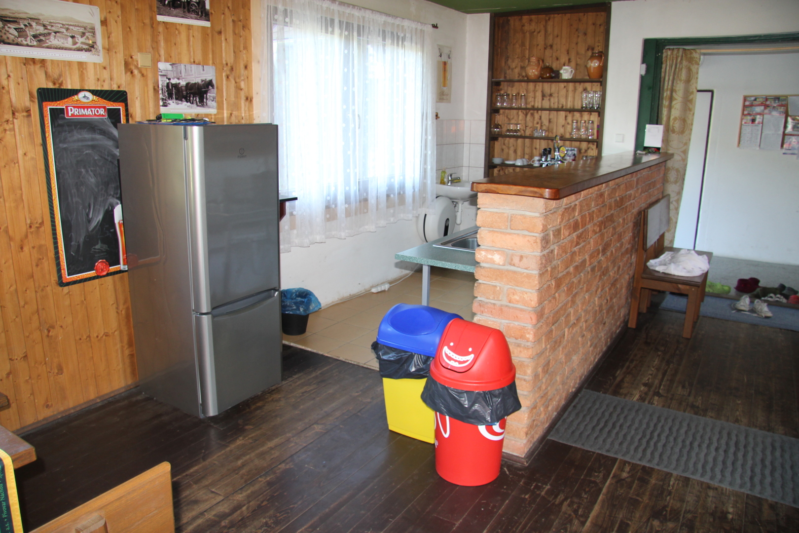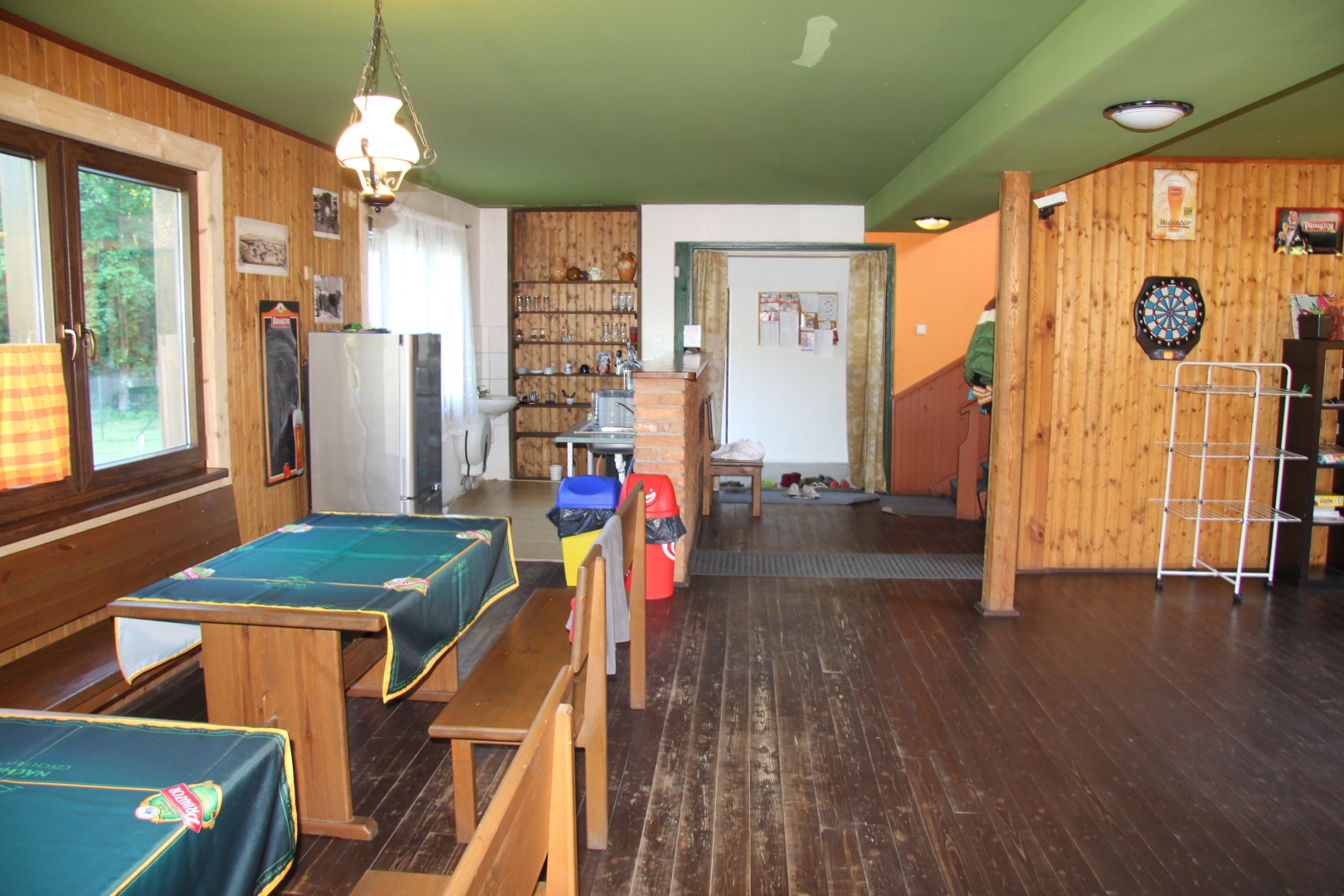 - kuchyně (indukční vařič, lednička s mrazákem, mikrovlnná trouba, rychlovarná konvice, remoska) s barovým pultem s výčepním zařízením ve velké společenské místnosti s krbem s krbovou vložkou