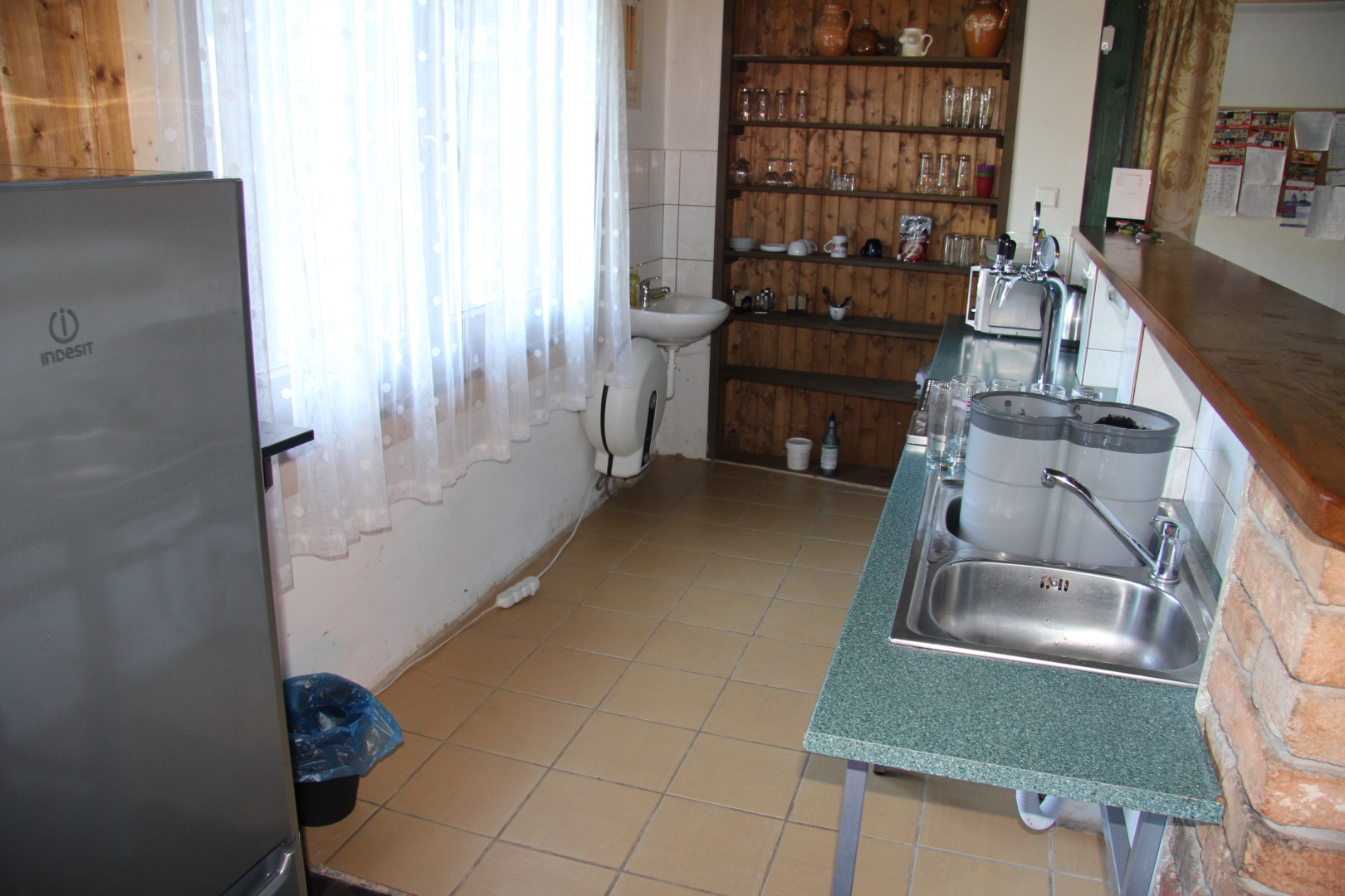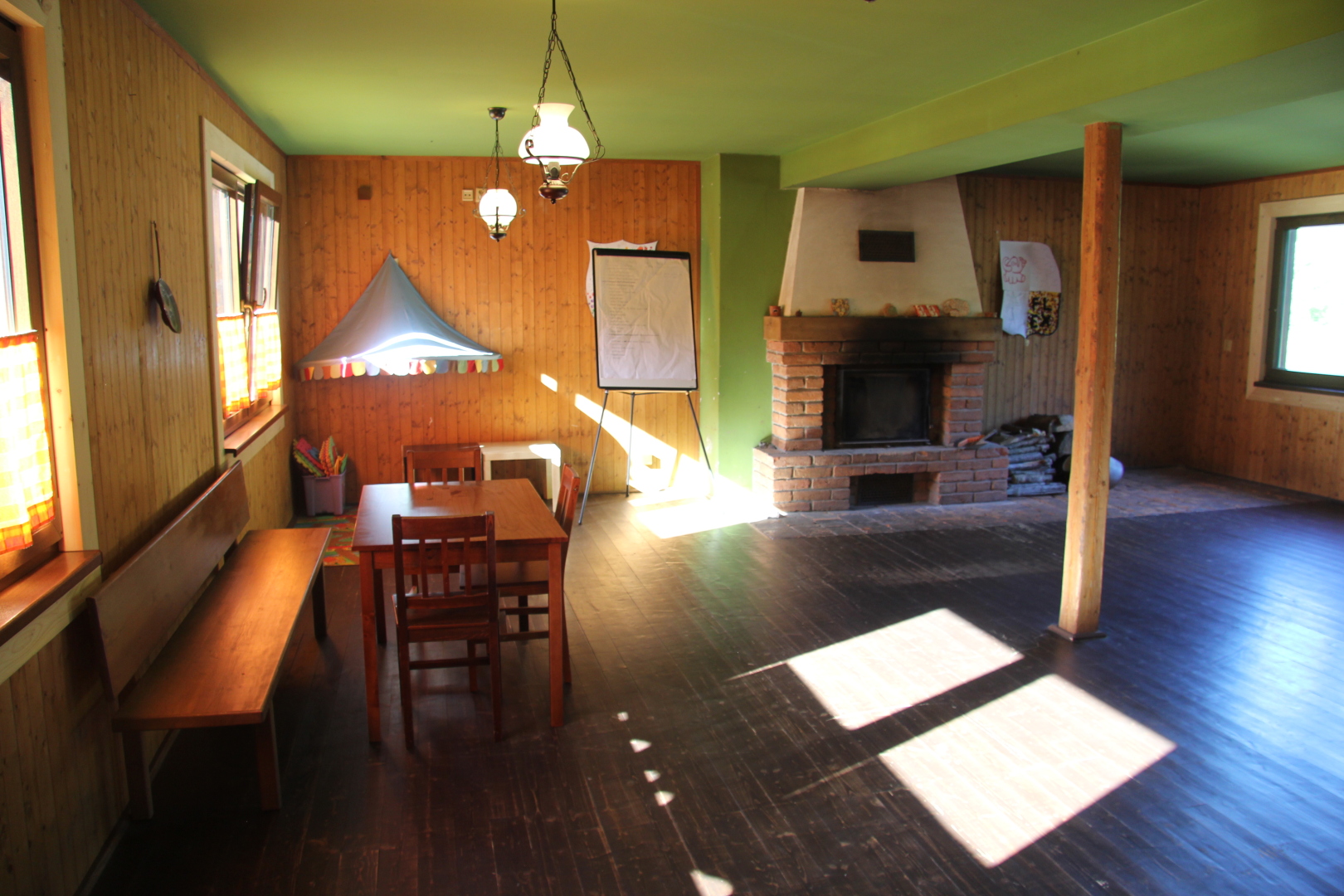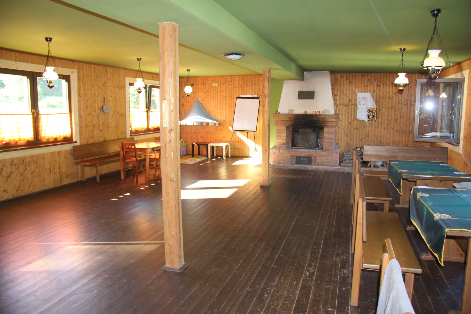 - kuchyně (indukční vařič, lednička s mrazákem, mikrovlnná trouba, rychlovarná konvice, remoska) s barovým pultem s výčepním zařízením ve velké společenské místnosti s krbem s krbovou vložkou
