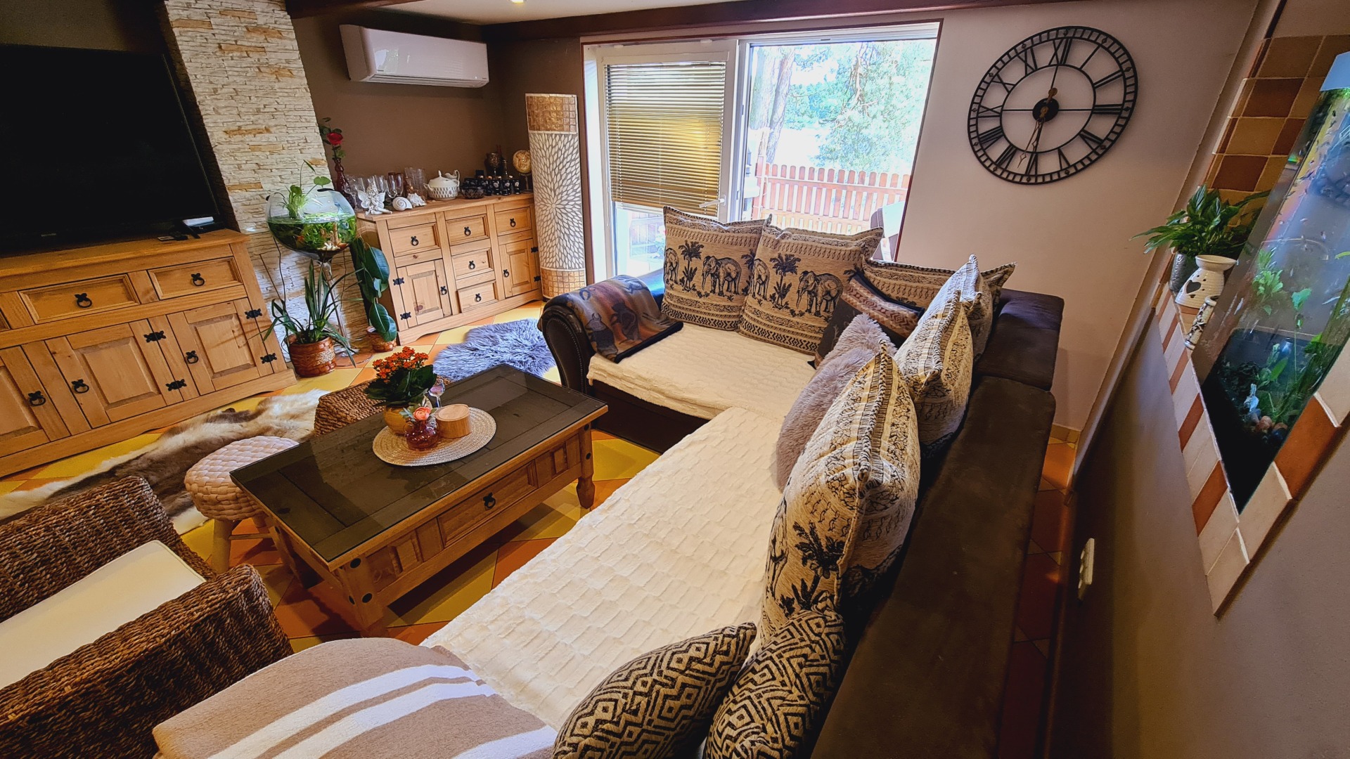 - obývací pokoj s LCD-SAT, krbovými kamny, klimatizací, jukeboxem s barevnou hudbou a se vstupem na osvětlenou terasu s markýzou, krbem, posezením a s výhledem na rybník