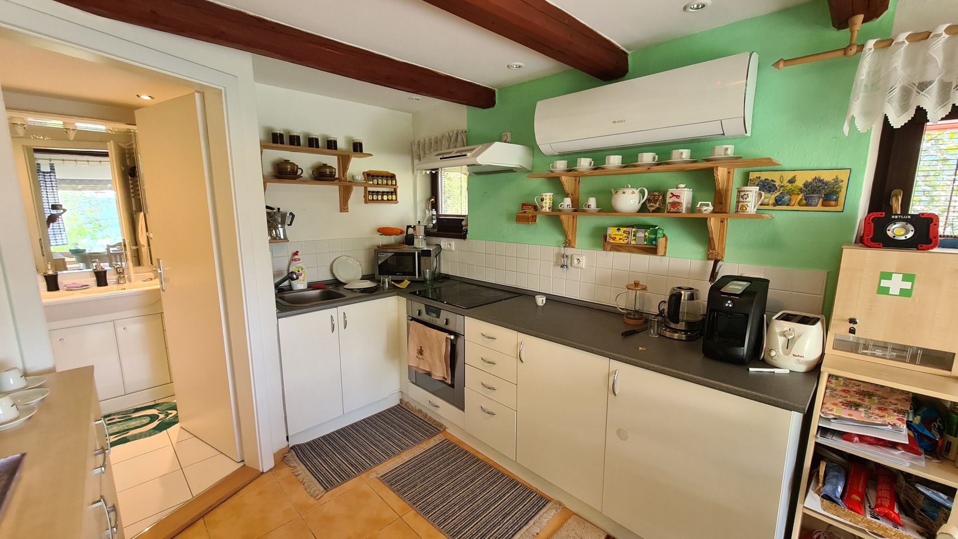 - kuchyně (sklokeramická deska, horkovzdušná trouba, lednička, mikrovlnná trouba, rychlovarná konvice, toustovač) s posezením a krásným výhledem