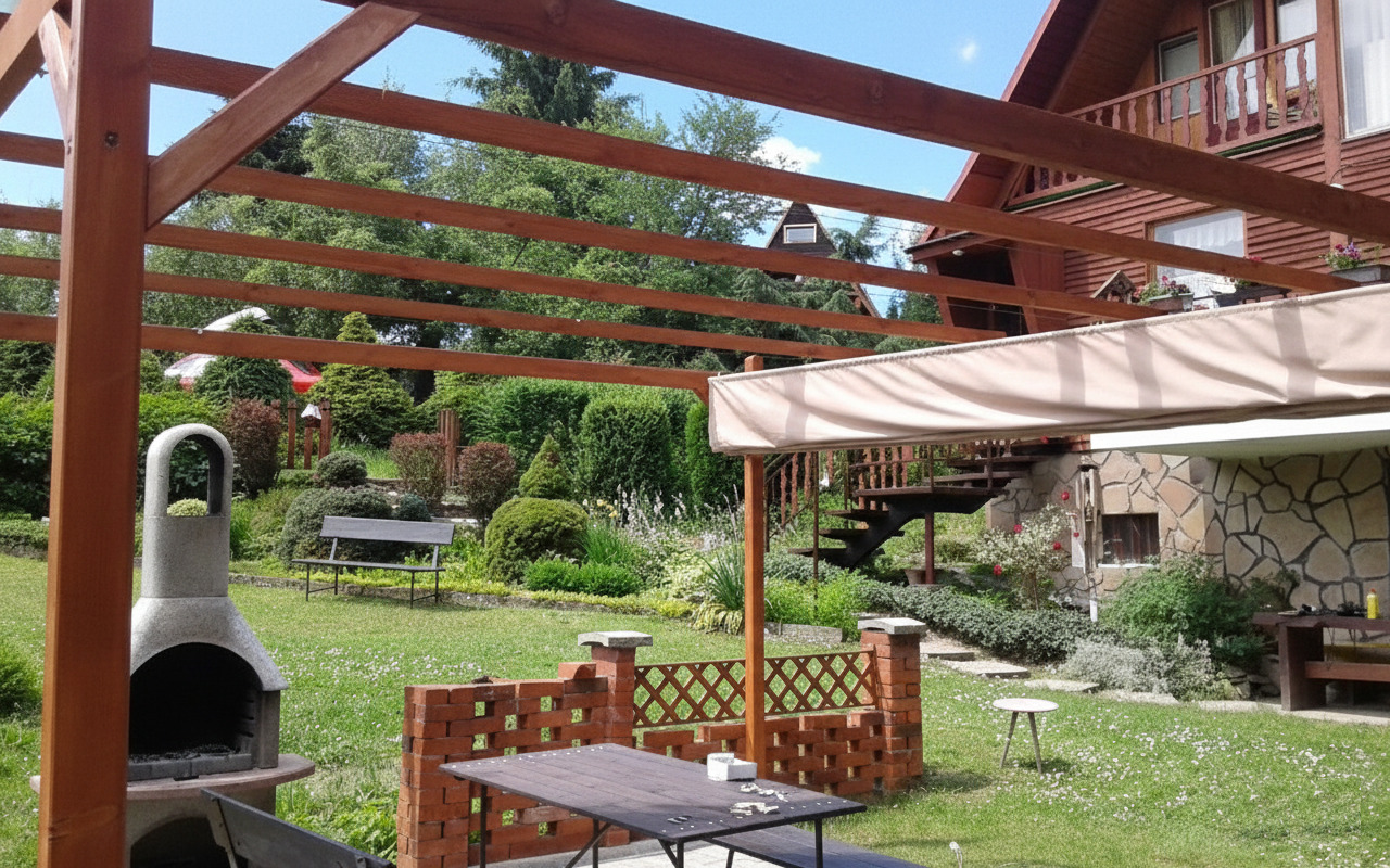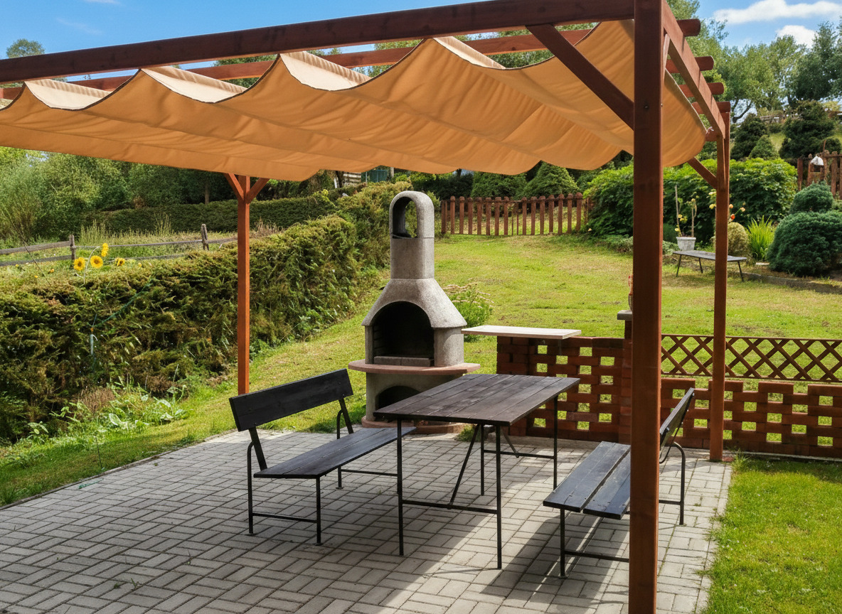 - pergola s rolovací střechou s posezením a venkovním krbem
