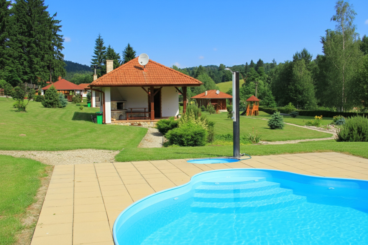 Atraktivní chata v rekreačním areálu s venkovním zapuštěným bazénem, 3 km Borušova, 7 km od Mírova a 25 km od hradu Bouzov na Zábřežské vrchovině.