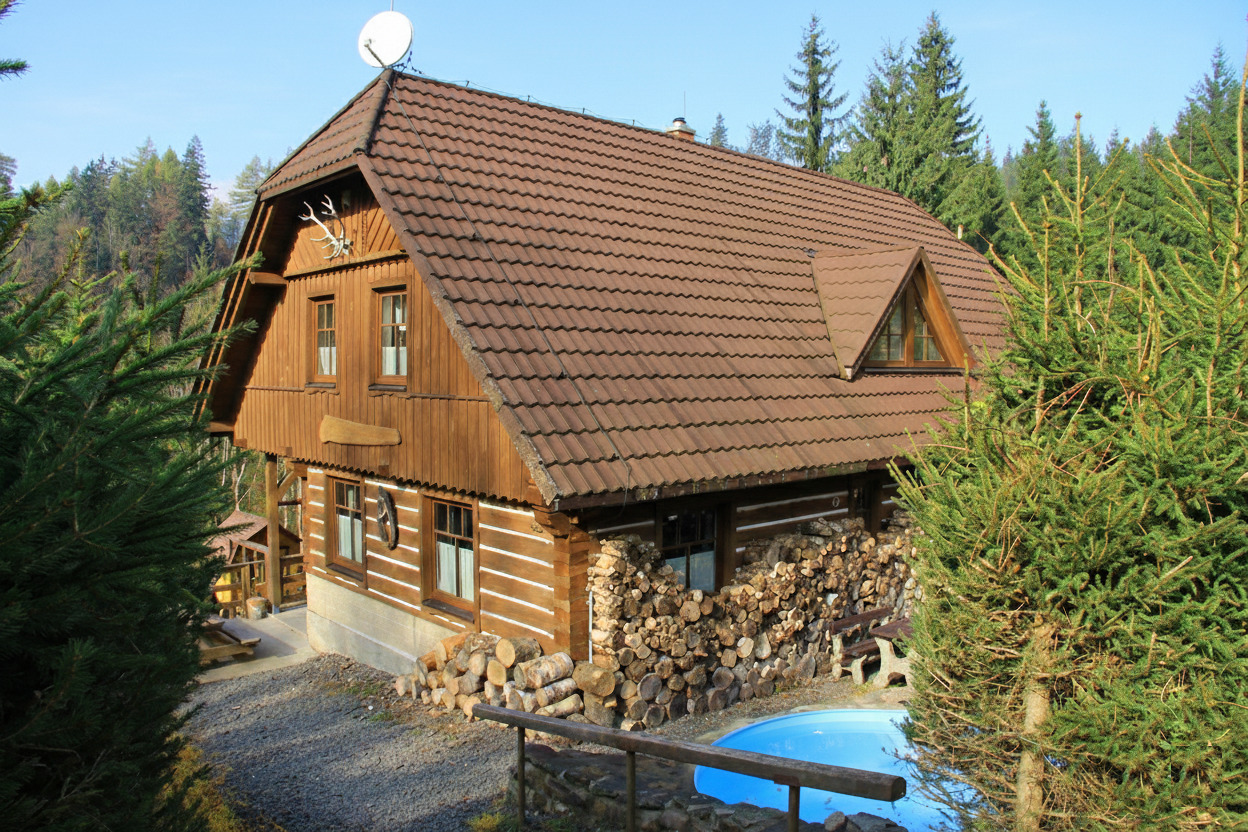 Luxusní chalupa (roubenka) s venkovním zapuštěným solárně vyhřívaným bazénem, saunou a bazénovou nádrží, 50 m od lyžařského vleku, 1 km od lyžařského areálu Aldrov, pod Janovou horou, 6 km od Rokytnice nad Jizerou v Krkonošském Národním parku.