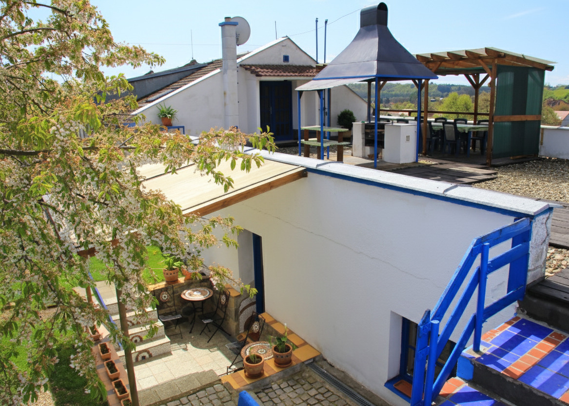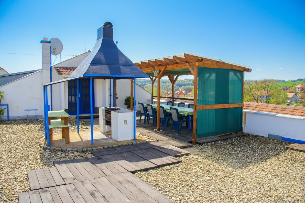 - velké osvětlené posezení (grill párty) na horní terase s grilovacím roštem, zastřešeným posezením a s pěkným výhledem do okolí