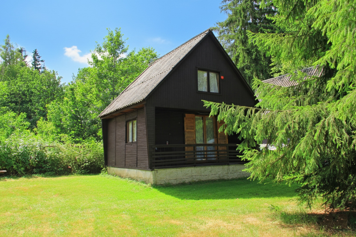 Dřevěná srubová chata v lesním chatovém areálu u rekreačního rybníka, 1,5 km od Velké Turné, 4 km od Oseka, 5 km od Sedlice a 13 km od Písku v jižních Čechách.