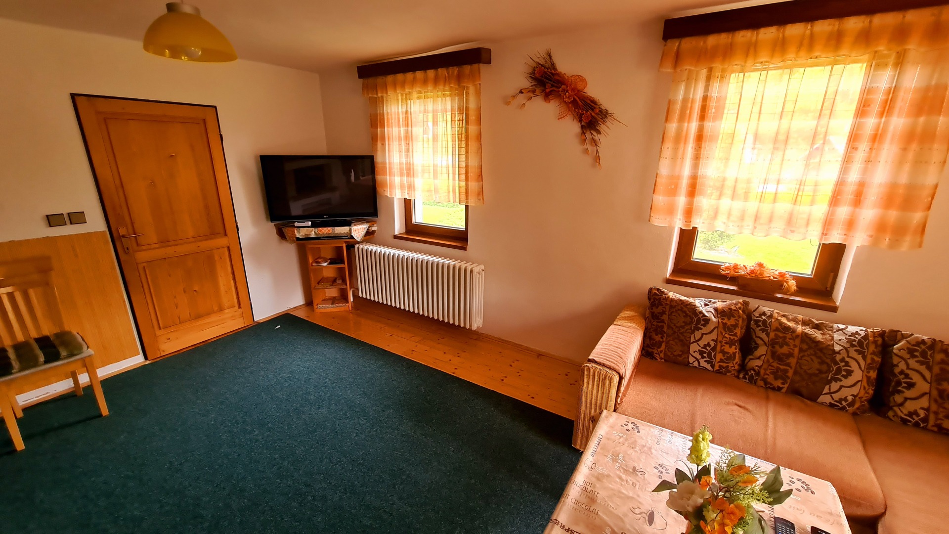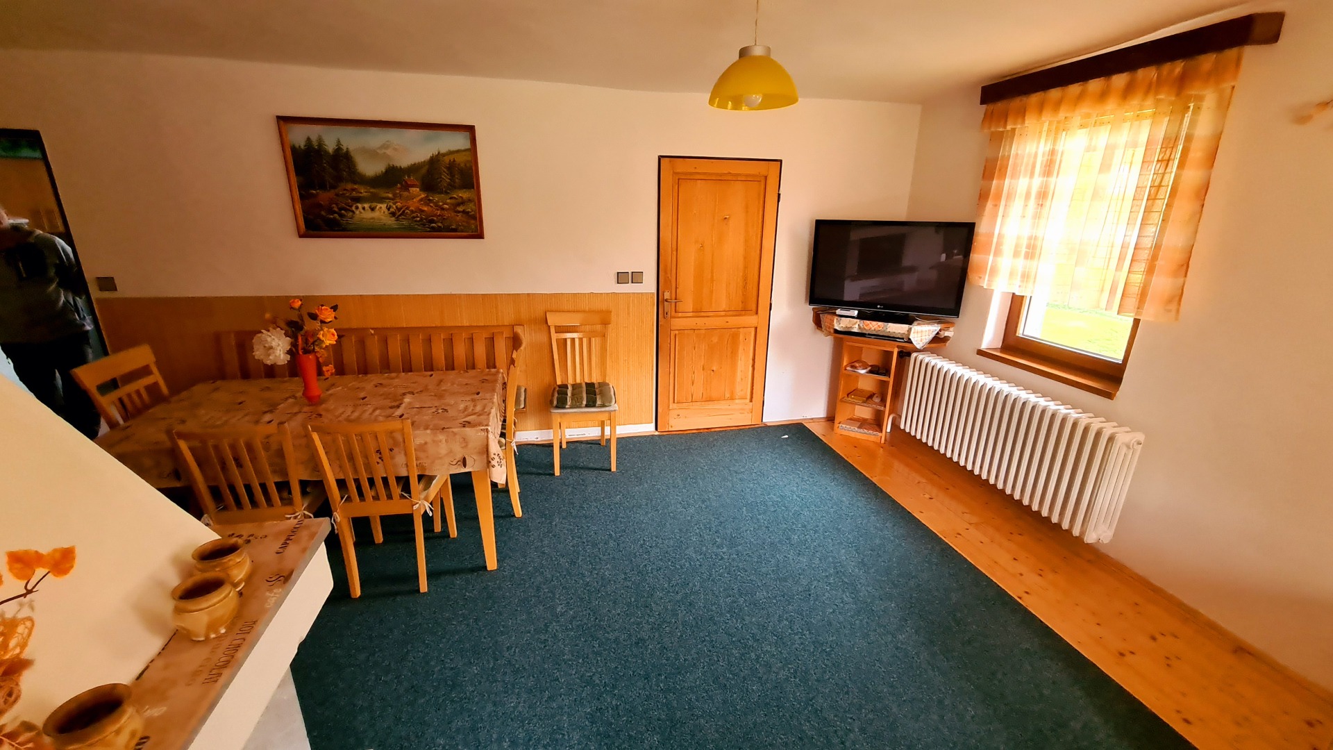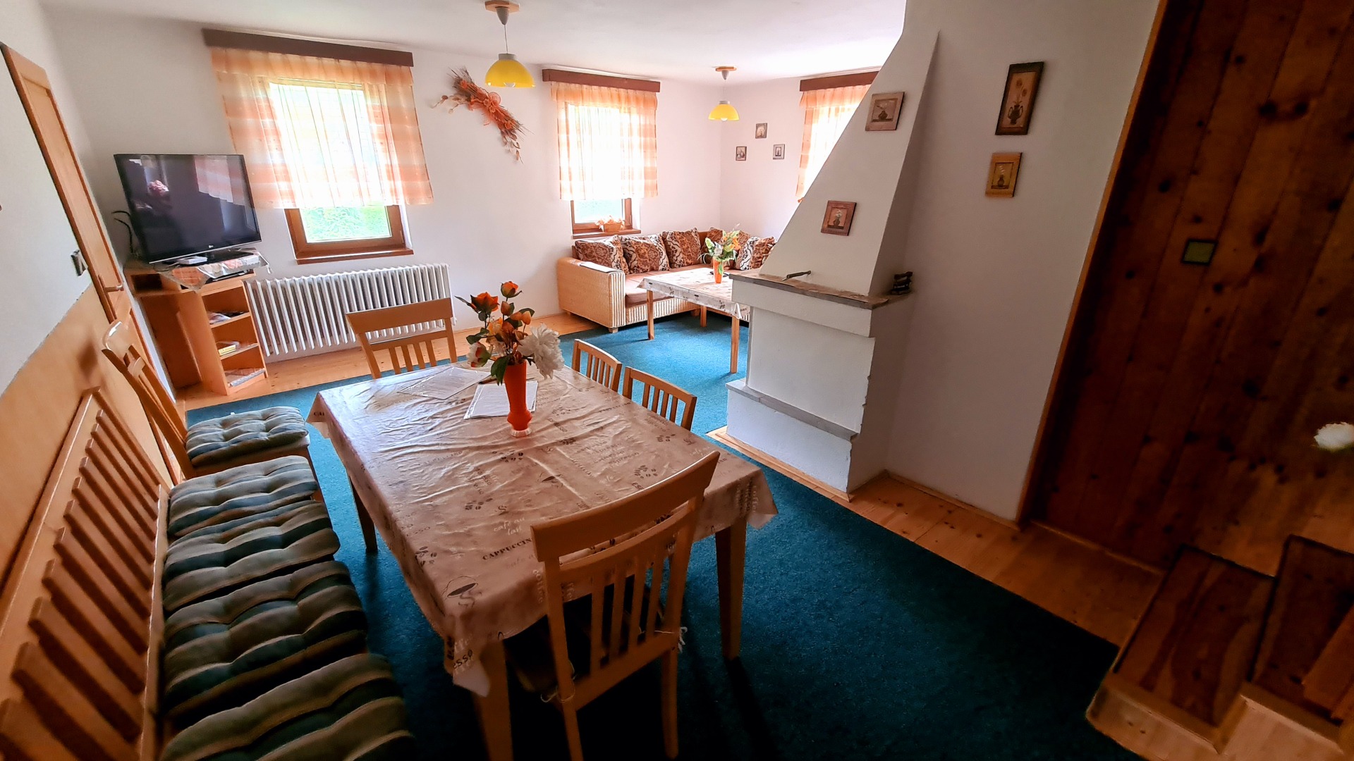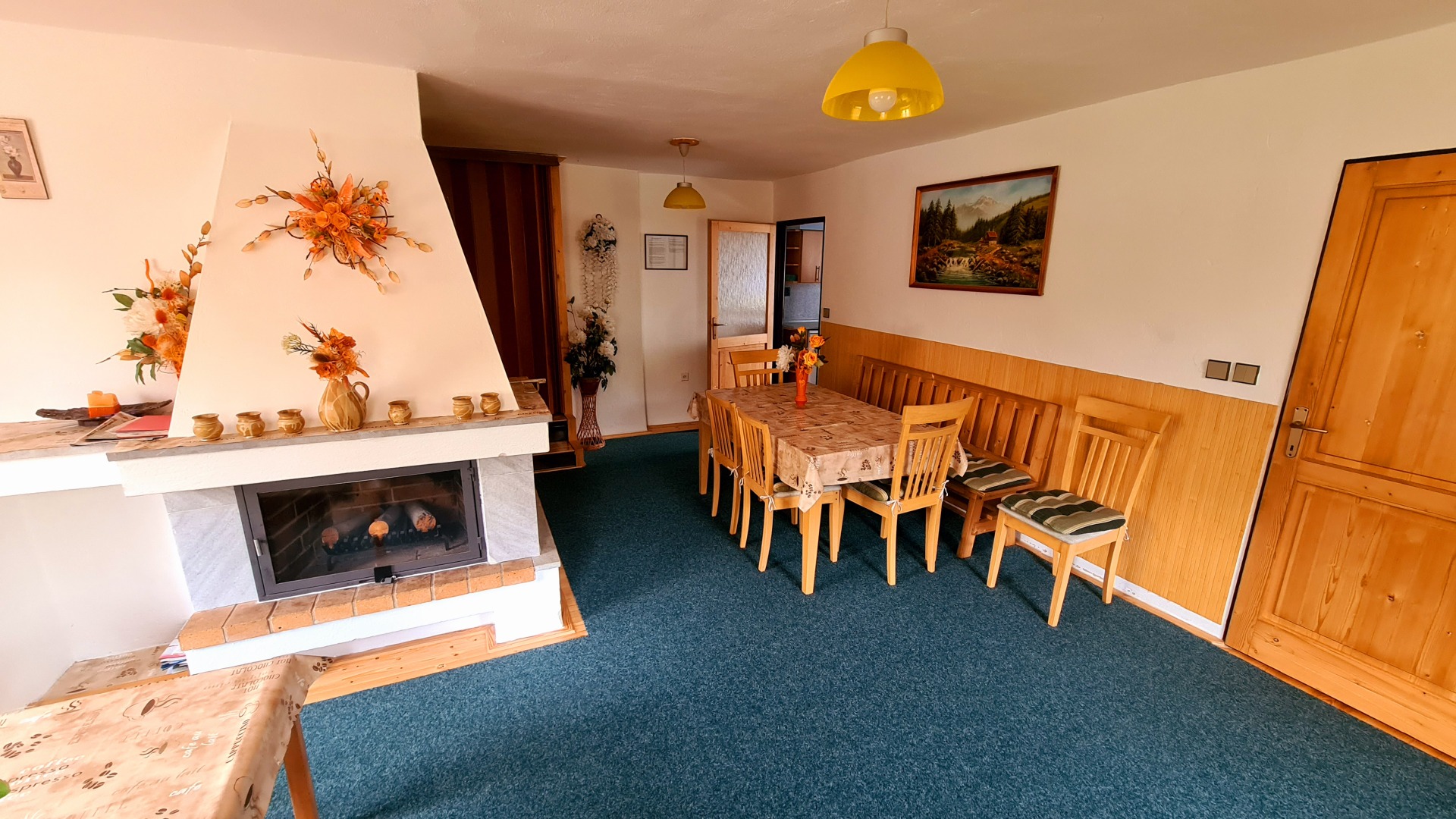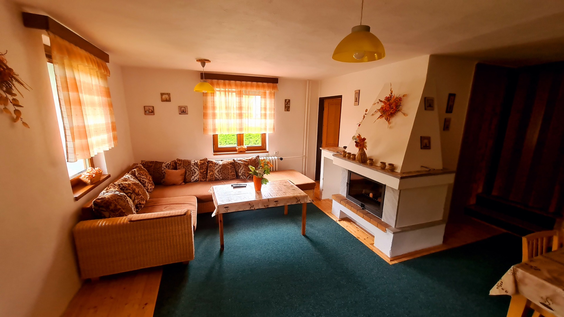 - obývací pokoj s krbem, LCD-SAT-DVD a jídelním stolem