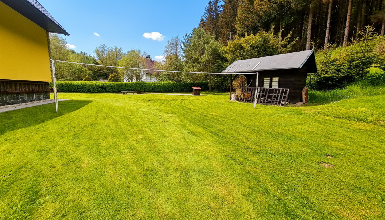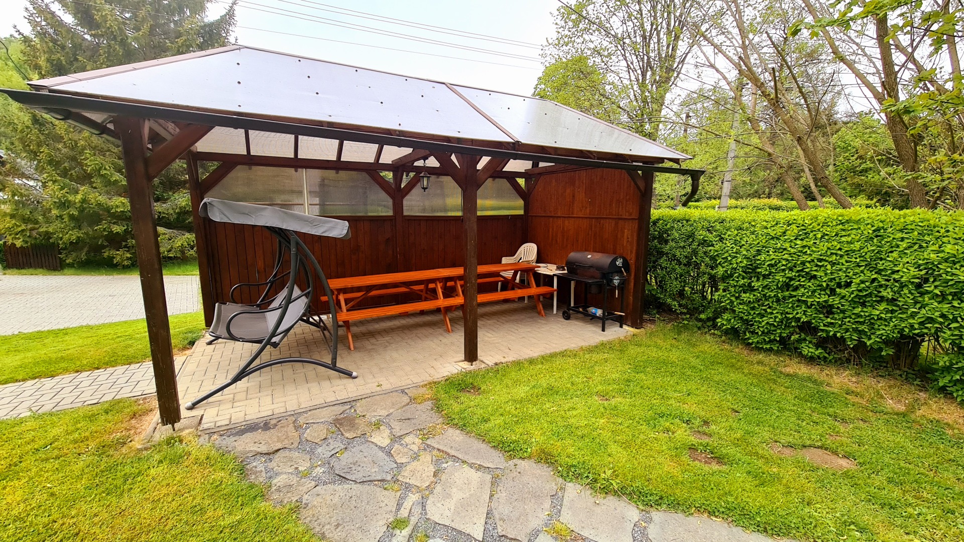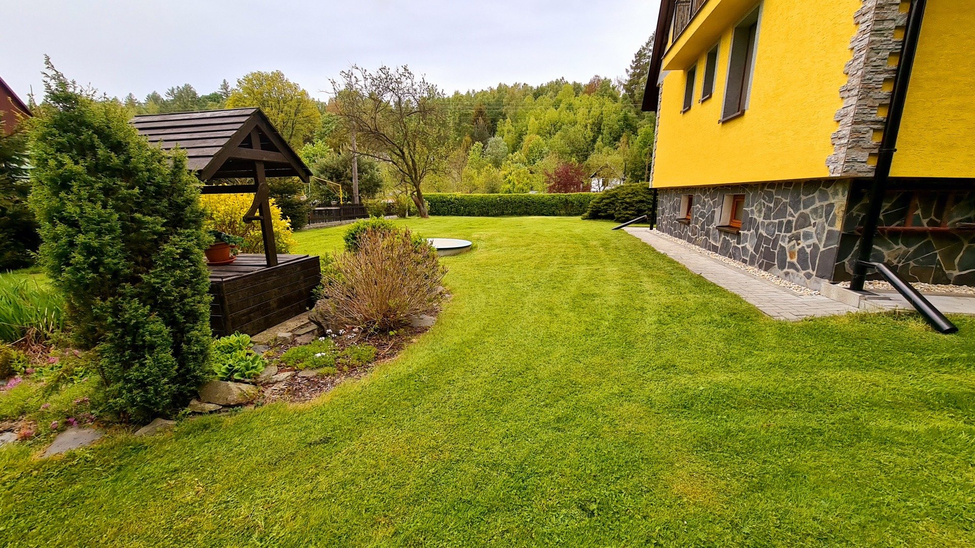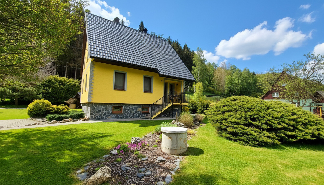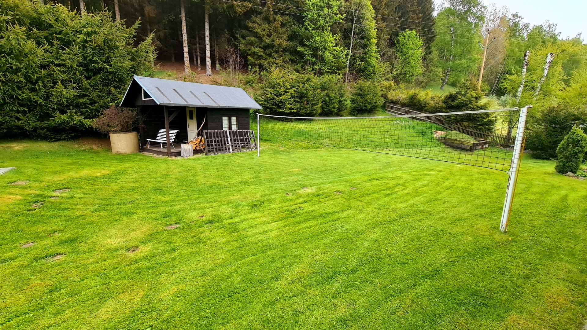 Atraktivní chata se solárně vyhřívaným bazénem, saunou a hernou u lesa, 2 km od Suché Rudné, 3 km od Andělské Hory a 8 km od lázní Karlova Studánka v Jeseníkách.