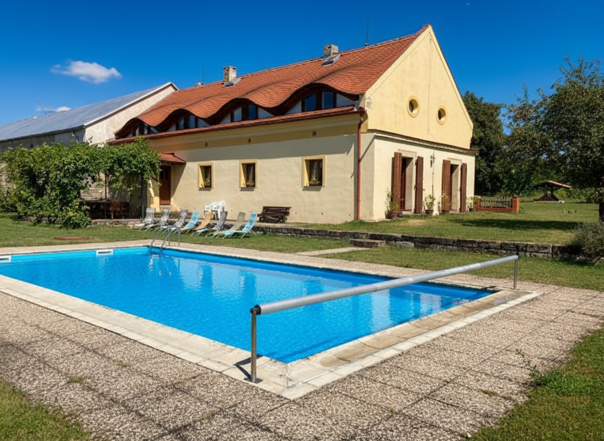 - venkovní zapuštěný bazén 5x11 m se slanou vodou (v provozu cca 20.6. - 10.9. - bazén nepravidelně užívá, bez narušení soukromí hostů, správce areálu statku)