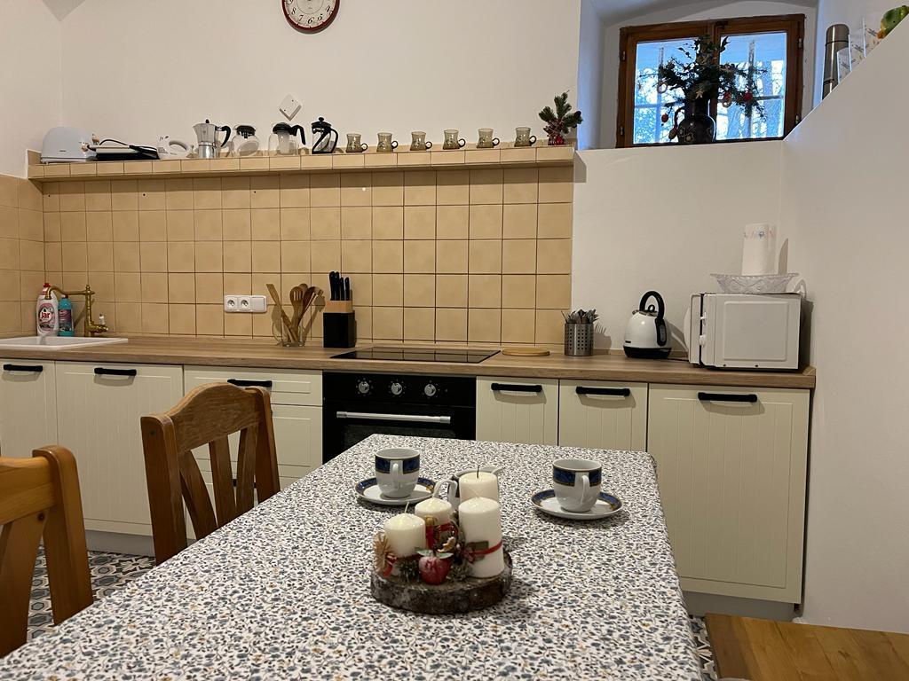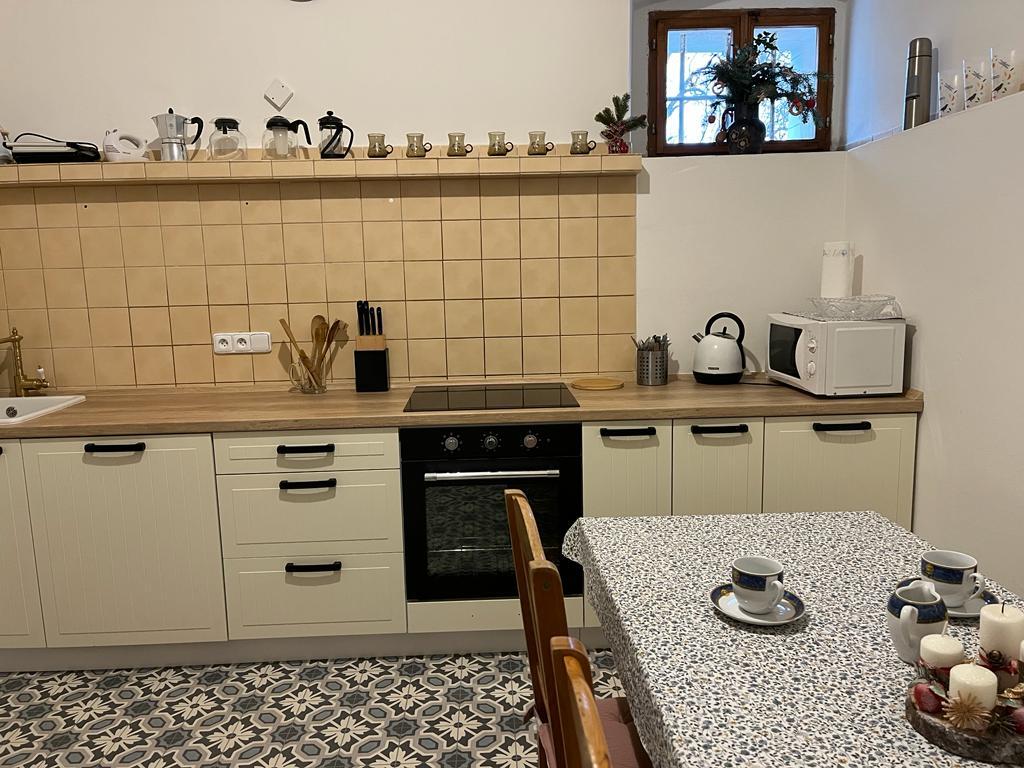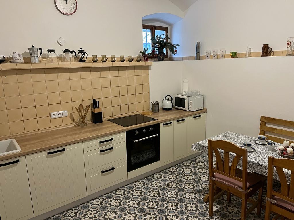 - kuchyně (el.sporák, lednička, mikrovlnná trouba, rychlovarná konvice) s posezením