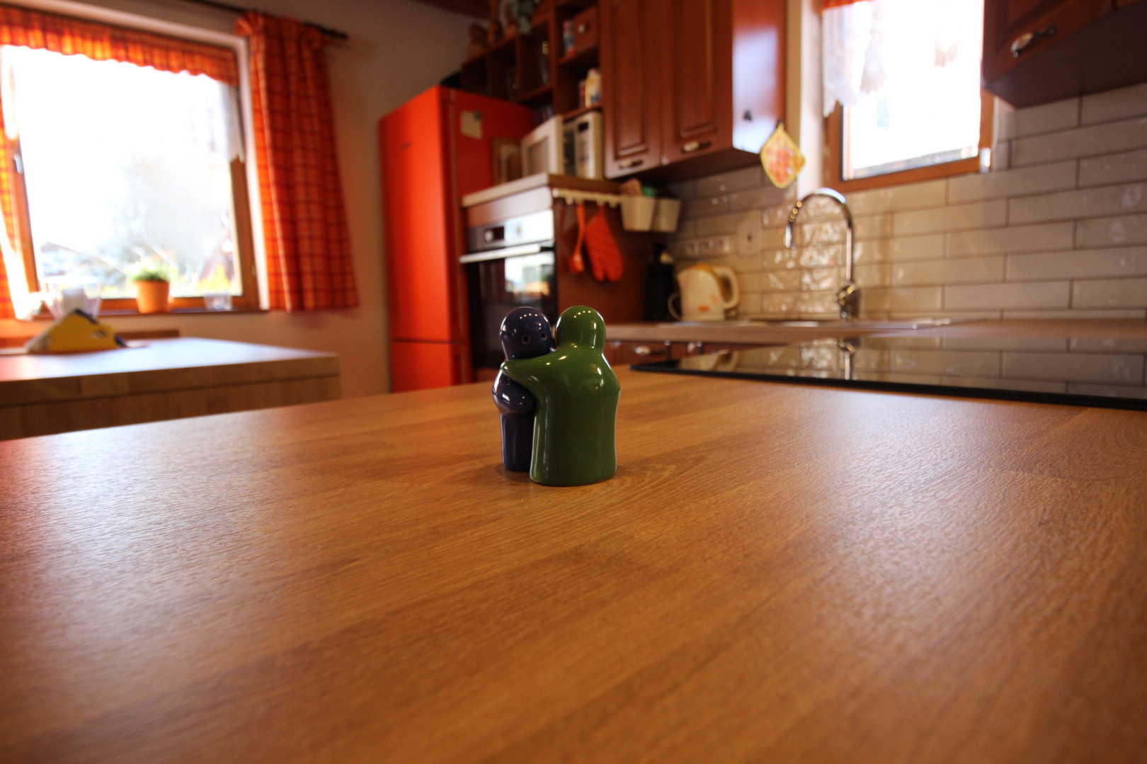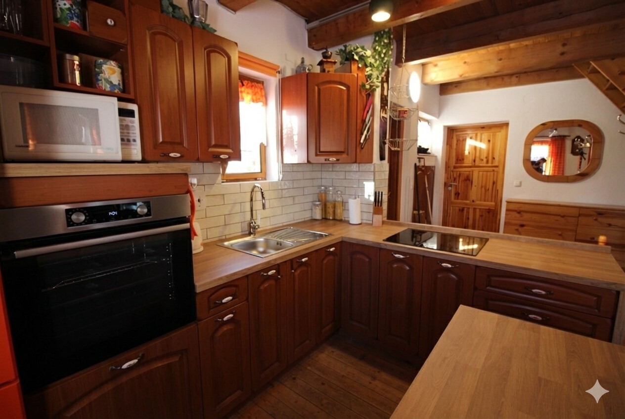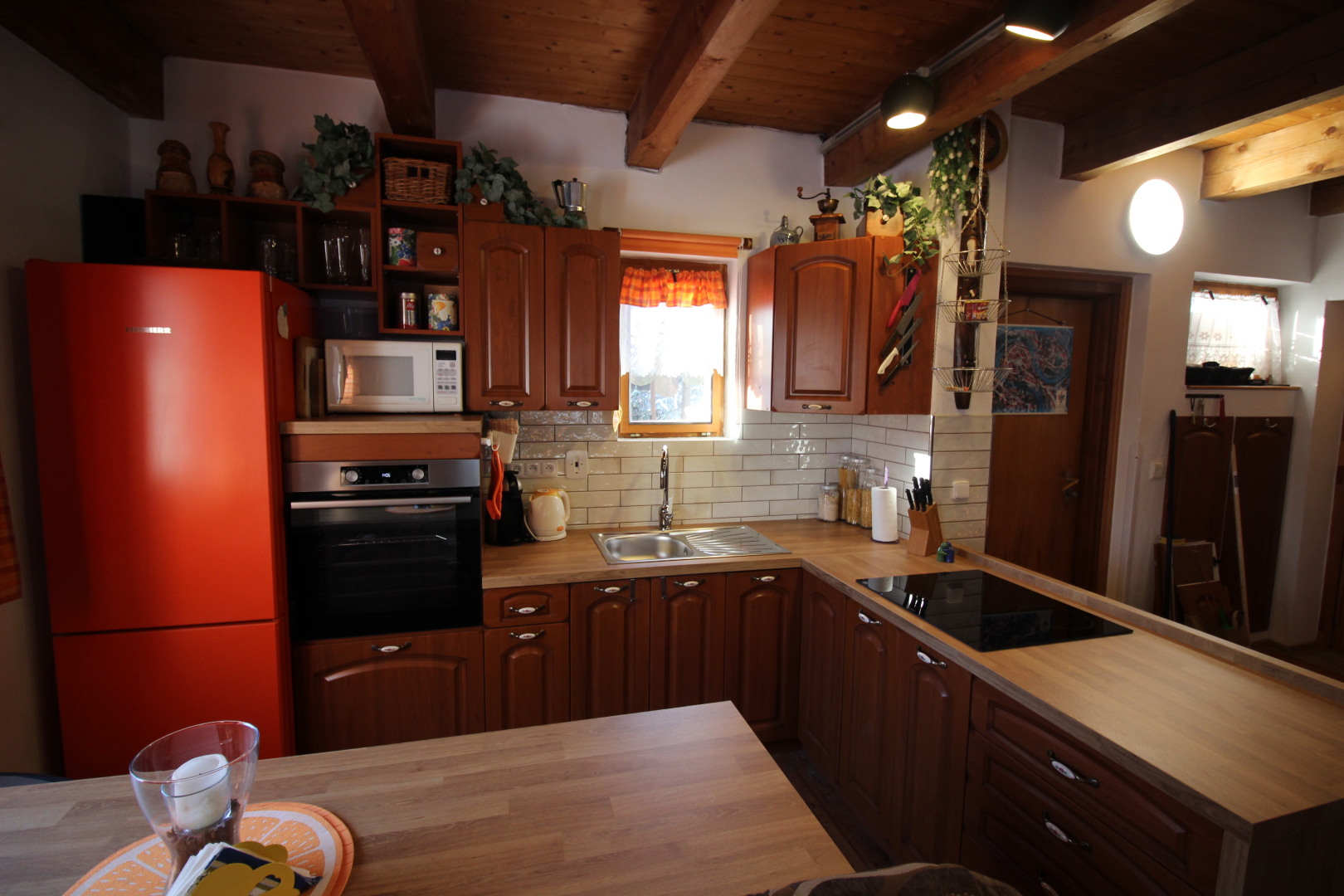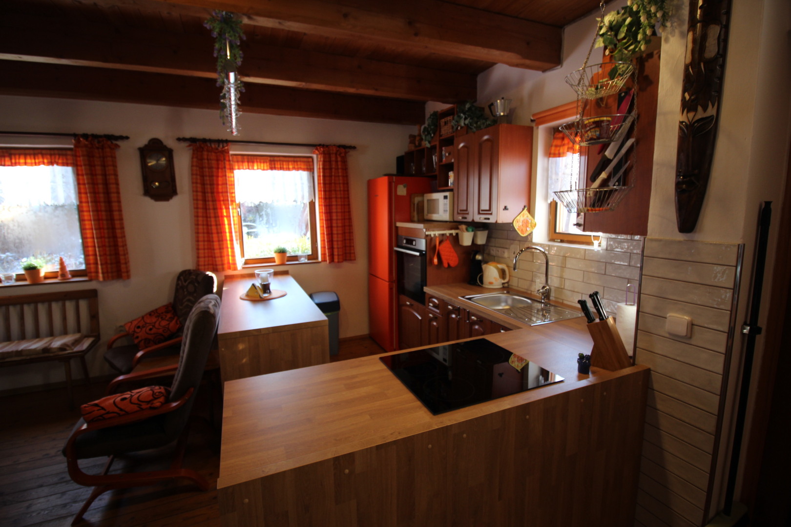 - kuchyně (sklokeramická deska s troubou, lednička s mrazákem, mikrovlnná trouba, rychlovarná konvice, kávovar) s posezením v obývacím pokoji s krbovými kamny a TV