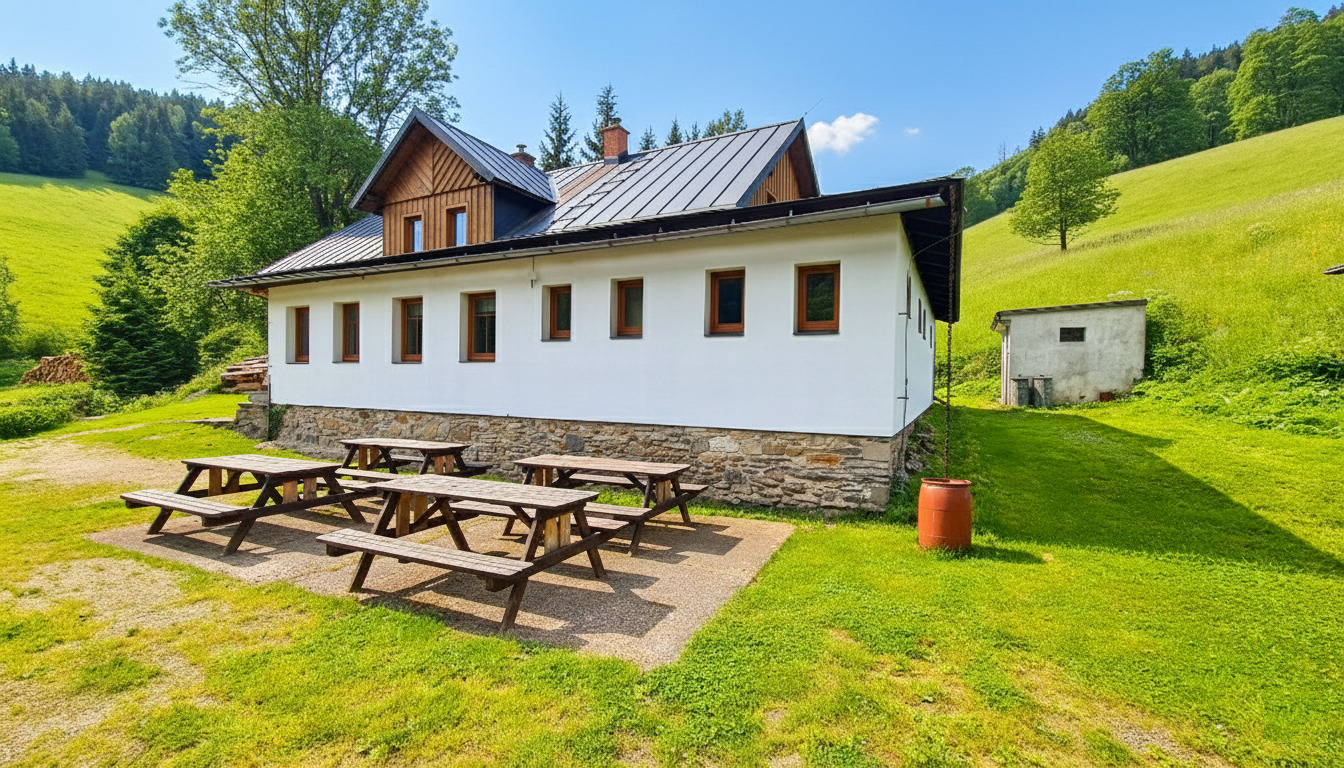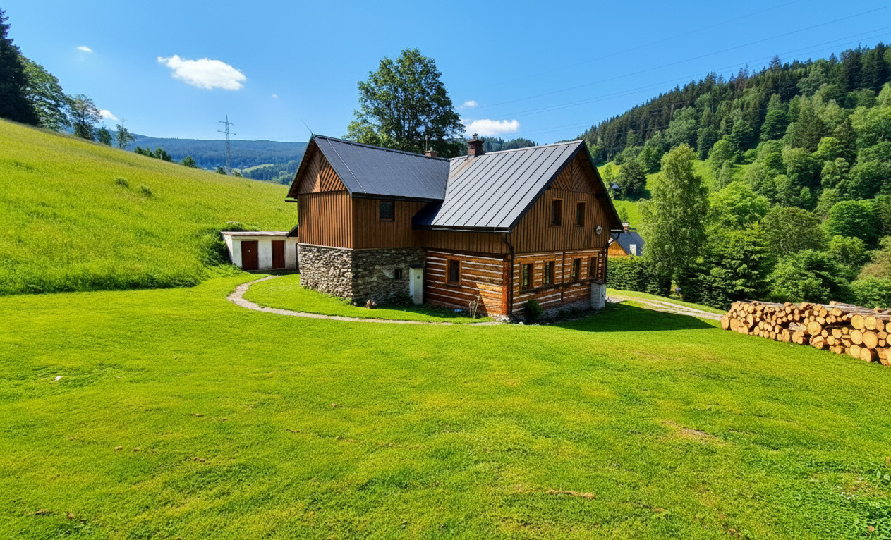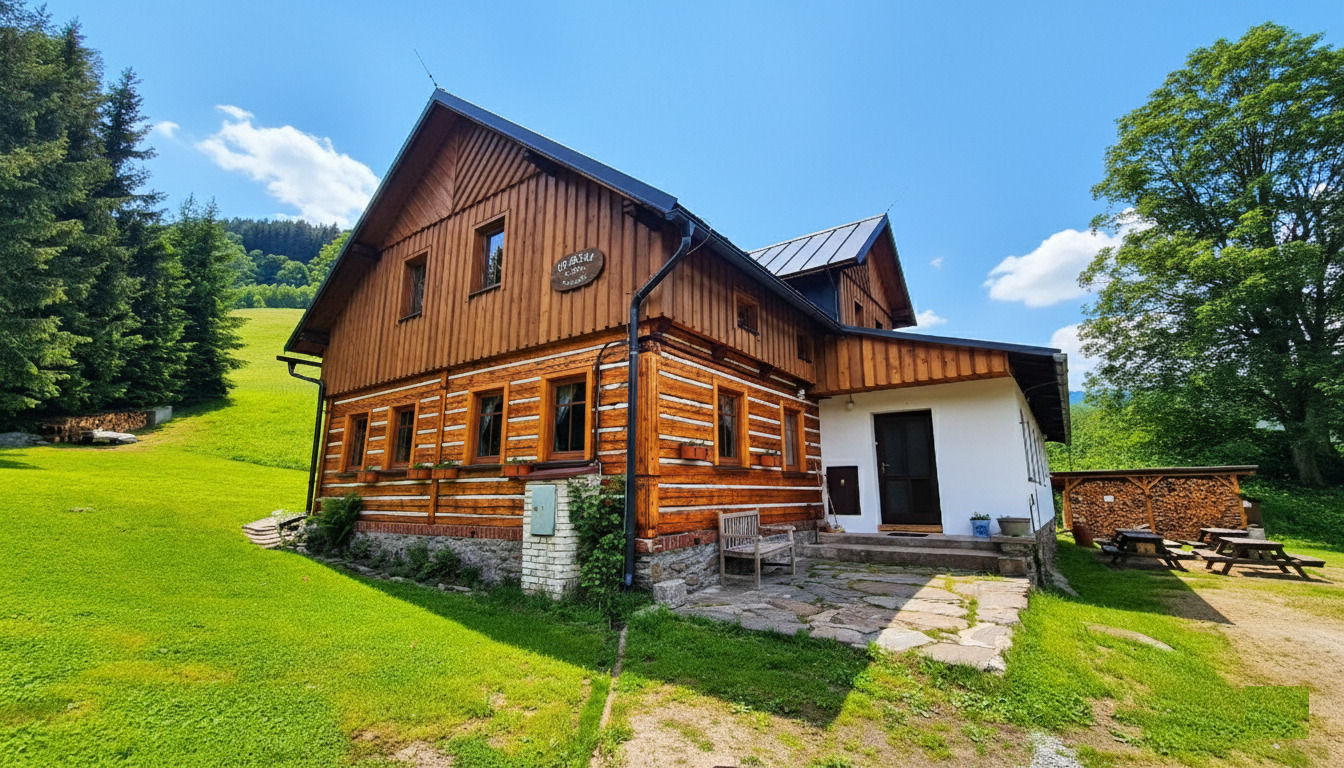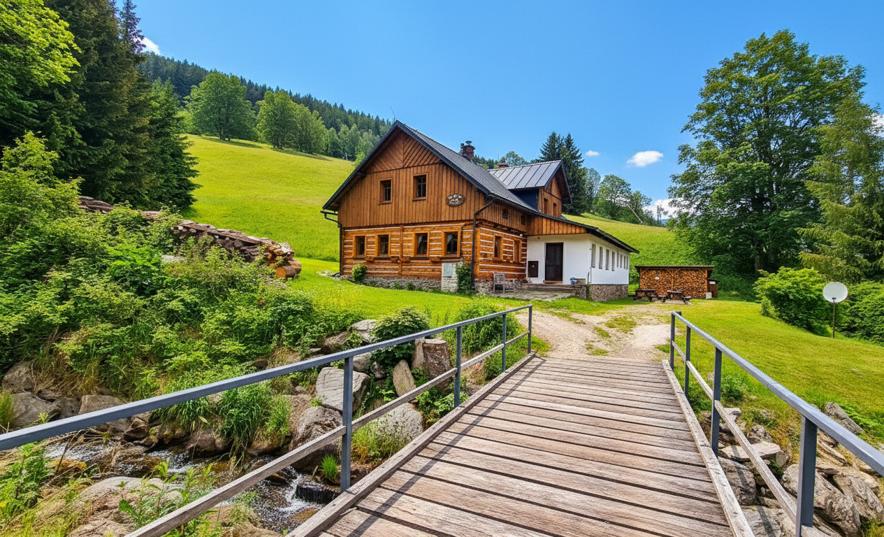 Velká oblíbená krkonošská chalupa se saunou na polosamotě u lesa a horského potoka, 50 m od lyžařského vleku, 1 km od lyžařského areálu Velká Úpa a 5 km od SKI areálu Pec pod Sněžkou v Krkonoších.