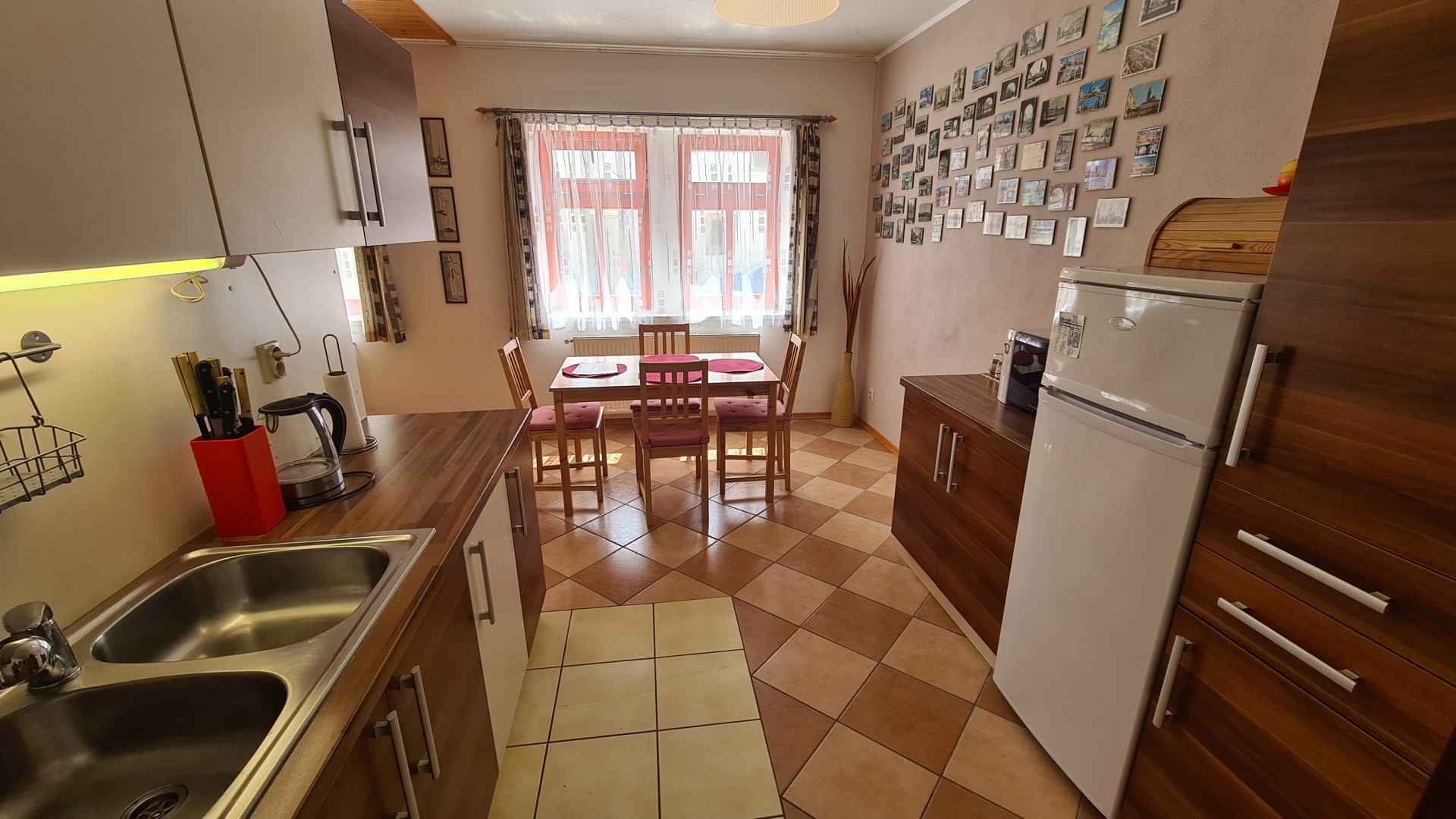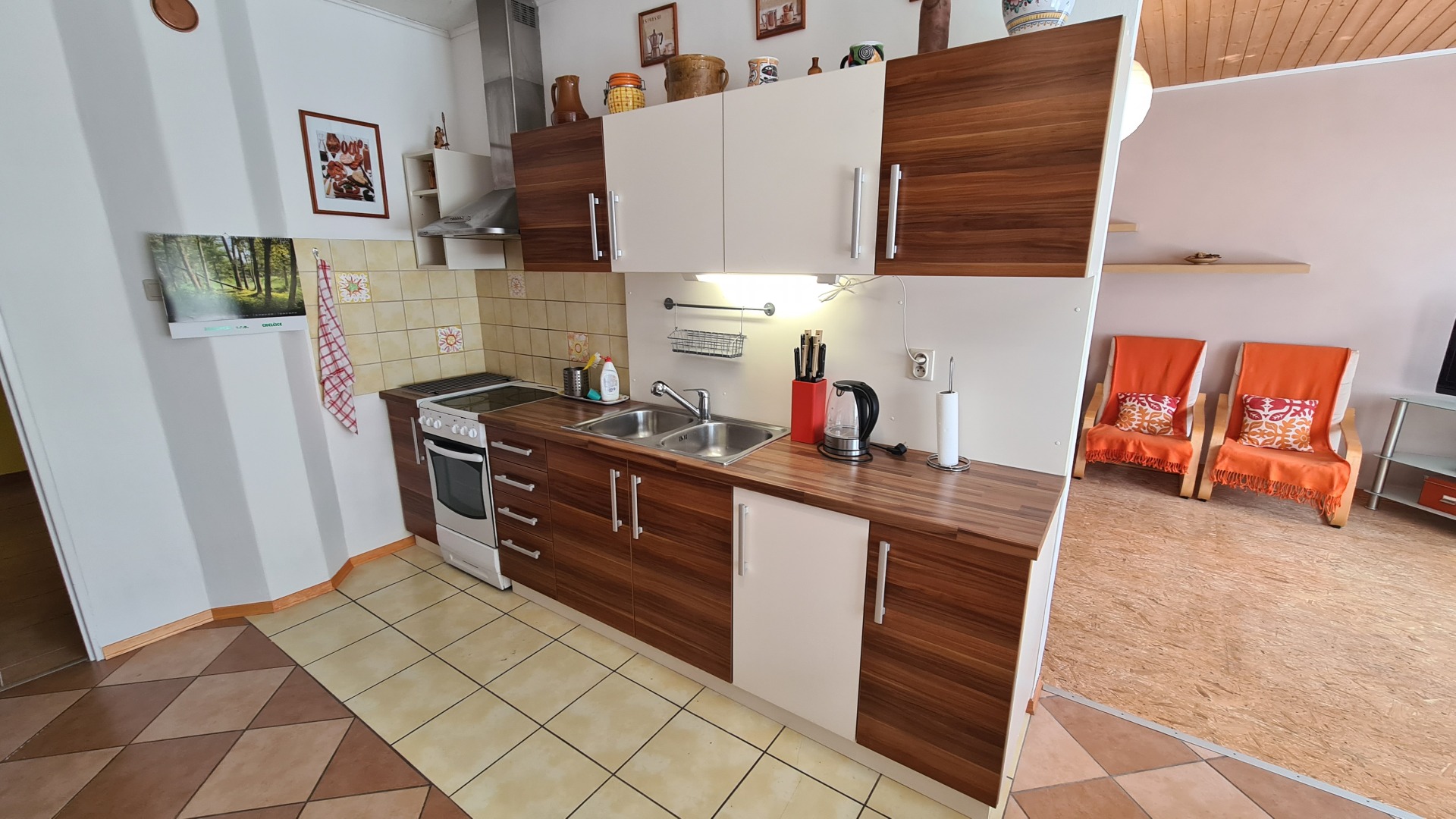 - kuchyňka (el. sporák s troubou, lednička s mrazákem, mikrovlnná trouba, rychlovarná konvice) s jídelním stolem