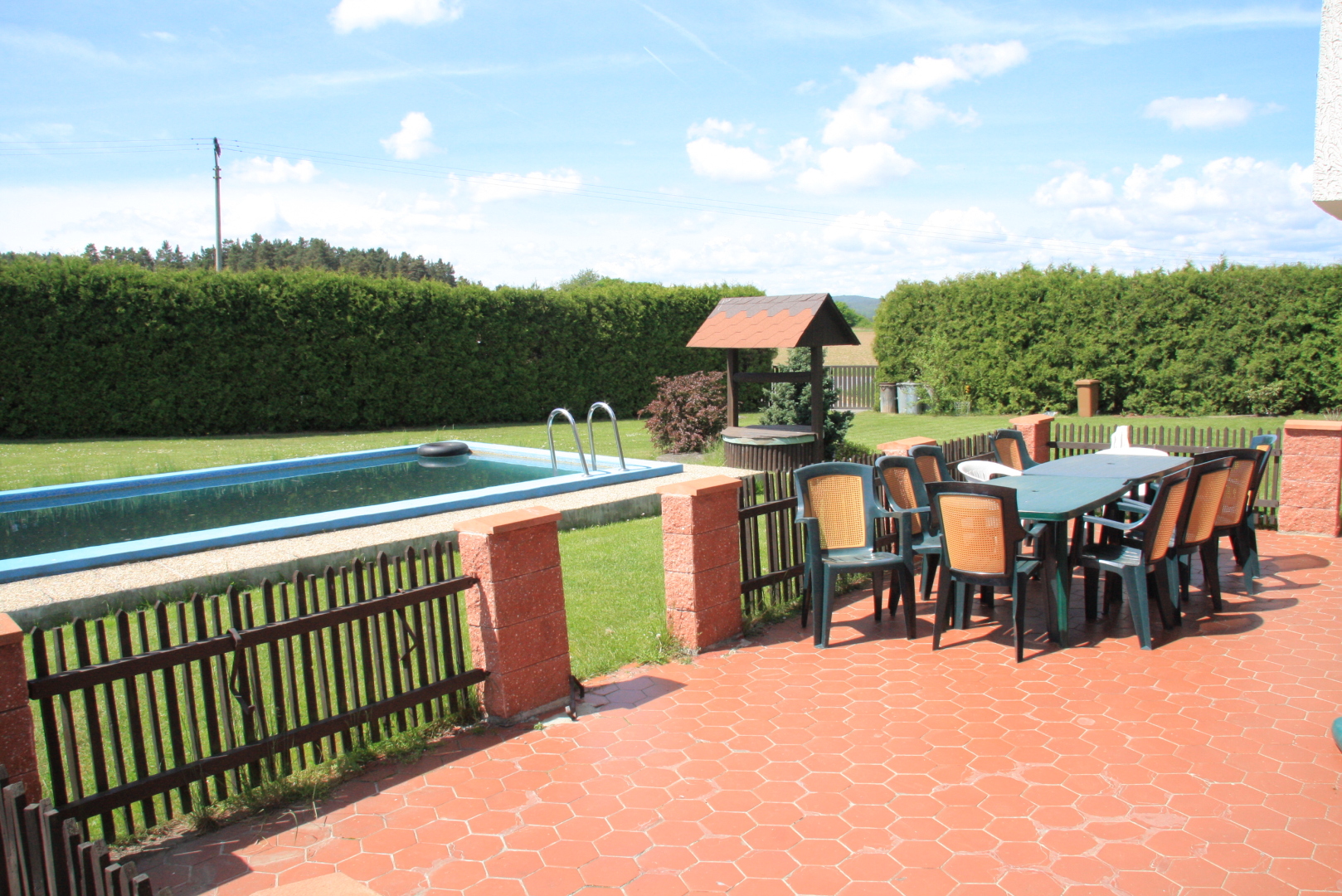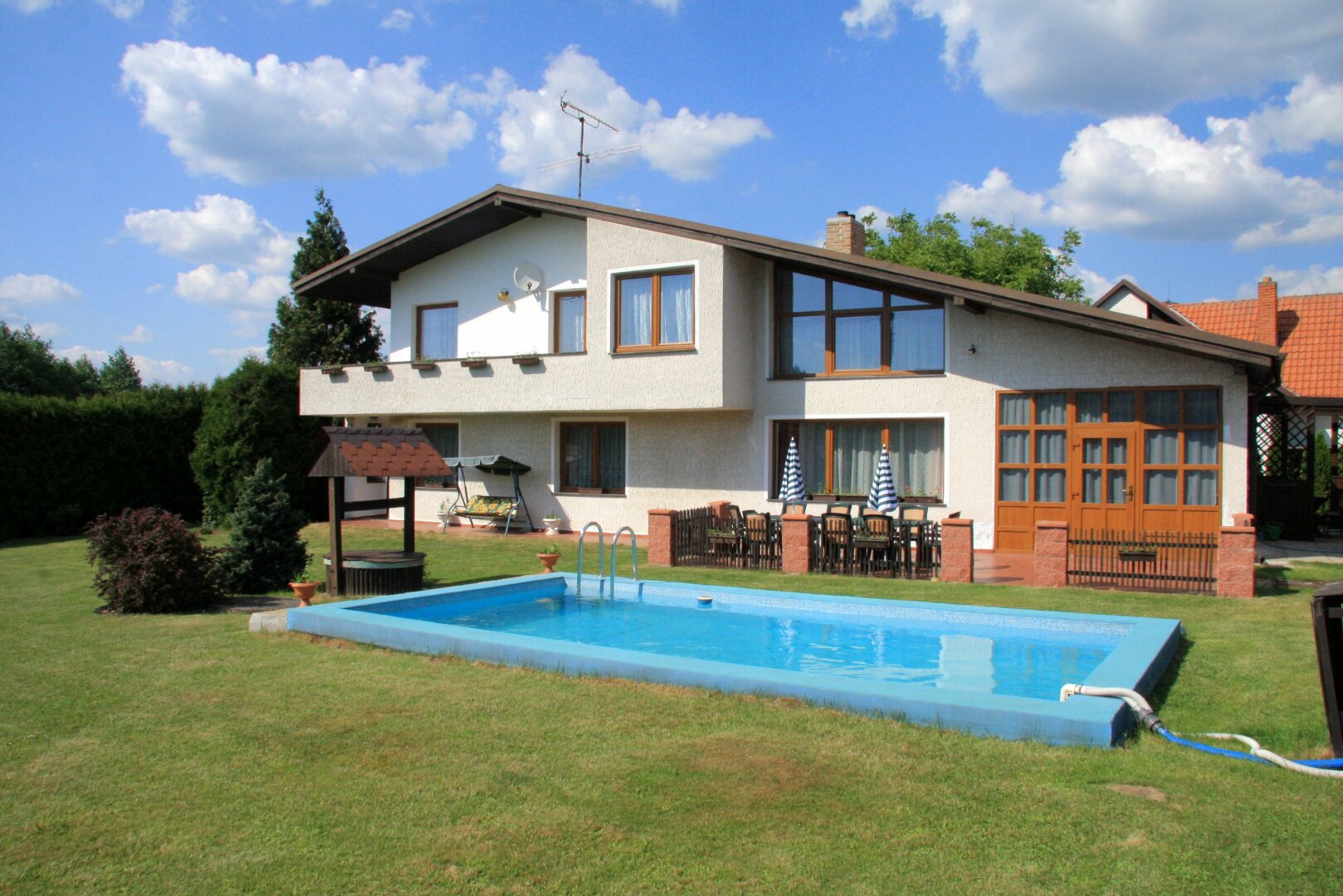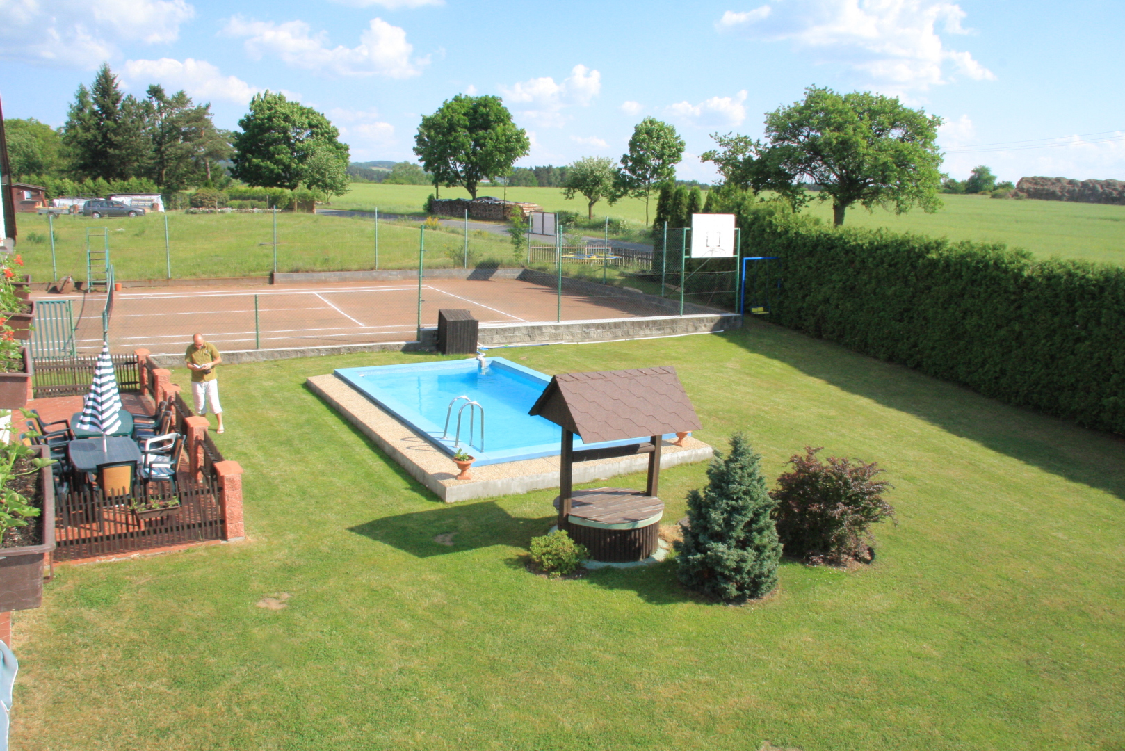 Velmi atraktivní prostorný rekreační domek s venkovním zapuštěným bazénem a tenisovým kurtem, 3 km od vodní nádrže Orlík a 25 km od Zvíkovského Podhradí v jižních Čechách.