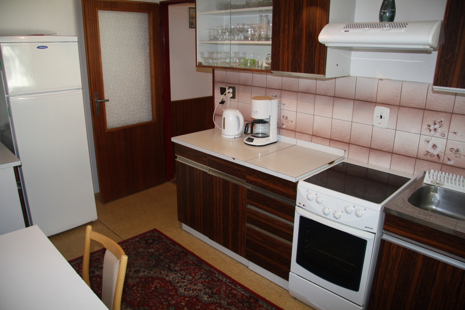 - kuchyně (el. sporák s troubou, 2x lednička, mrazící box, mikrovlnná trouba, rychlovarná konvice, kávovar, toustovač) s posezením