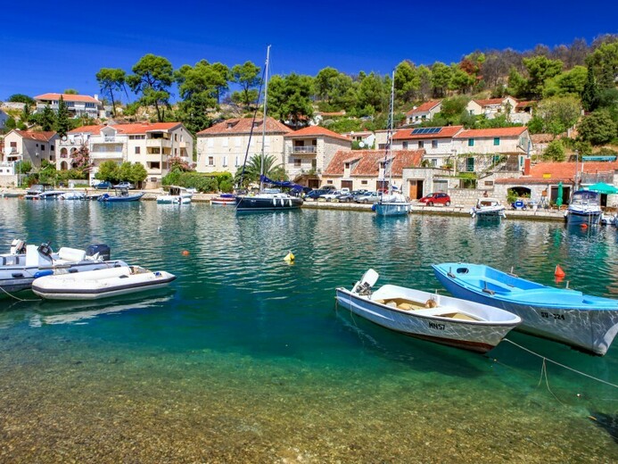 Velmi pěkný apartmán se zastřešenou terasou s výhledem na zátoku, 400 m od oblázkové pláže na ostrově Brač v Chorvatsku.