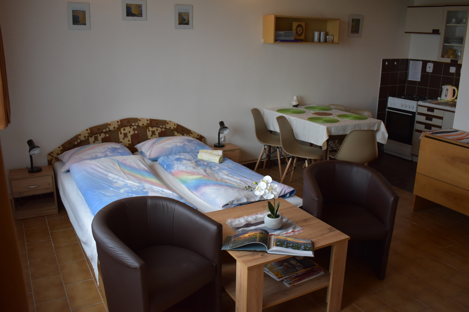 - z przestronnym salonem z aneksem kuchennym (lodówka, kuchenka, kuchenka mikrofalowa, czajnik elektryczny, ekspres do kawy) i 3 łóżka