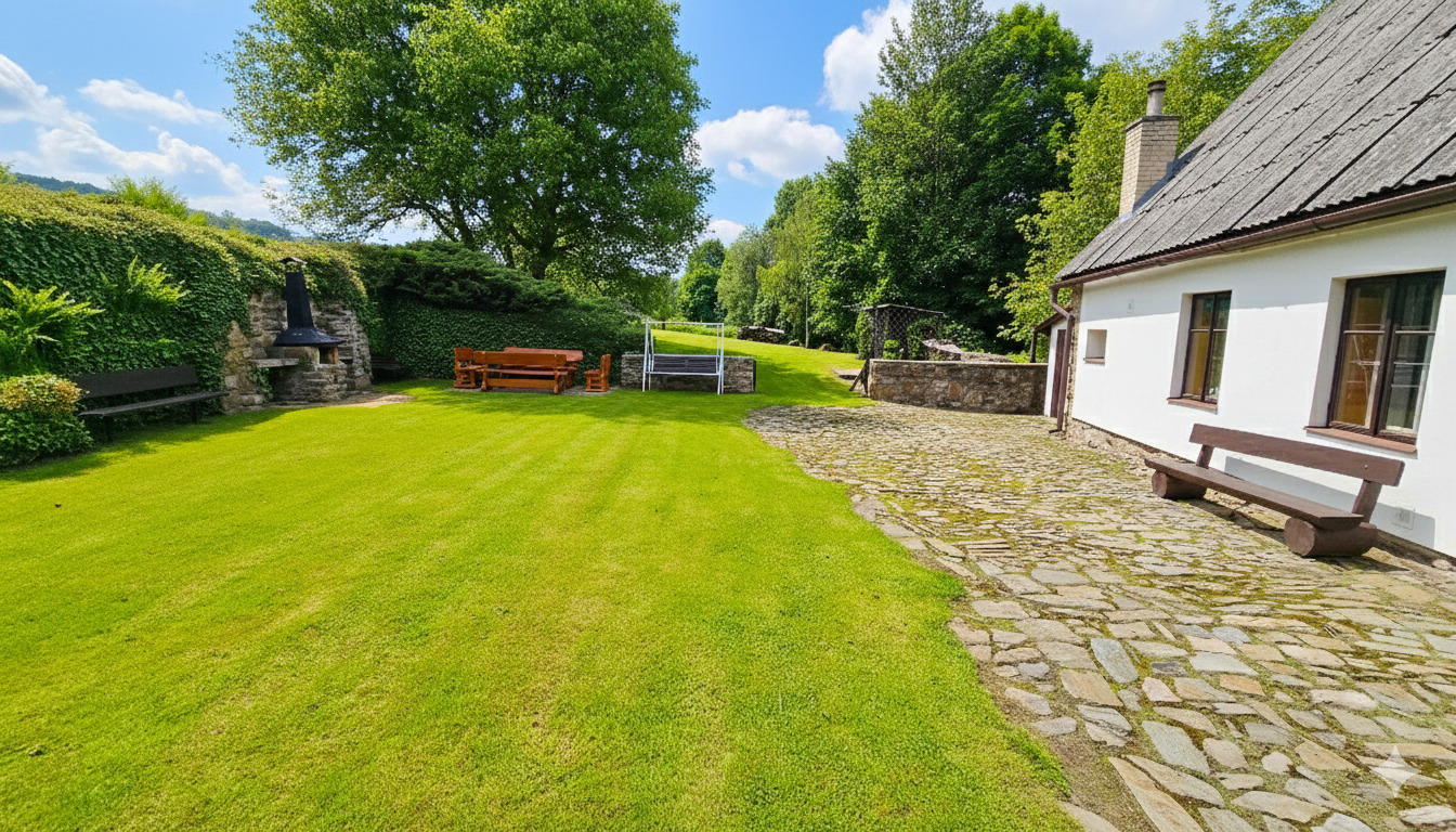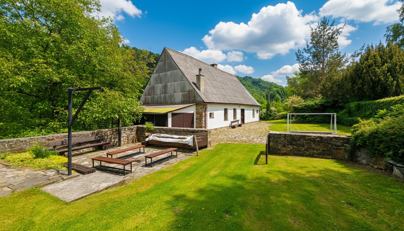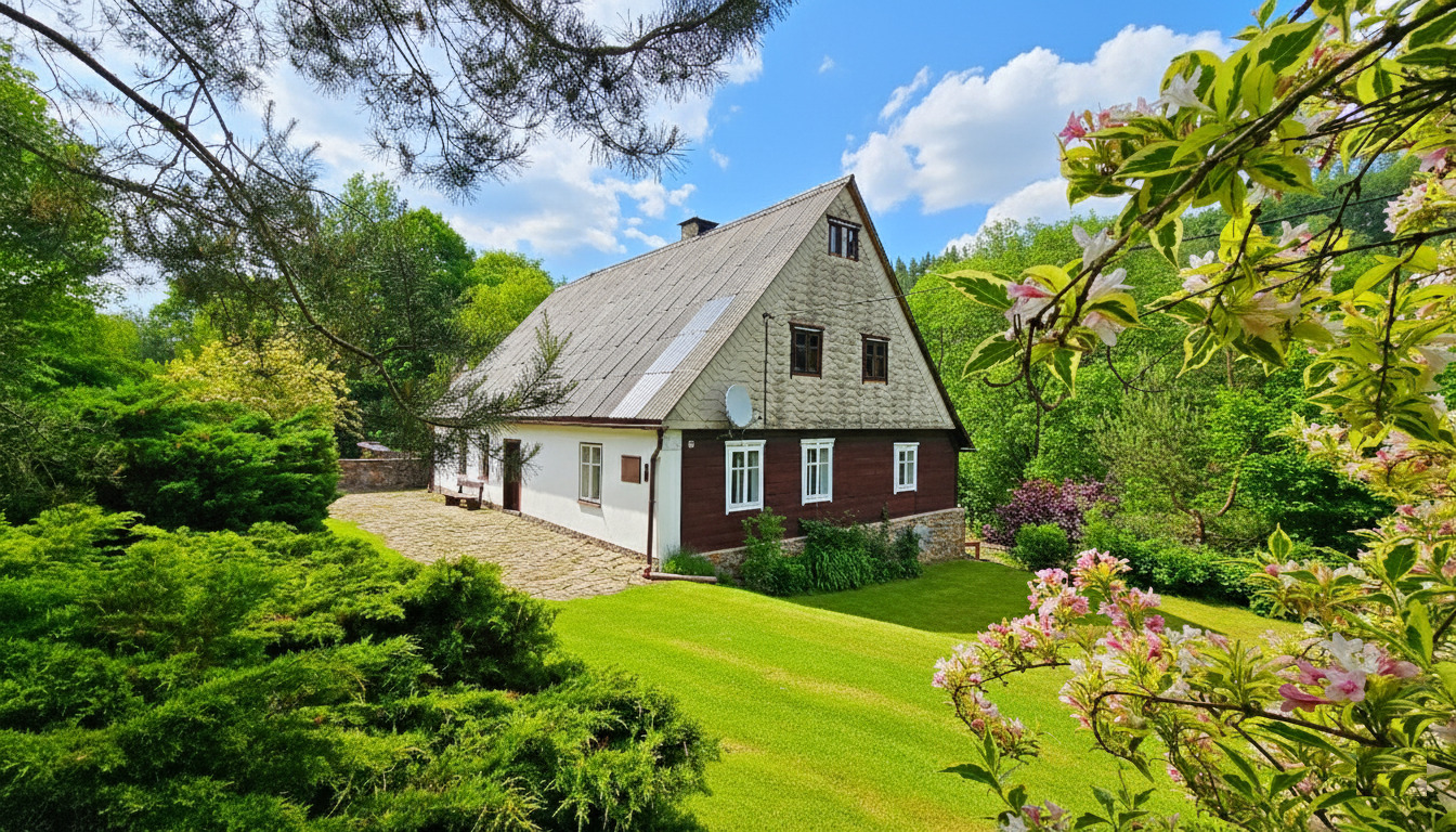 Duży atrakcyjny domek w stylu myśliwskim z zadaszoną werandą z basenem w pobliżu lasu i potoku w miejscowości Dolni Udoli, 400 m od wyciągu narciarskiego, 5 km od Zlate Hory w górach Jesioniki.