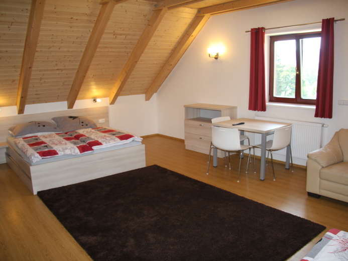Luksusowo urządzone 2 osobowe pokoje z dostawkami, telewizor LCD oraz łazienkę (z prysznicem i WC). Na 6 pokoi razem wyposażona kuchnia (płyta ceramiczna, lodówka, kuchenka mikrofalowa, czajnik elektryczny, toster) z miejscami do siedzenia. Każdy apartament posiada aneks kuchenny (płyta ceramiczna, lodówka, kuchenka mikrofalowa, czajnik elektryczny, toster) w salonie z LCD-SAT, 4 łóżkami i dostawką, łazienka z prysznicem i WC. Często: bar pokój z LCD-SAT, jadalnia (ogród zimowy) z LCD-SAT, piłkarzyki, sauna (za dodatkową opłatą) z miejscem na odpoczynek i prysznicem, z nowoczesną suszarką do butów narciarskich. Otwarta przestrzeń, zadaszony basen 7x4 m, z leżakami i prysznic w ogrodzie, oddzielny dom ogród (salon) z barem z kranu pokoju, mikrofalówka, kominek, telewizor LCD i część wypoczynkową, plac zabaw dla dzieci (piaskownica, trampolina). Parking przy obiekcie (8 sztuk), zwierzęta dozwolone. Internet WIFI. W budynku nie wolno palić.