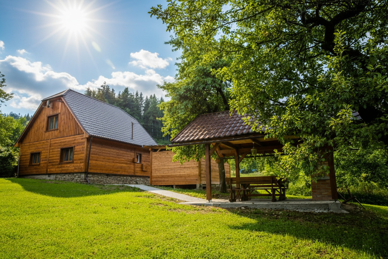 Stil-Holzferienhaus am Bach im Tal am Rande der Gemeinde Karolinka in Beskiden.